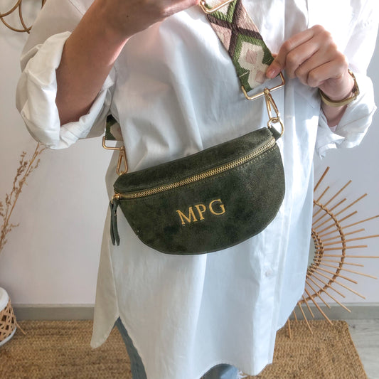 Riñonera/bandolera serraje caqui iniciales bordadas correa étnica