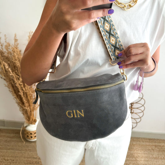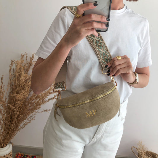 Riñonera/bandolera serraje taupe iniciales bordadas correa étnica