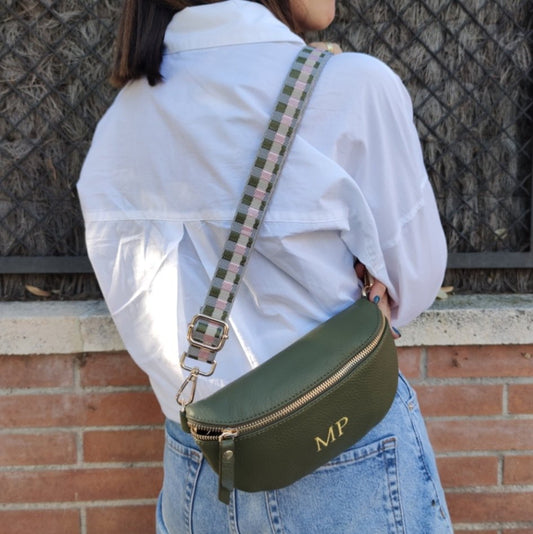 Riñonera/bandolera piel caqui iniciales bordadas correa étnica