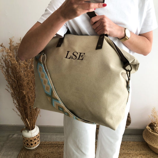Bolso caqui loneta iniciales bordadas con correa étnica