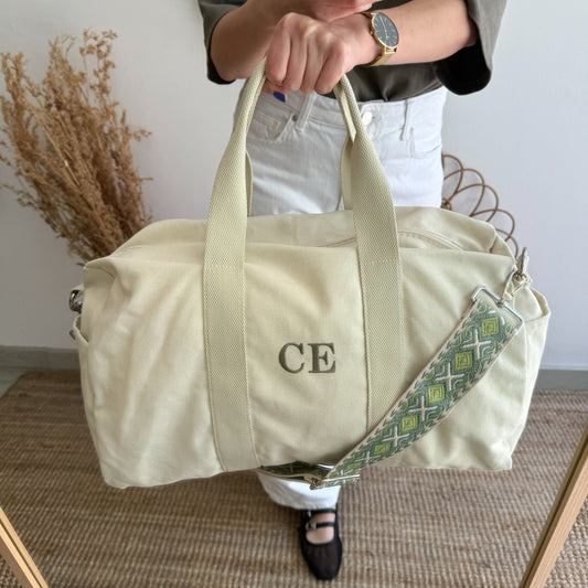 Bandolera loneta taupe iniciales bordadas con correa étnica