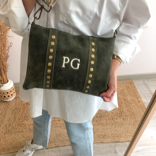 Bolso bandolera tachuelas serraje iniciales bordadas caqui