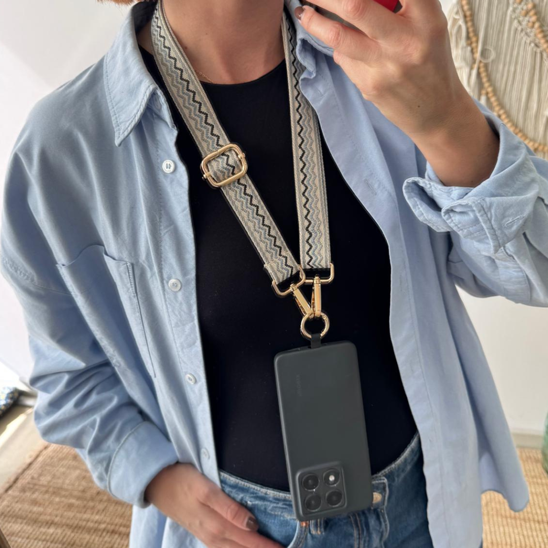 Correa fina de diferentes estampados. con enganche y argolla para poder colgar del móvil.