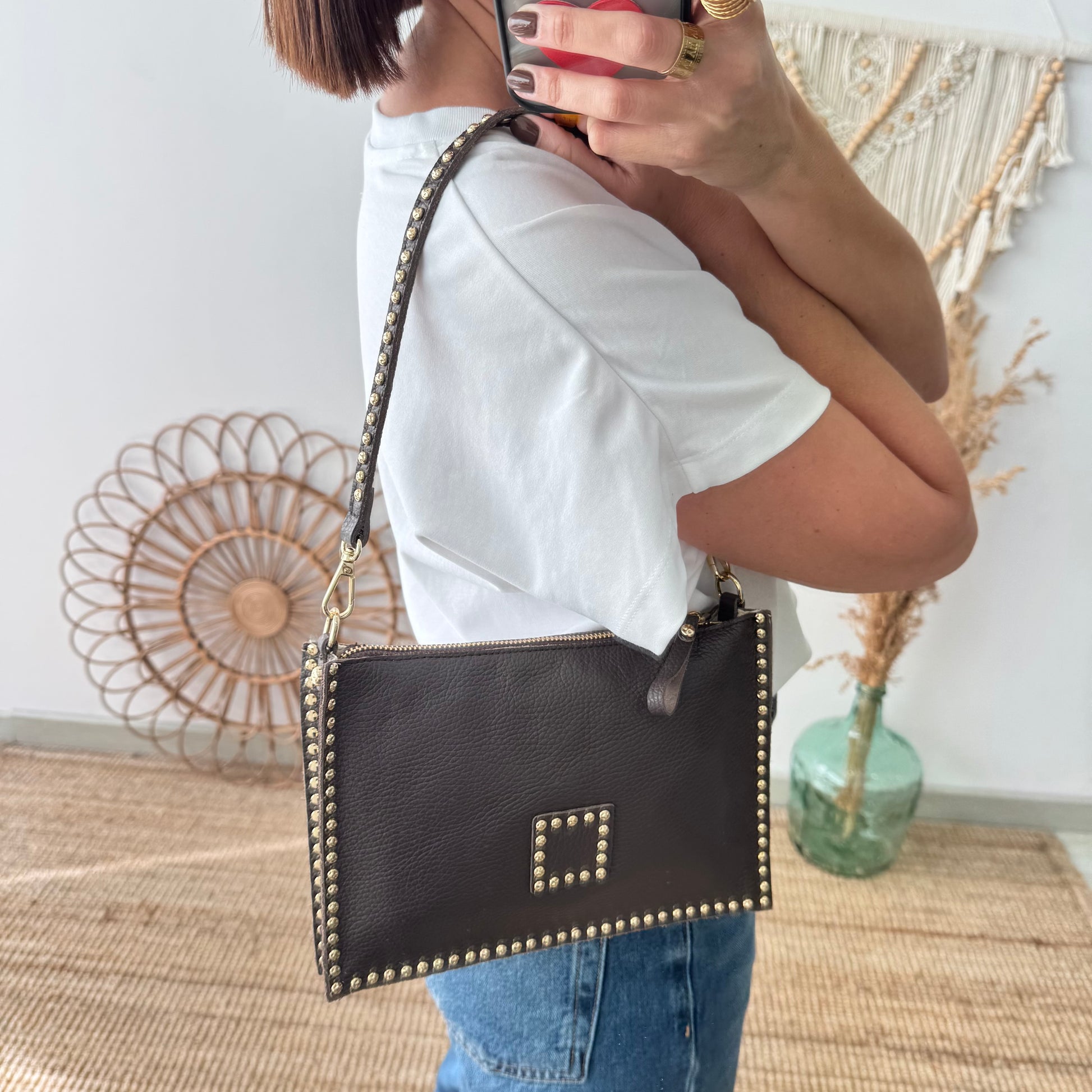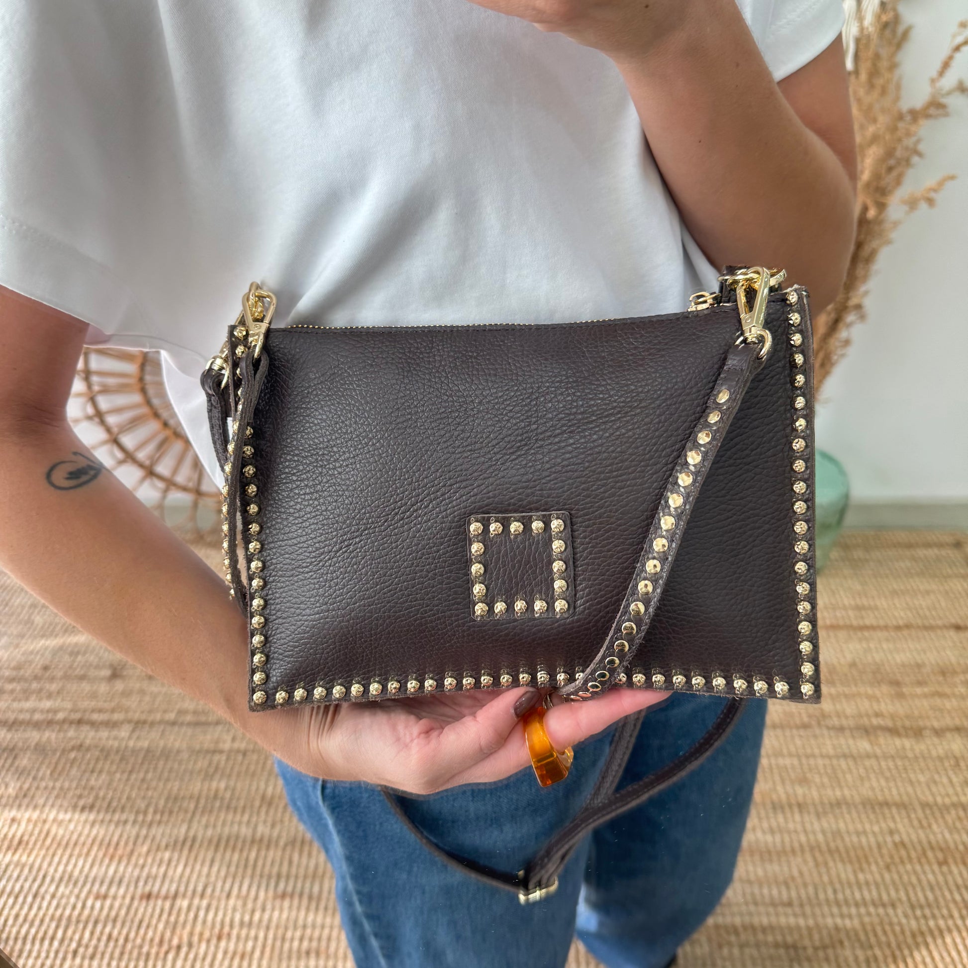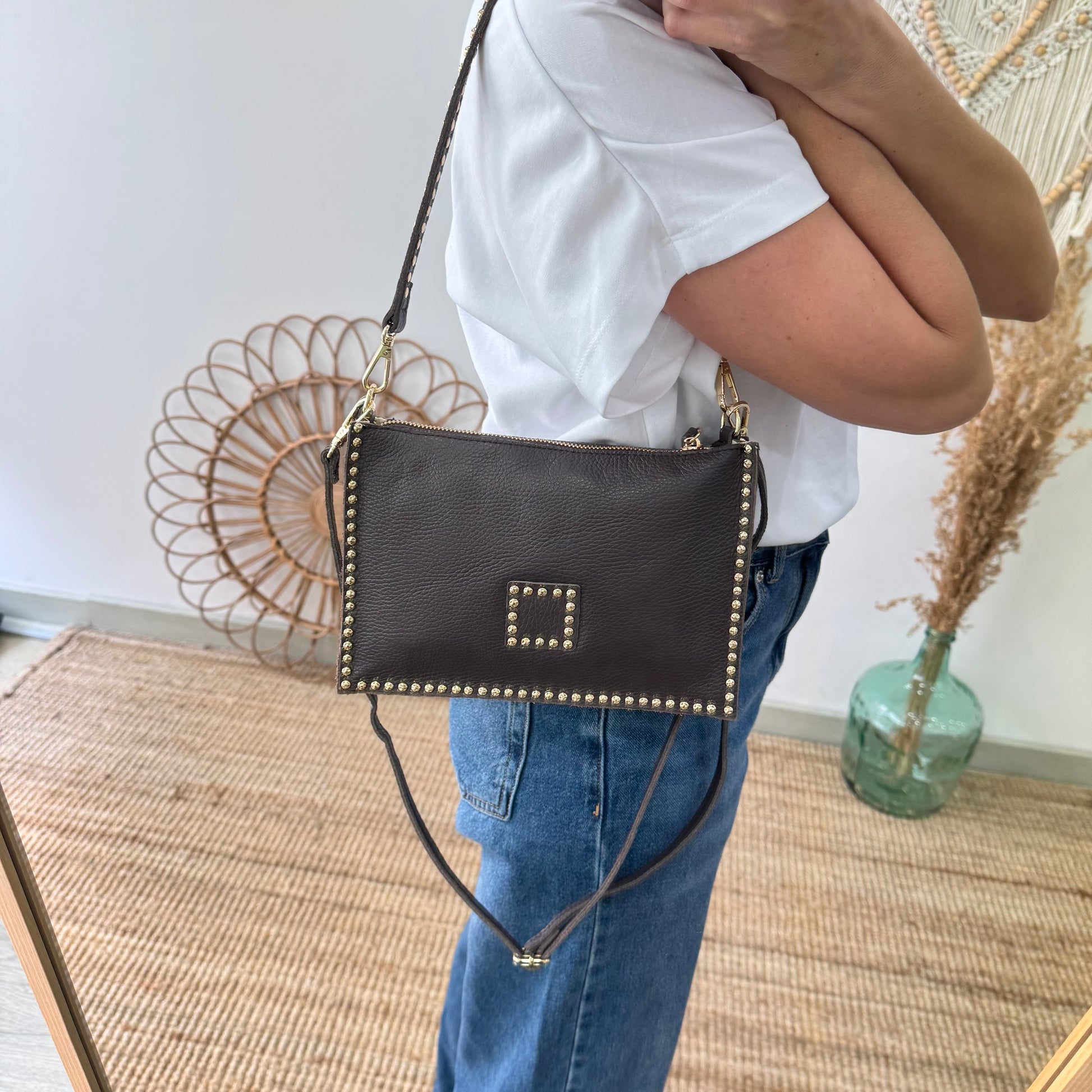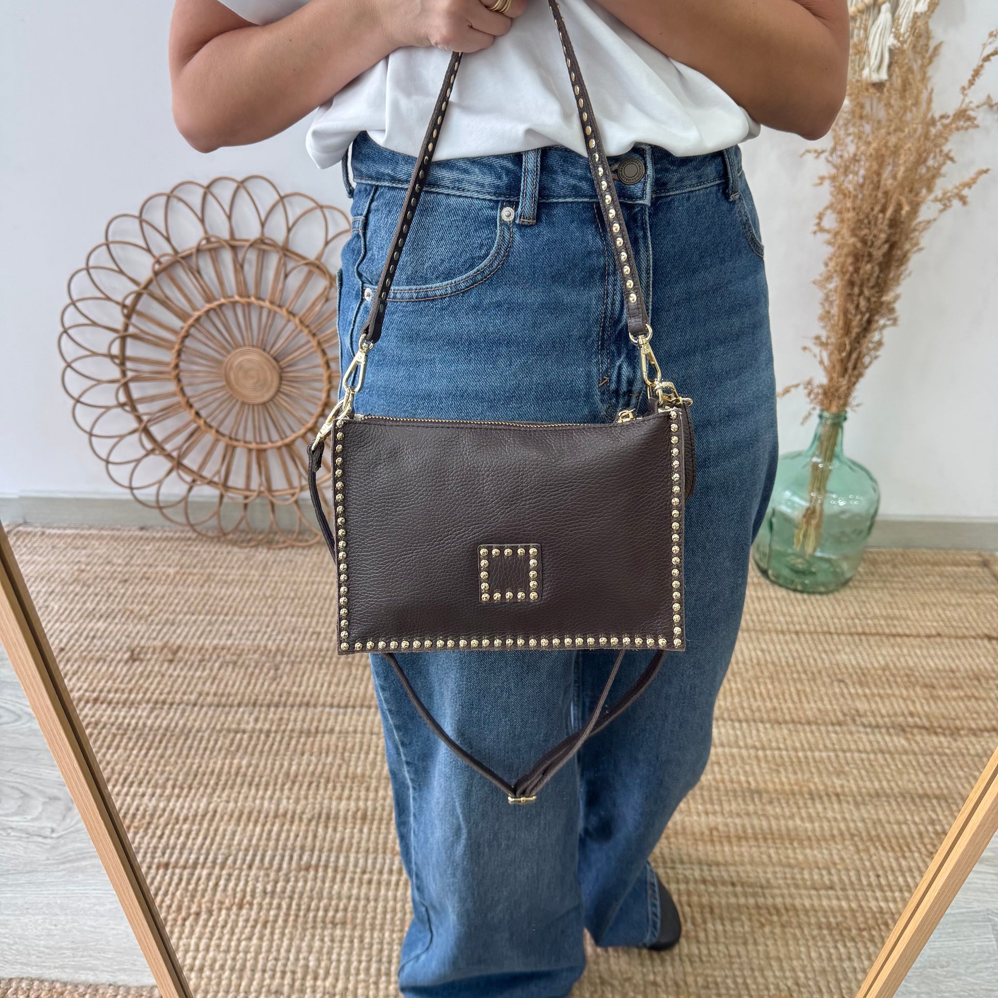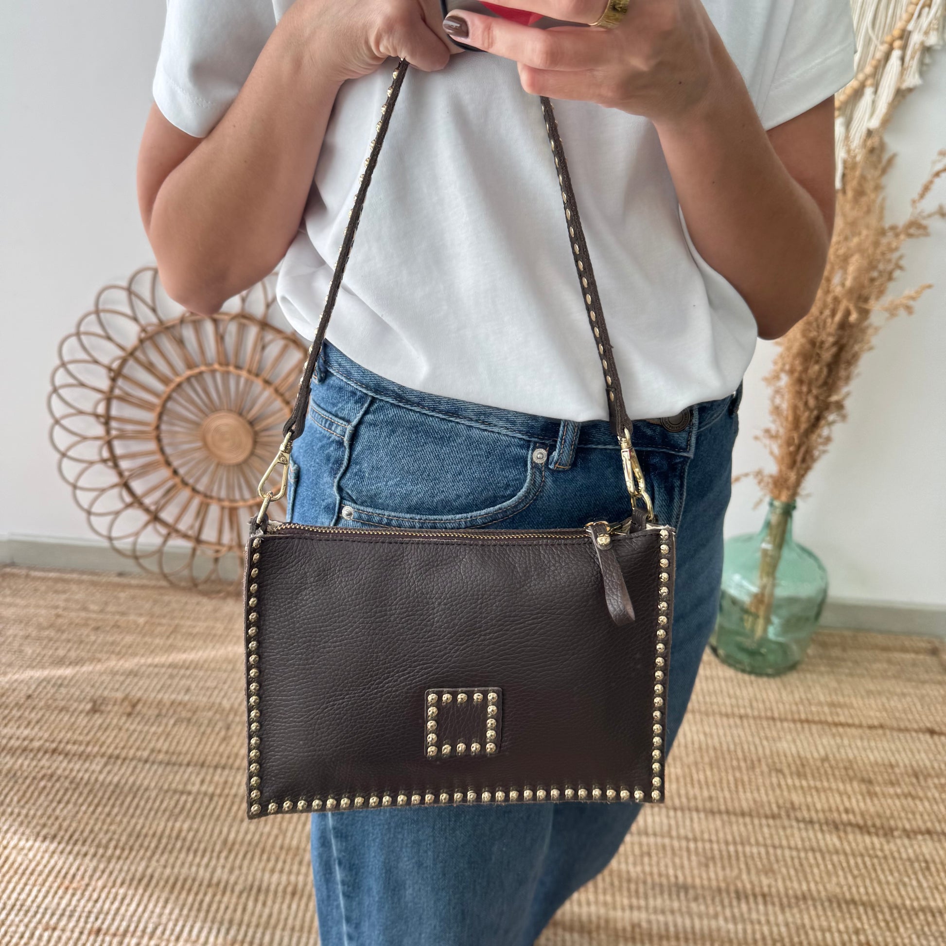 Bandolera marrón piel tachuelas doradas