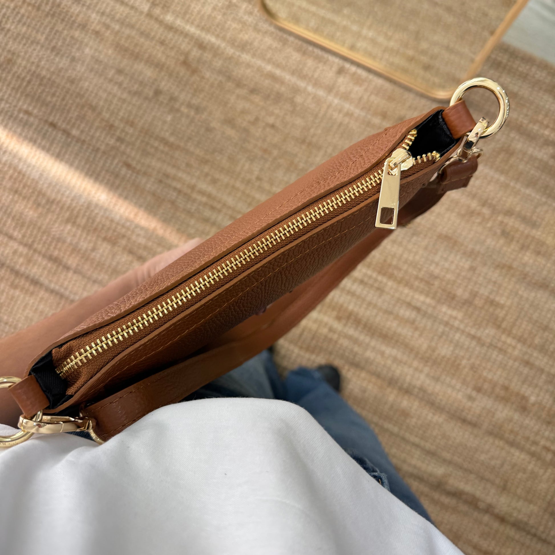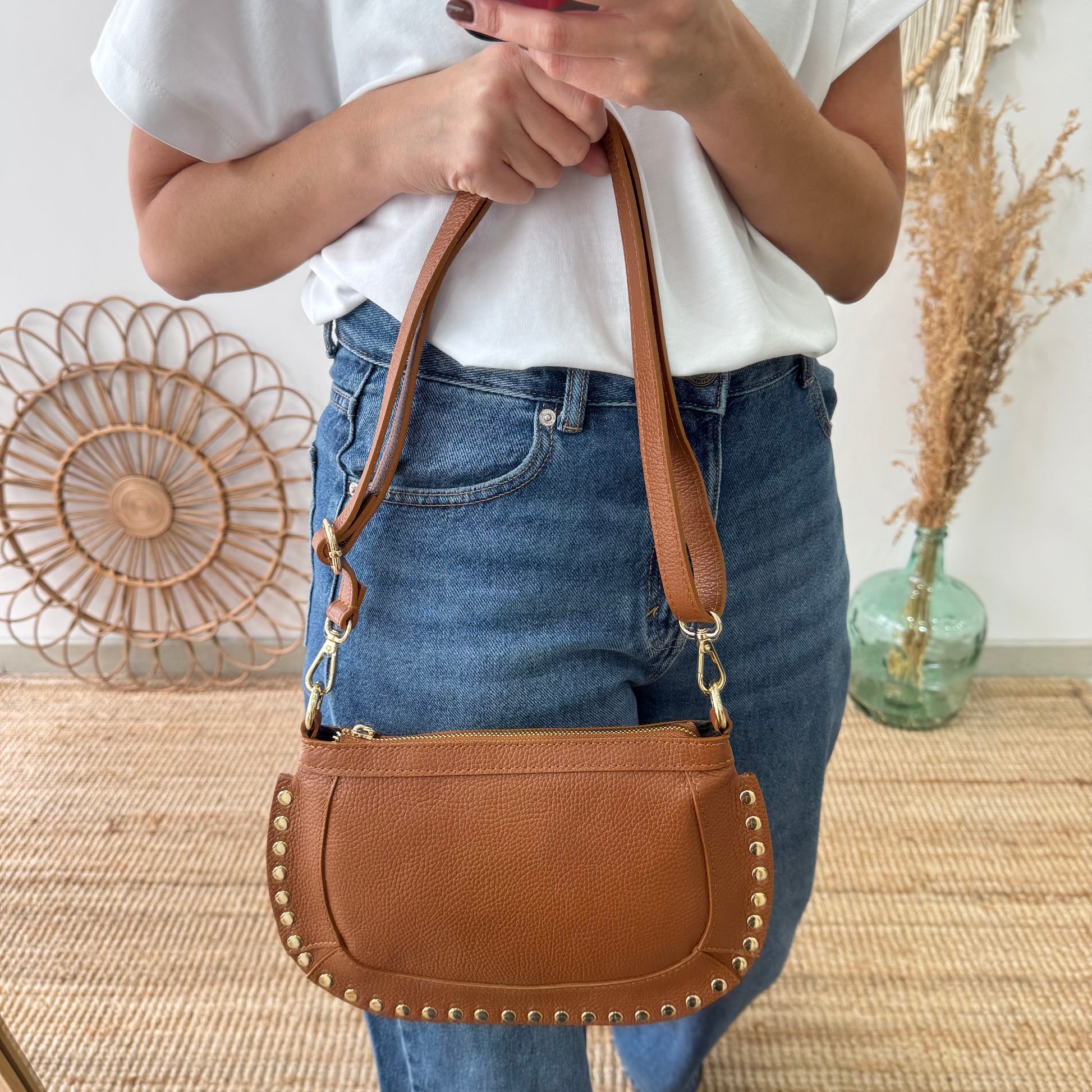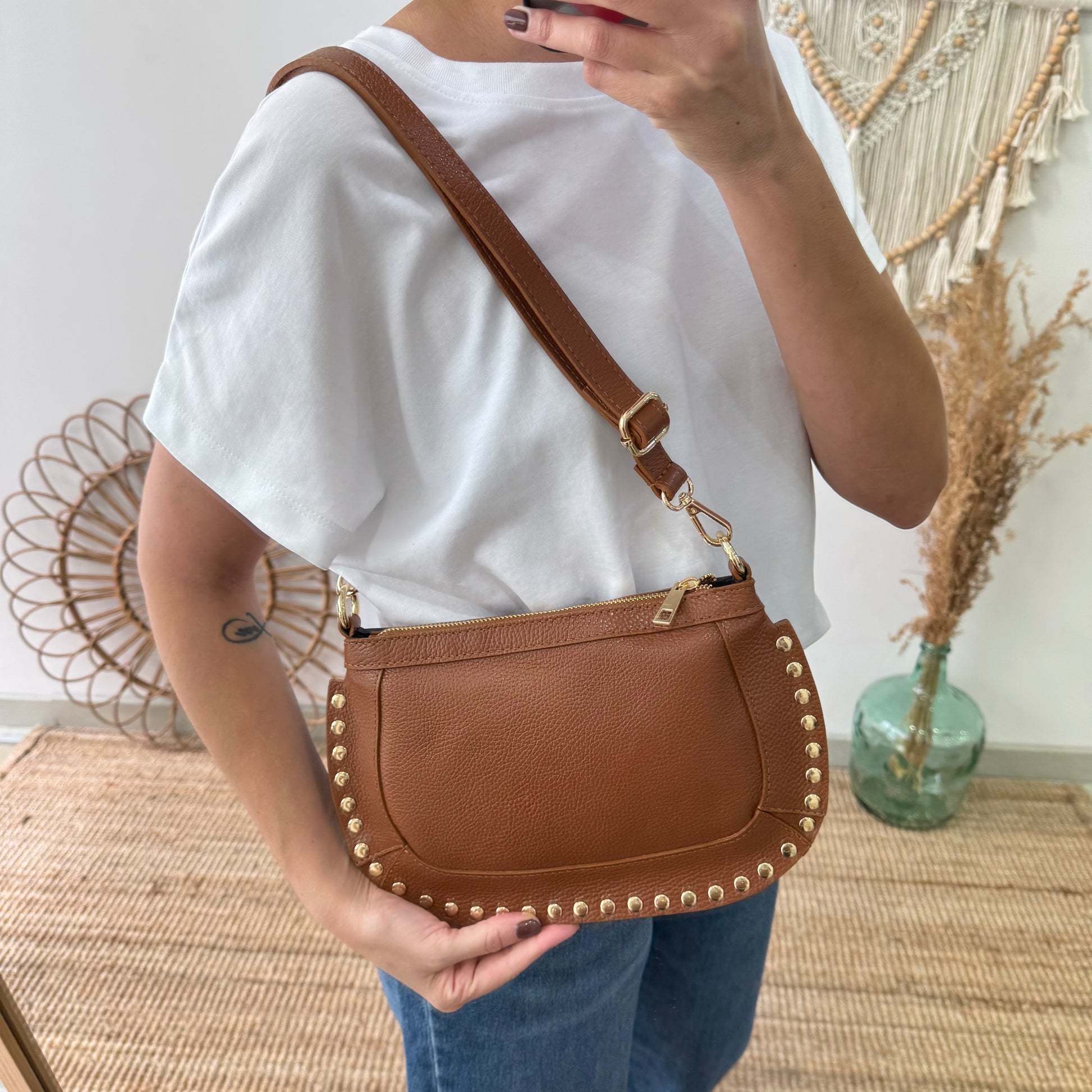 Bandolera de piel con tachuelas en forma ovalada en color camel y con herrajes dorados.