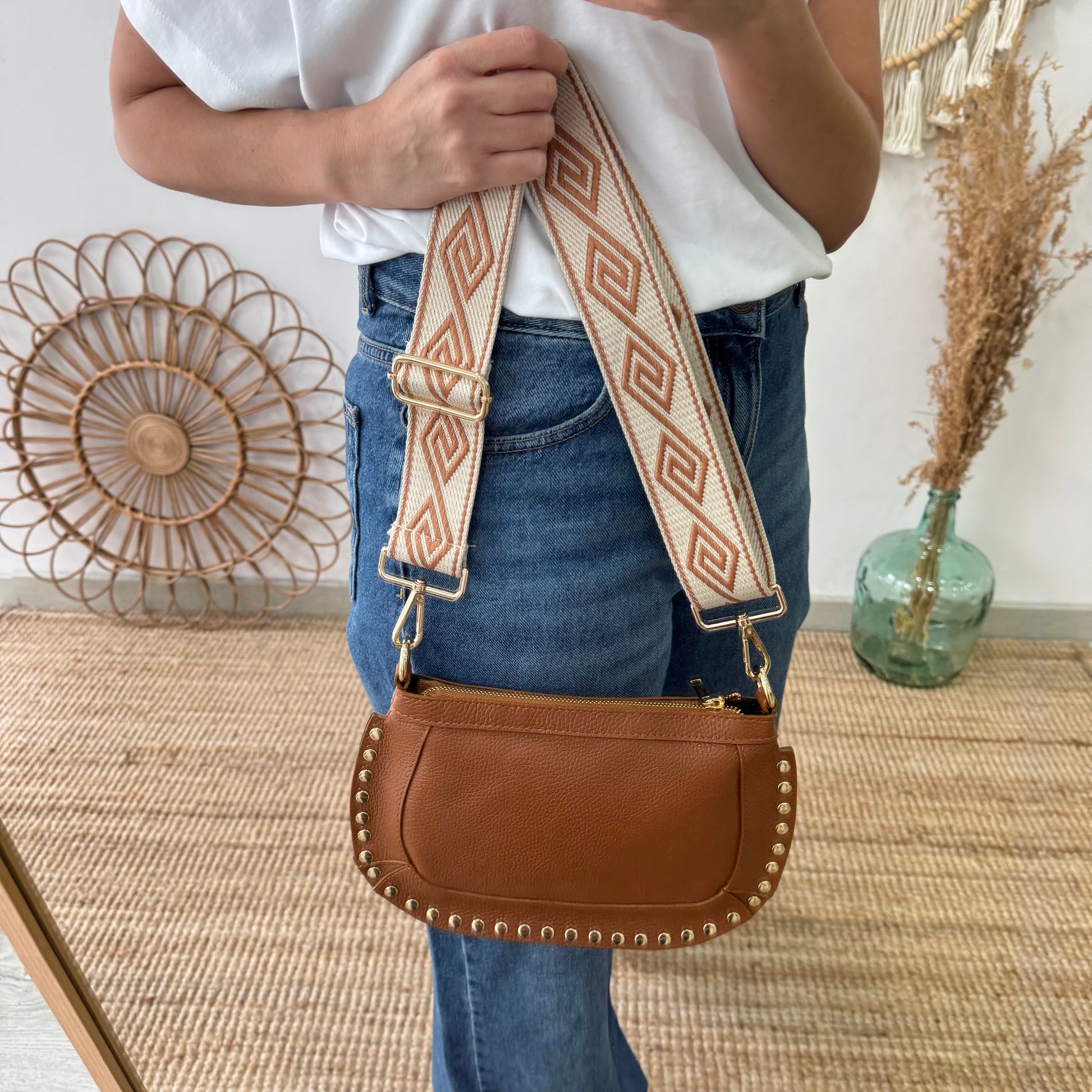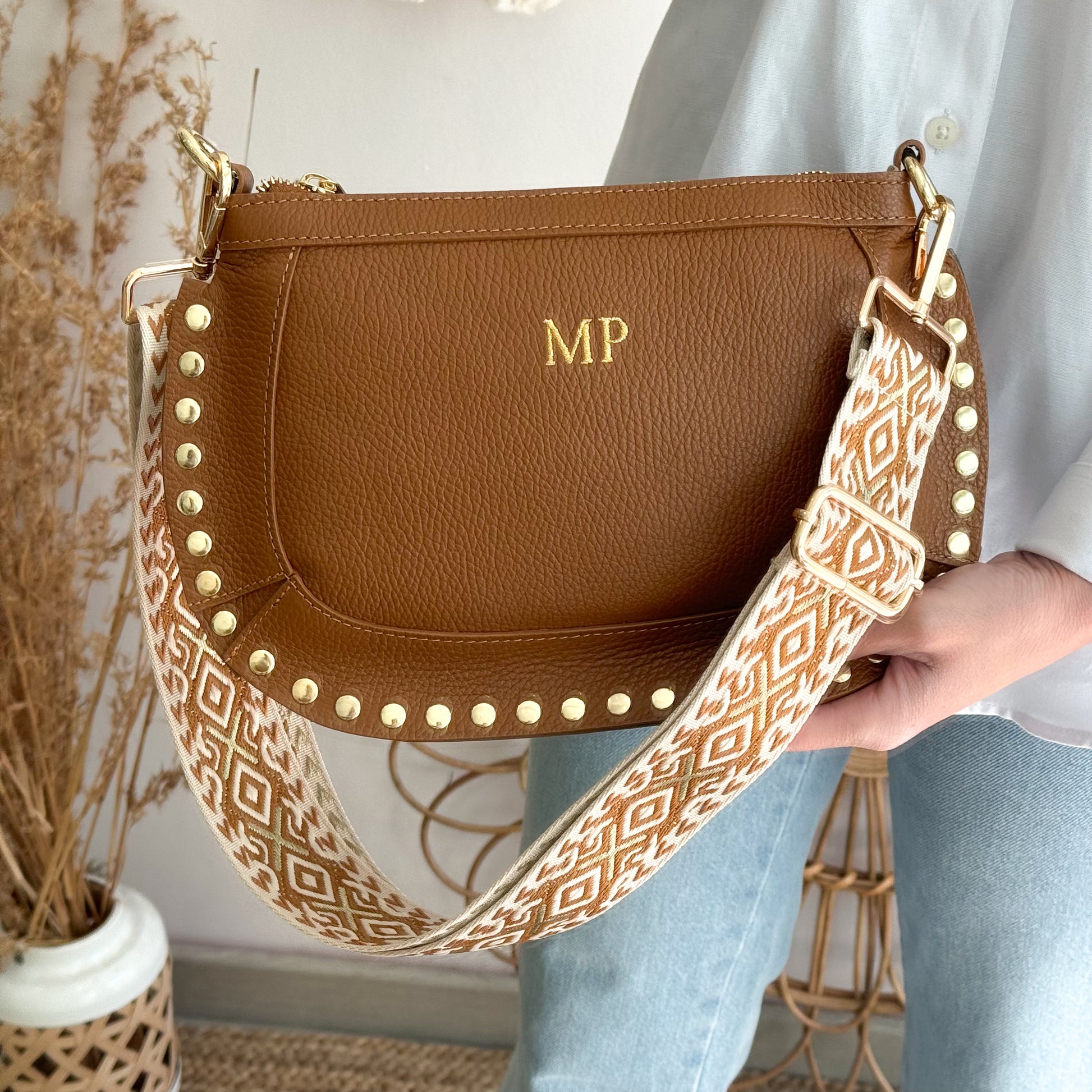 Bandolera ovalada piel tachuelas camel iniciales bordadas