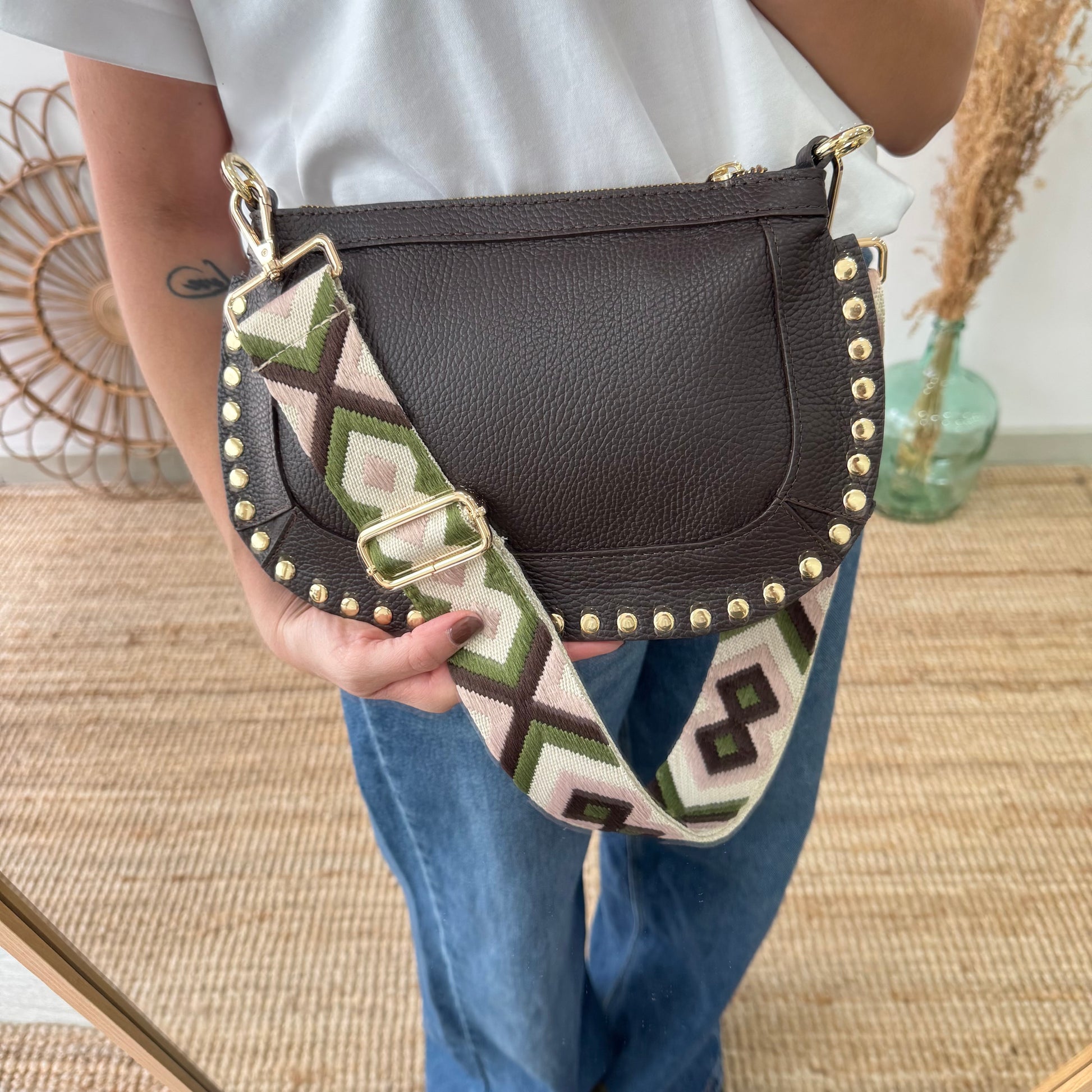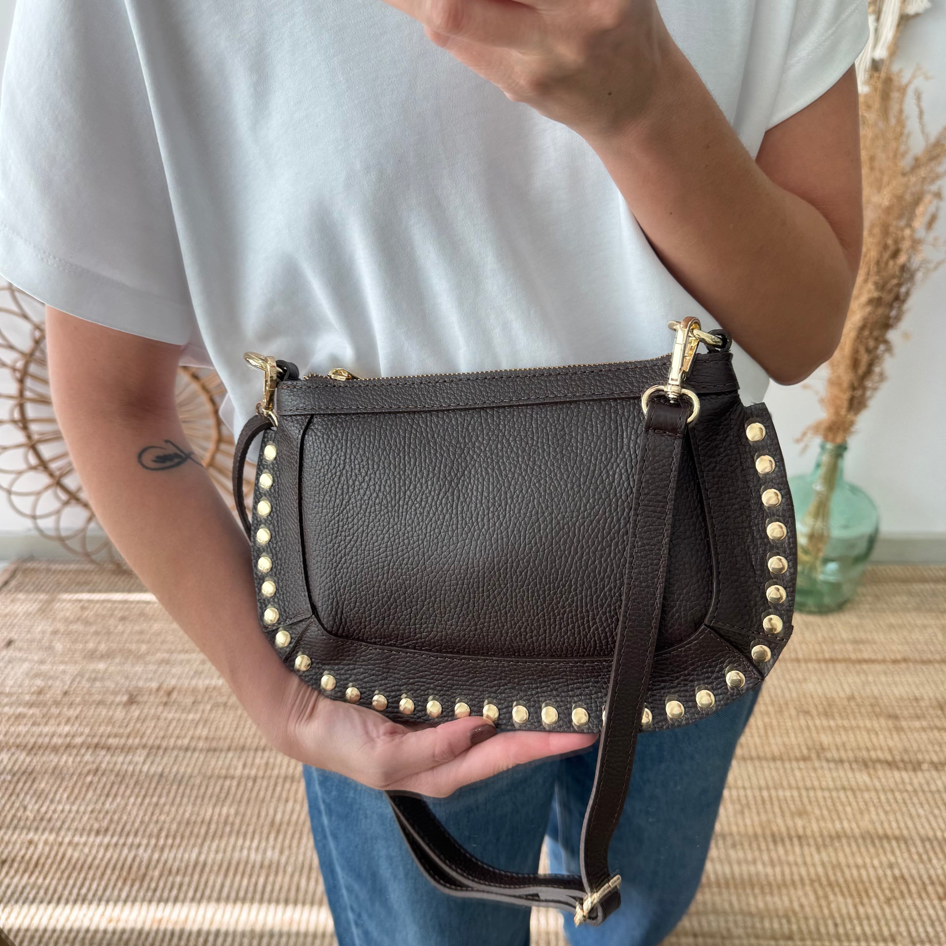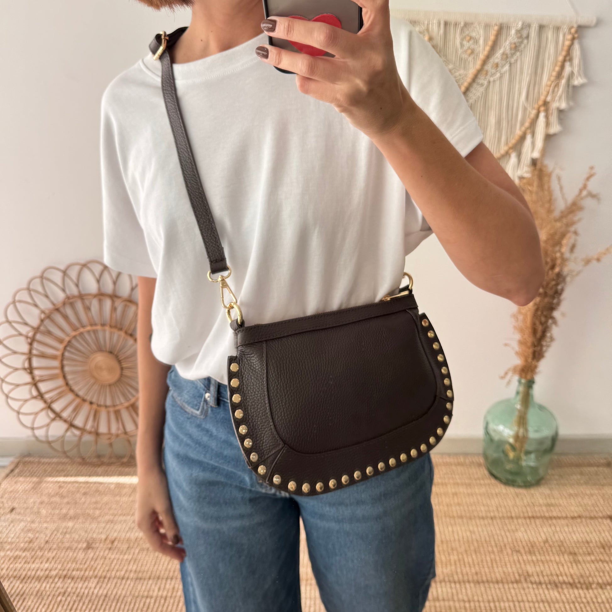 Bandolera ovalada piel tachuelas marrón iniciales bordadas