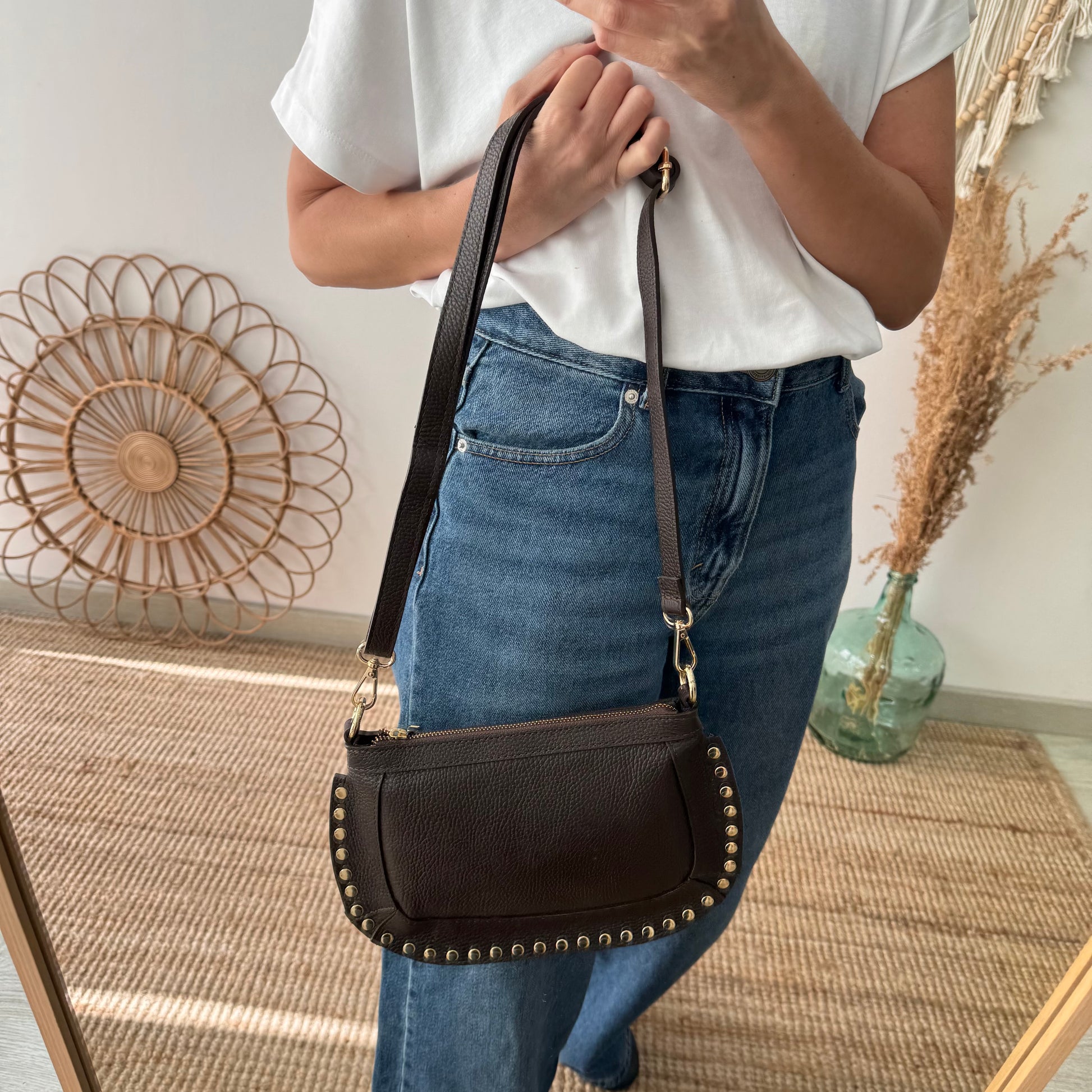 Bandolera de piel con tachuelas en forma ovalada en color marrón y con herrajes dorados.
