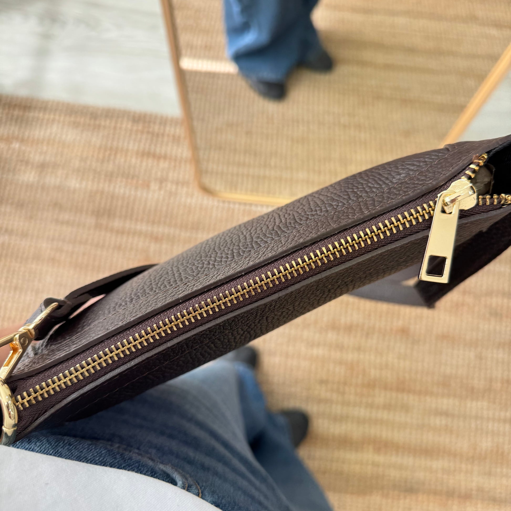 El cierre es mediante cremallera, también lleva una correa ajustable en piel con herrajes dorados.