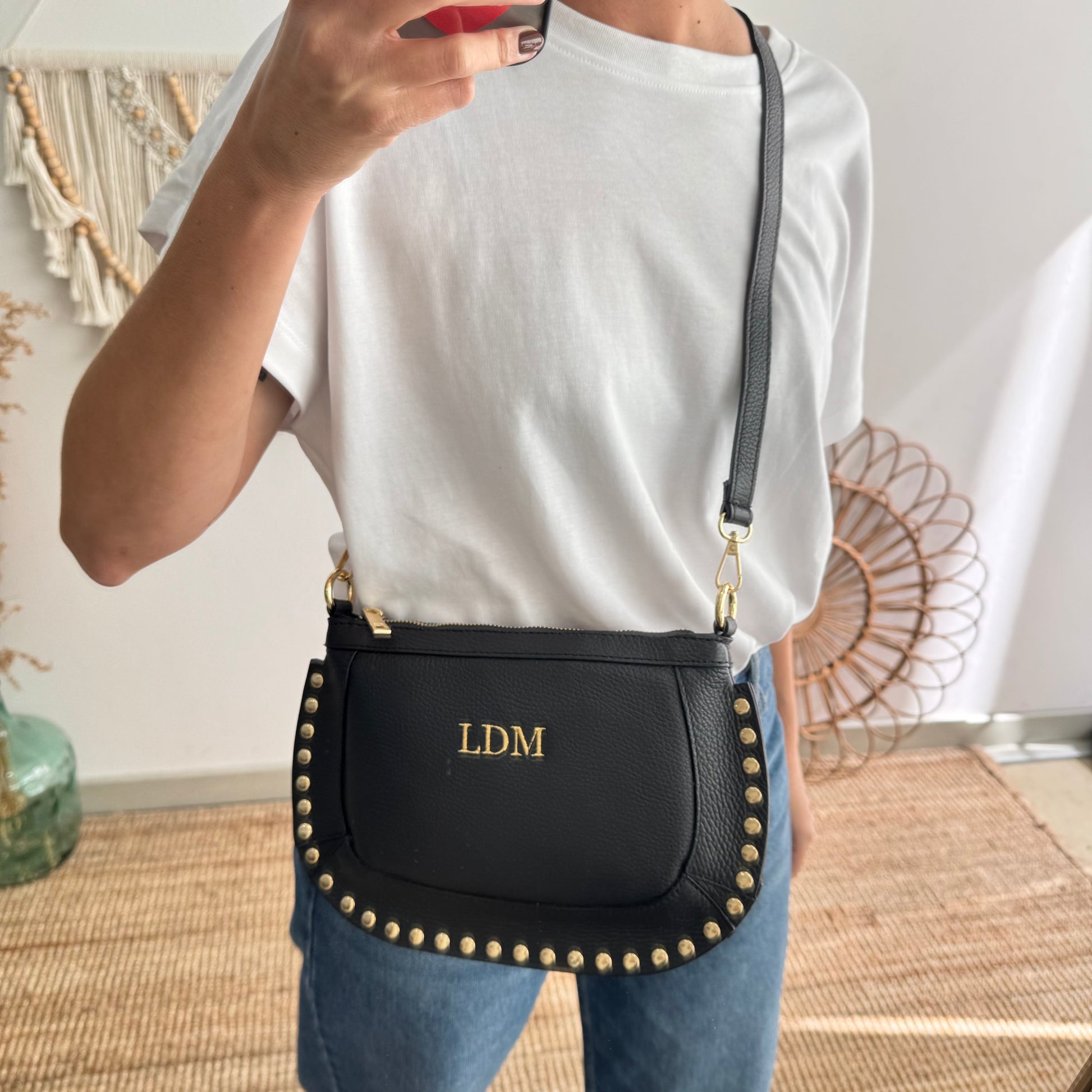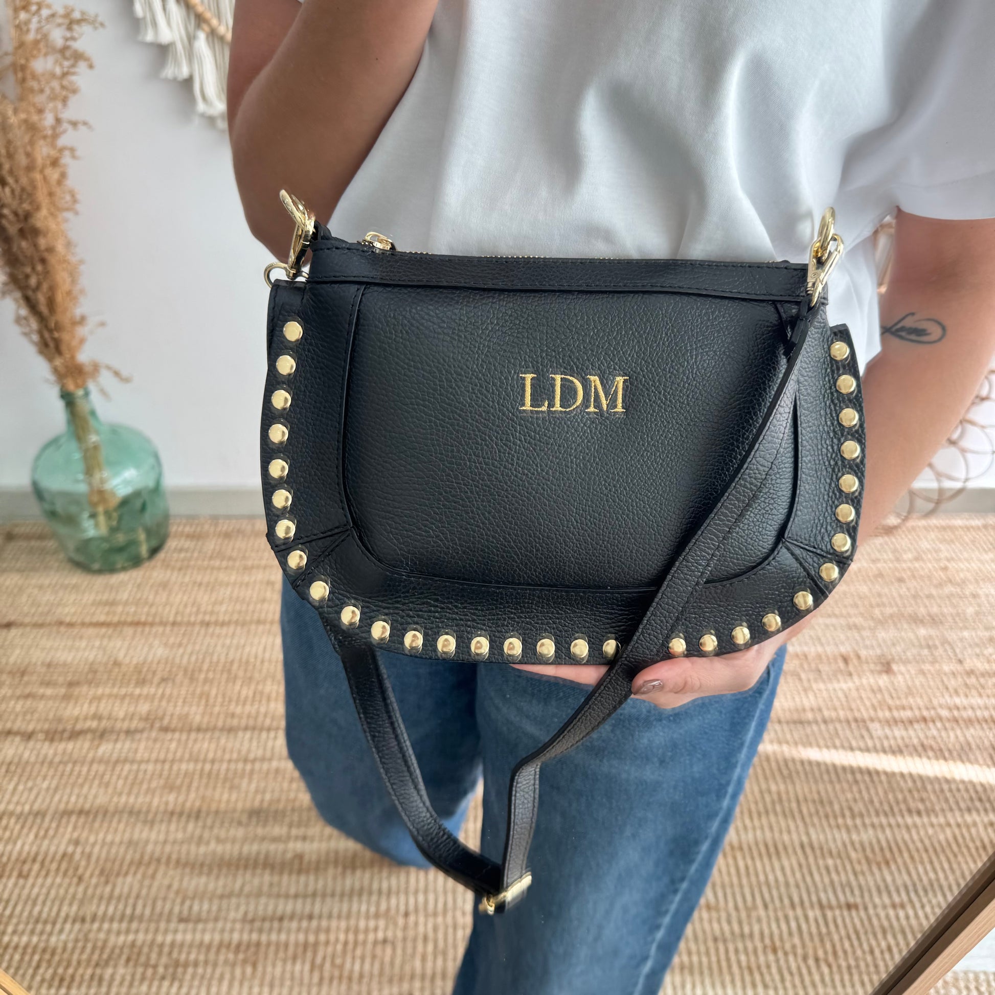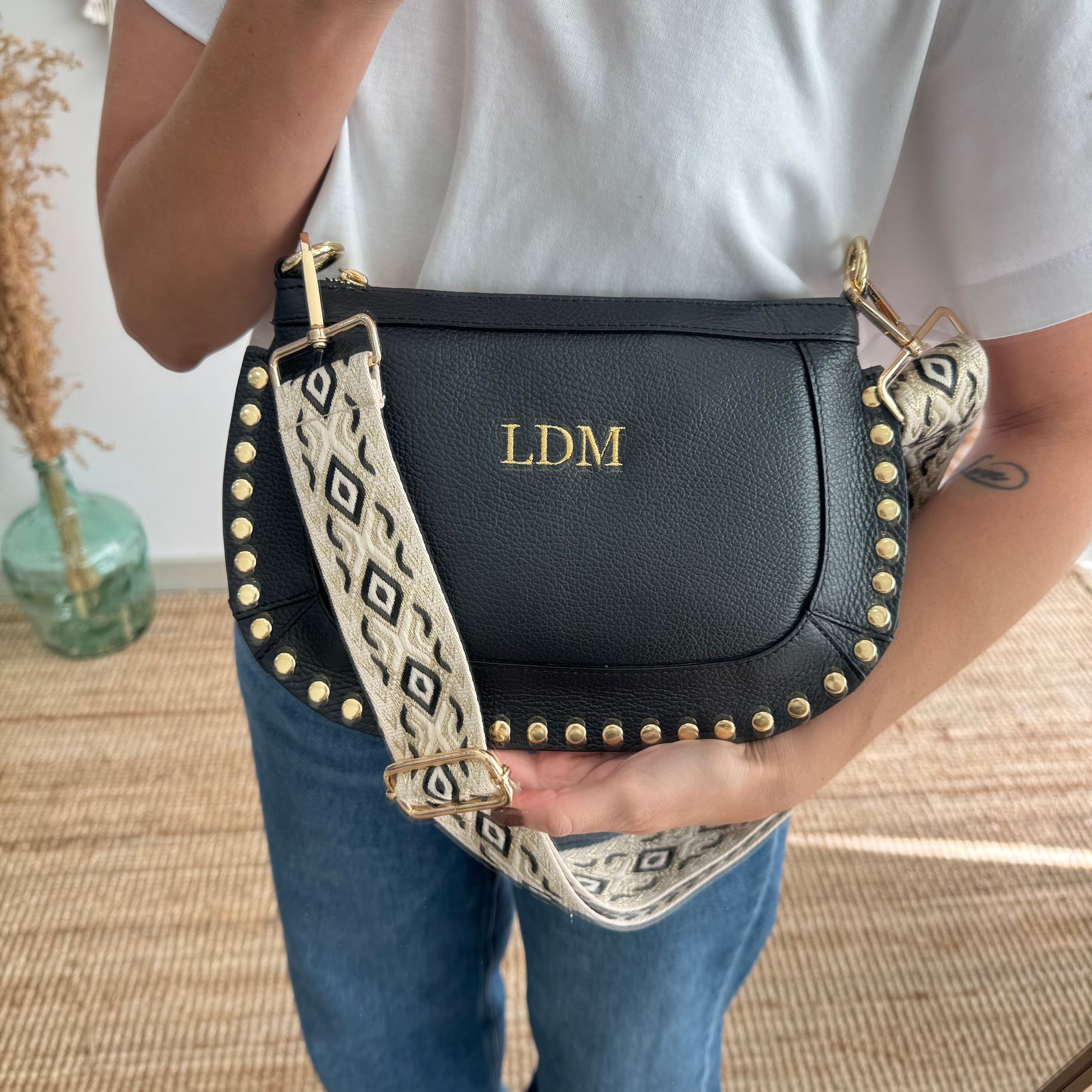 Bandolera ovalada piel tachuelas negro iniciales bordadas