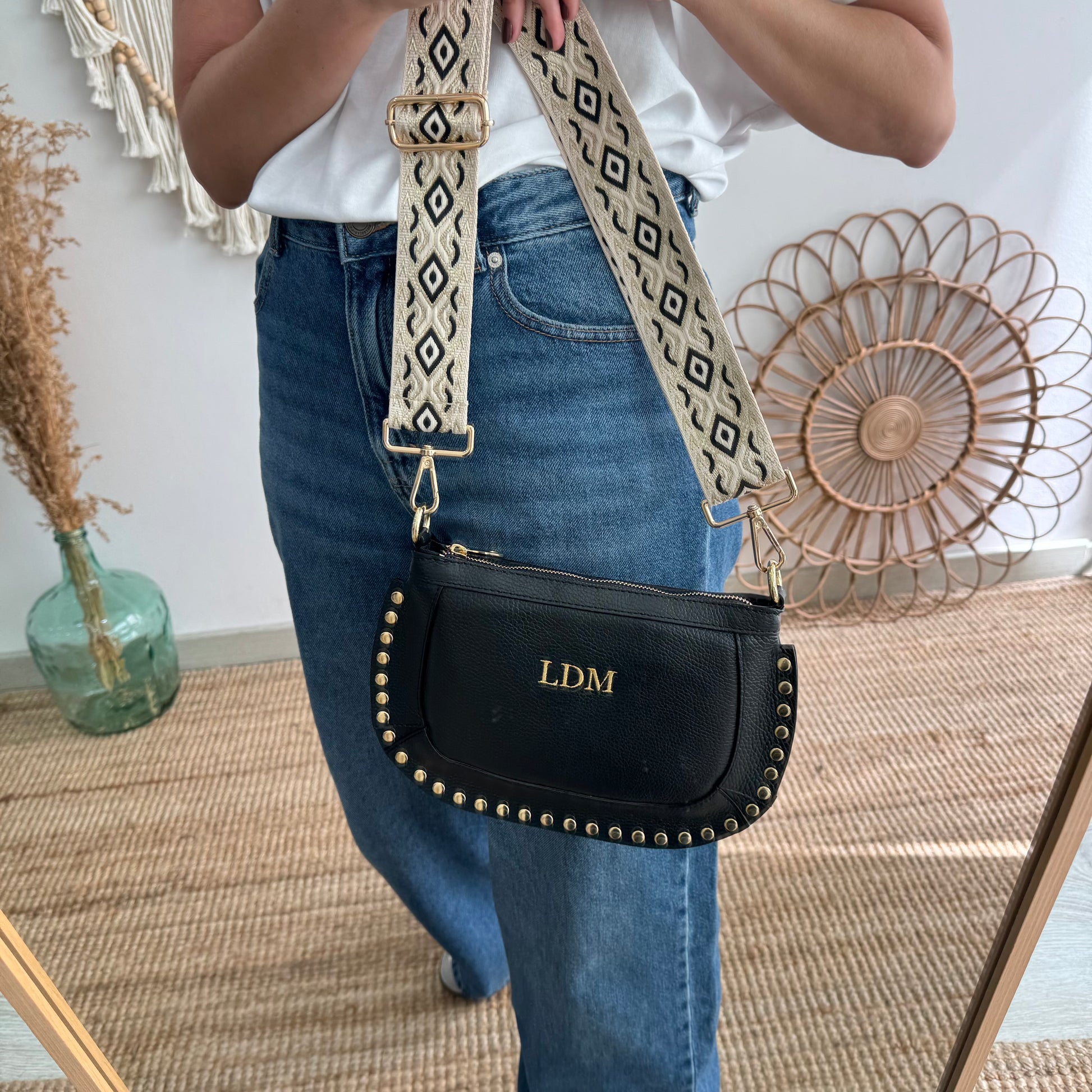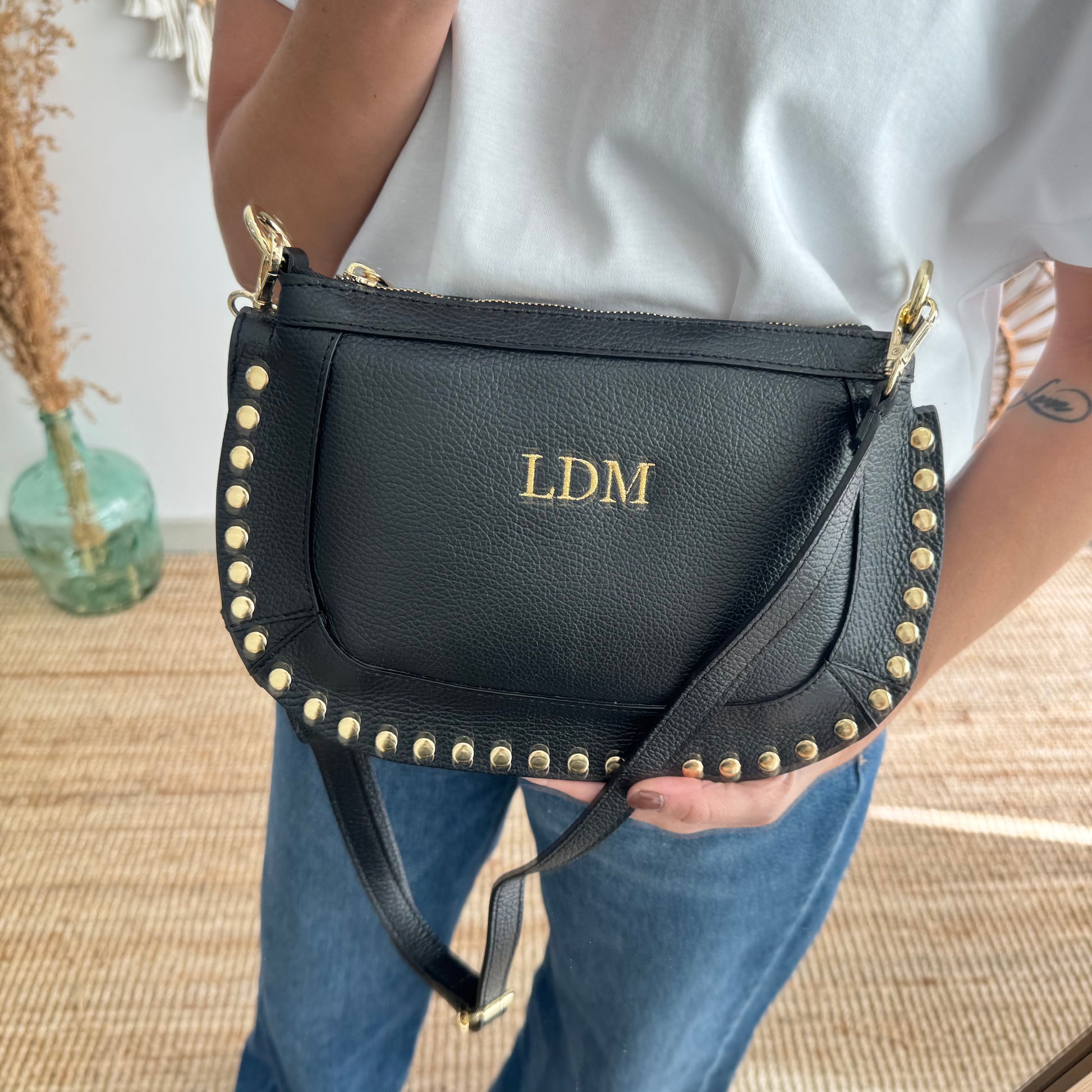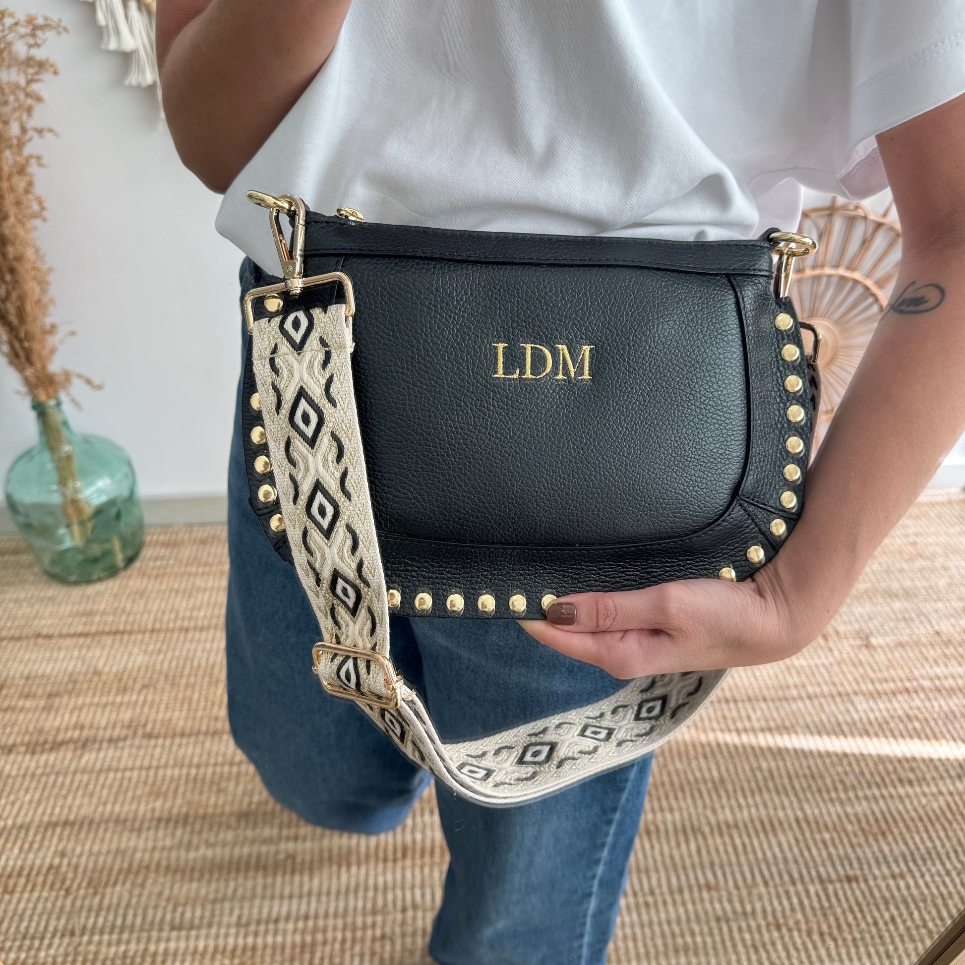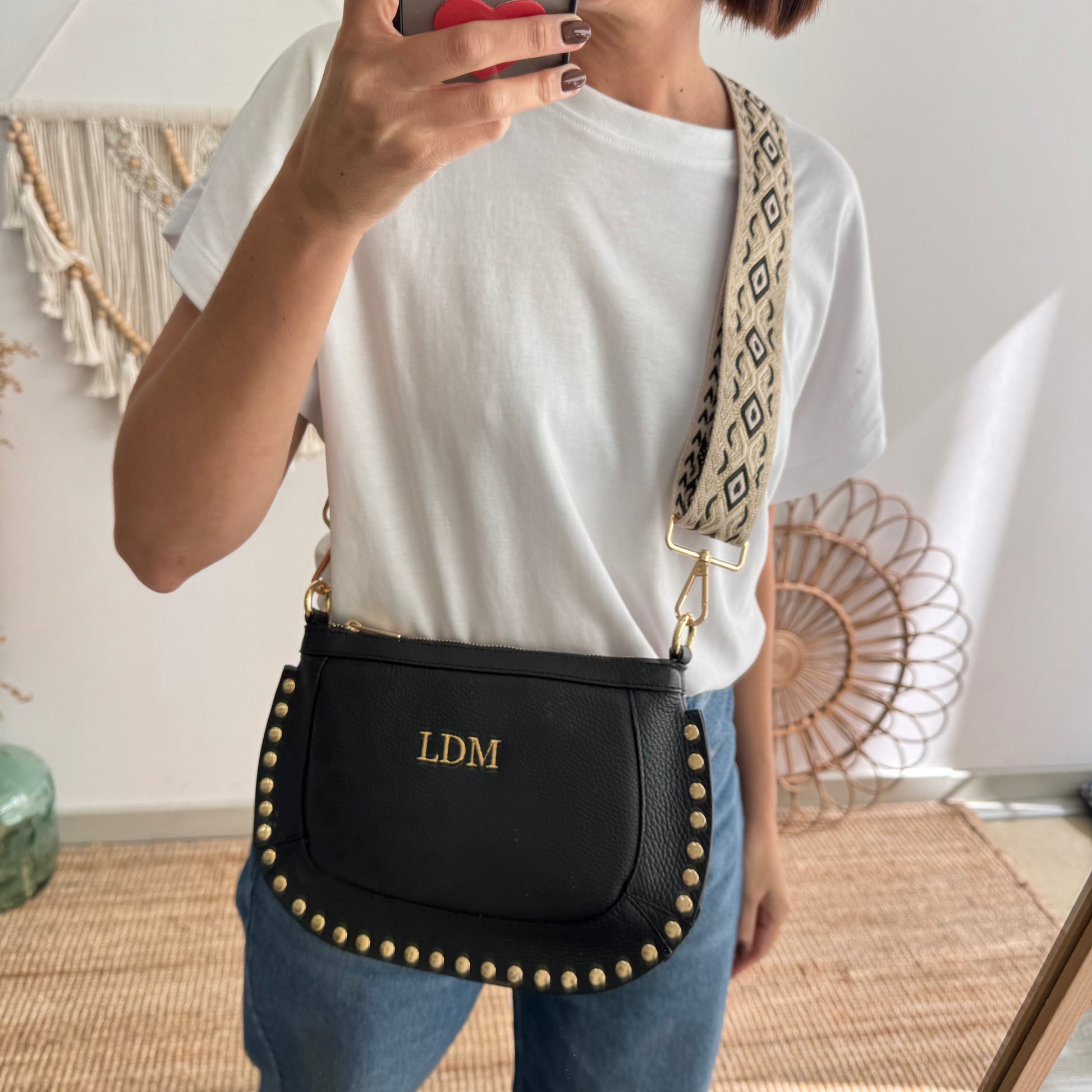 Bandolera ovalada piel tachuelas negro iniciales bordadas