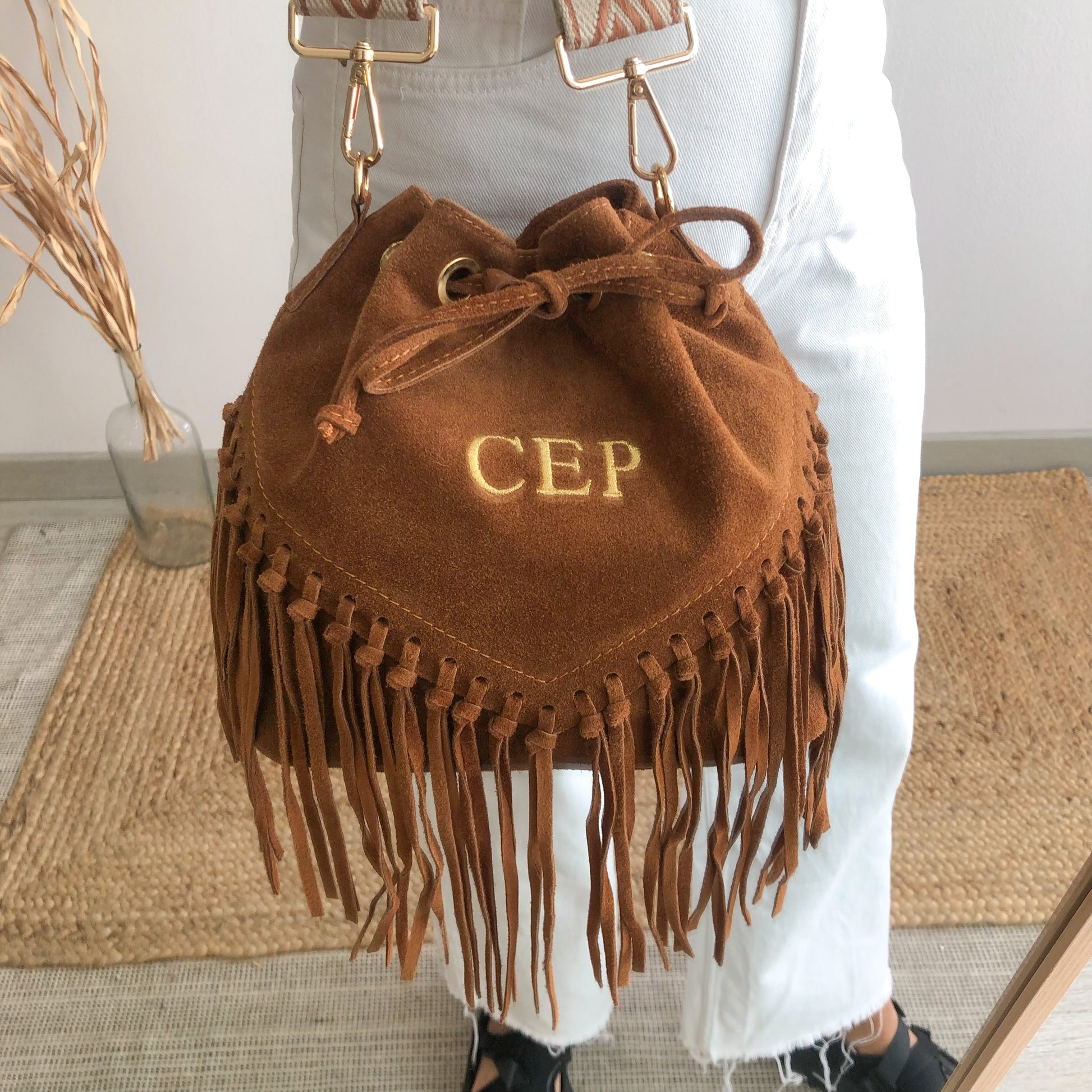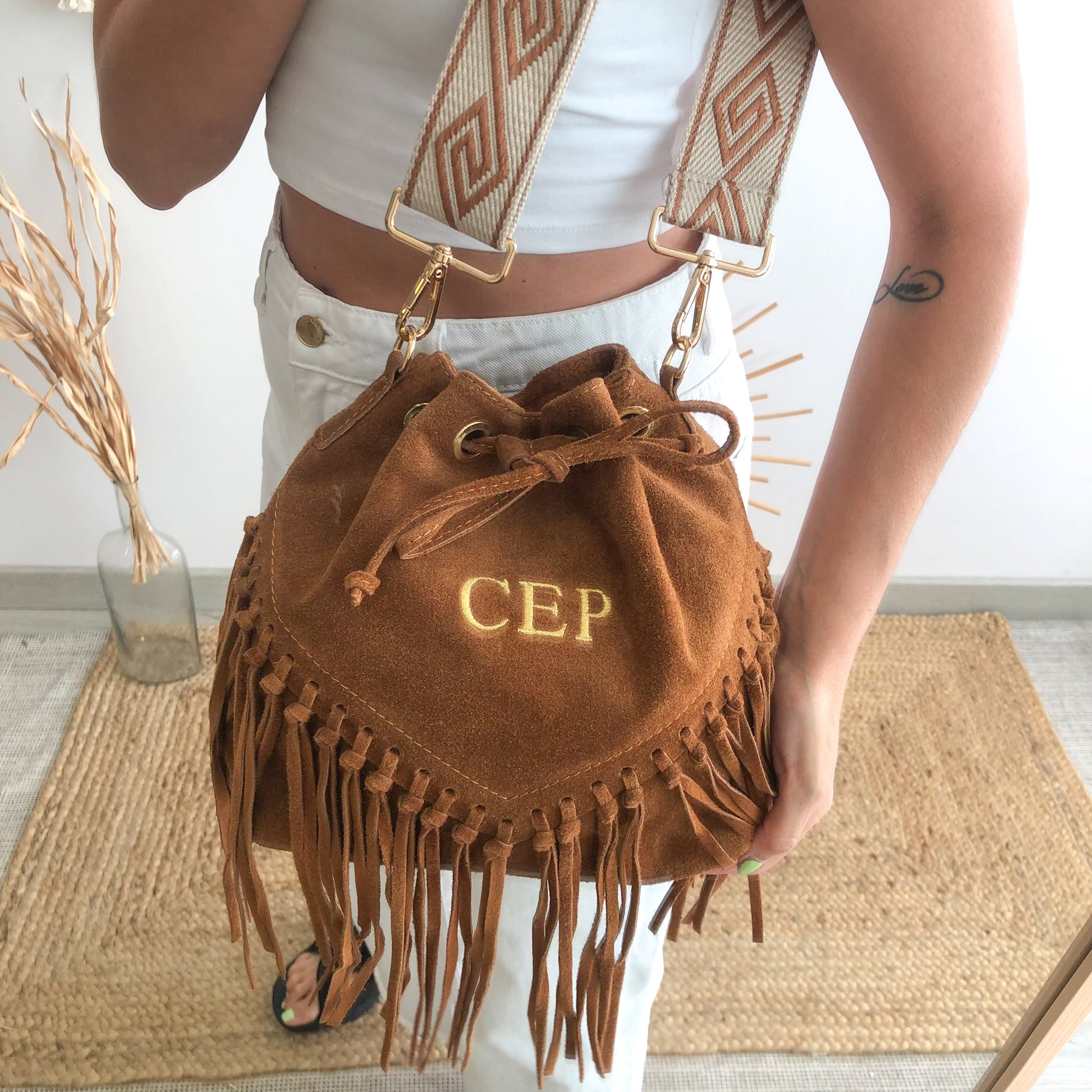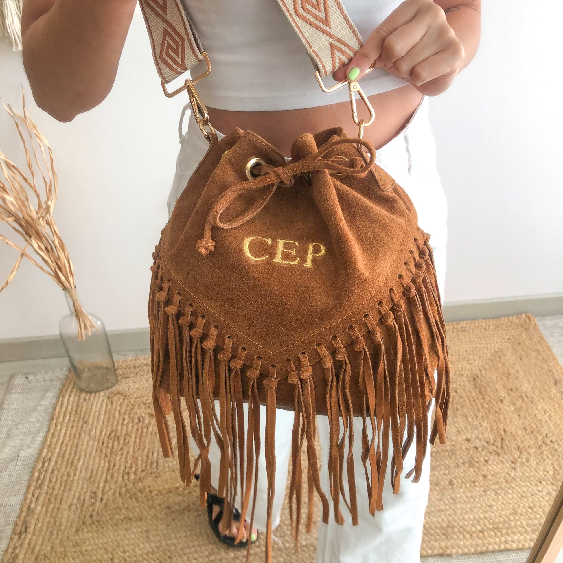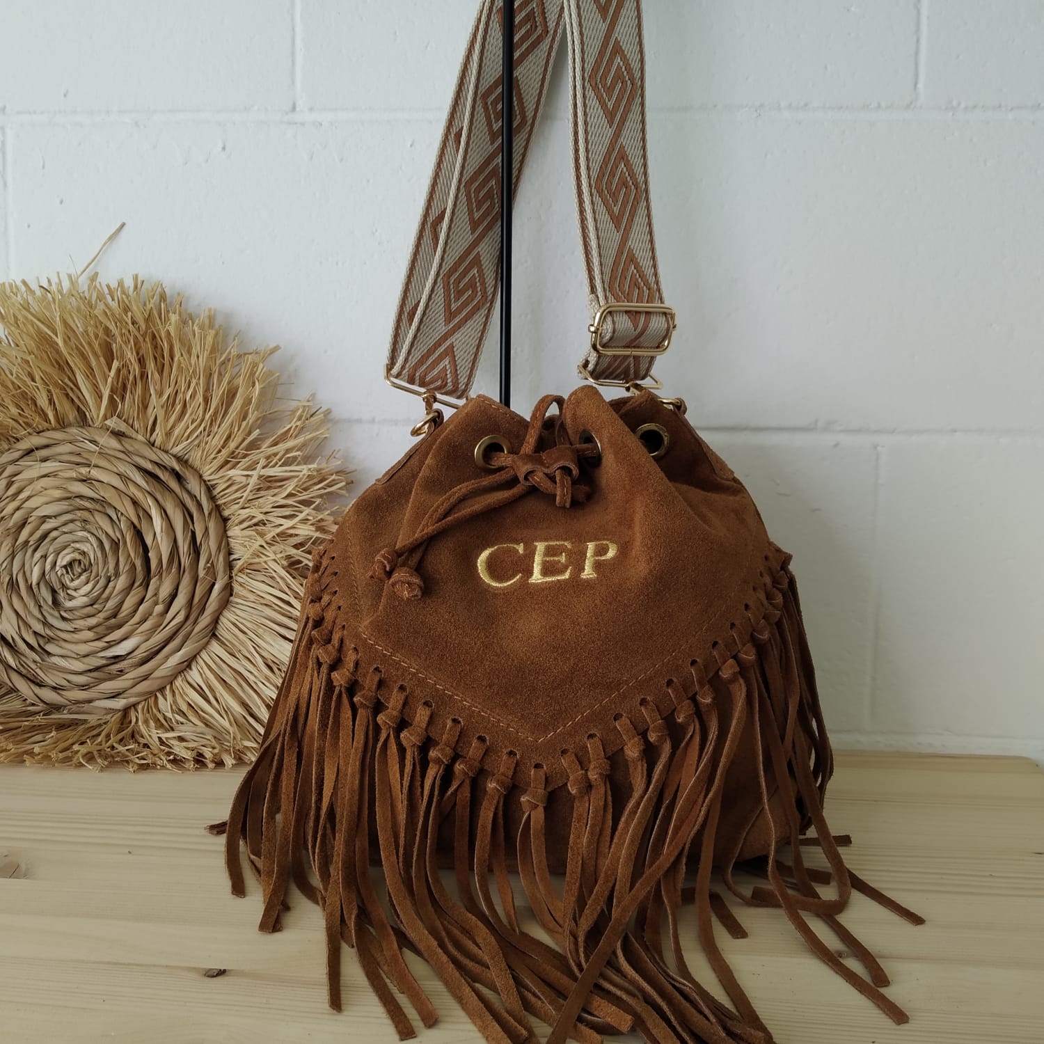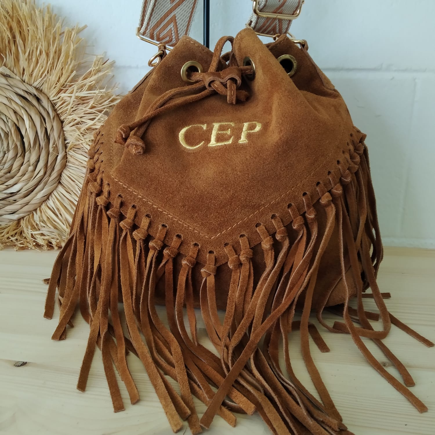 Bandolera serraje flecos camel herrajes dorados iniciales bordadas