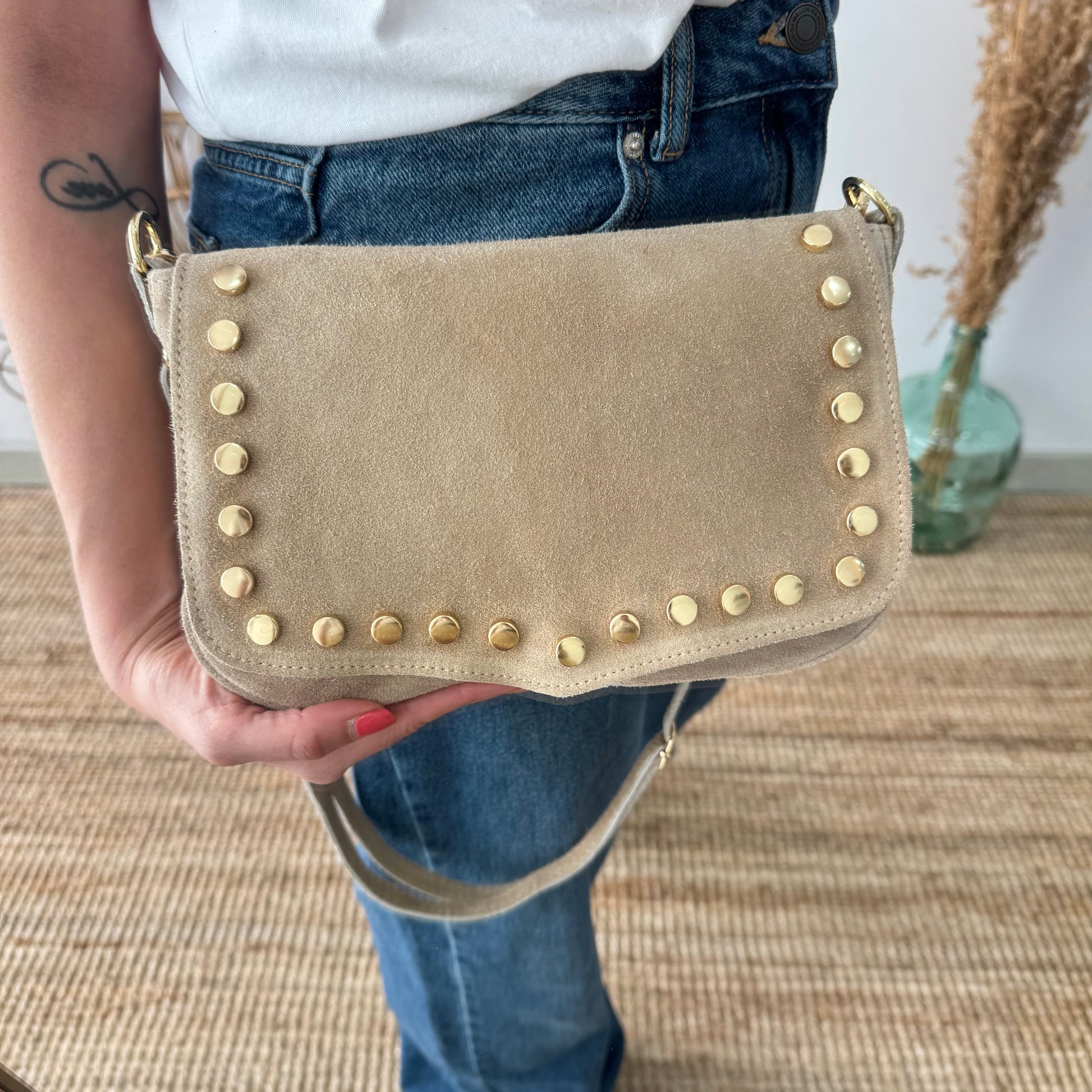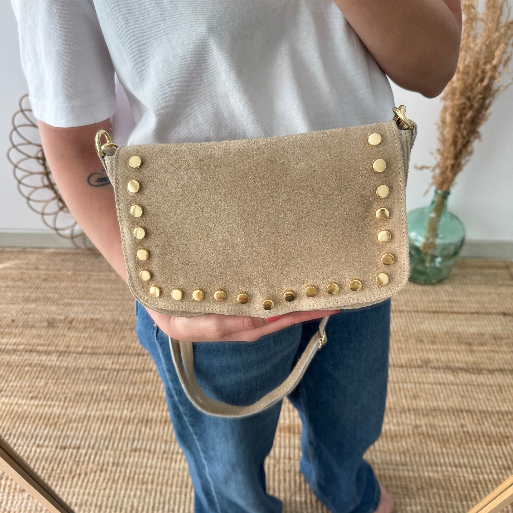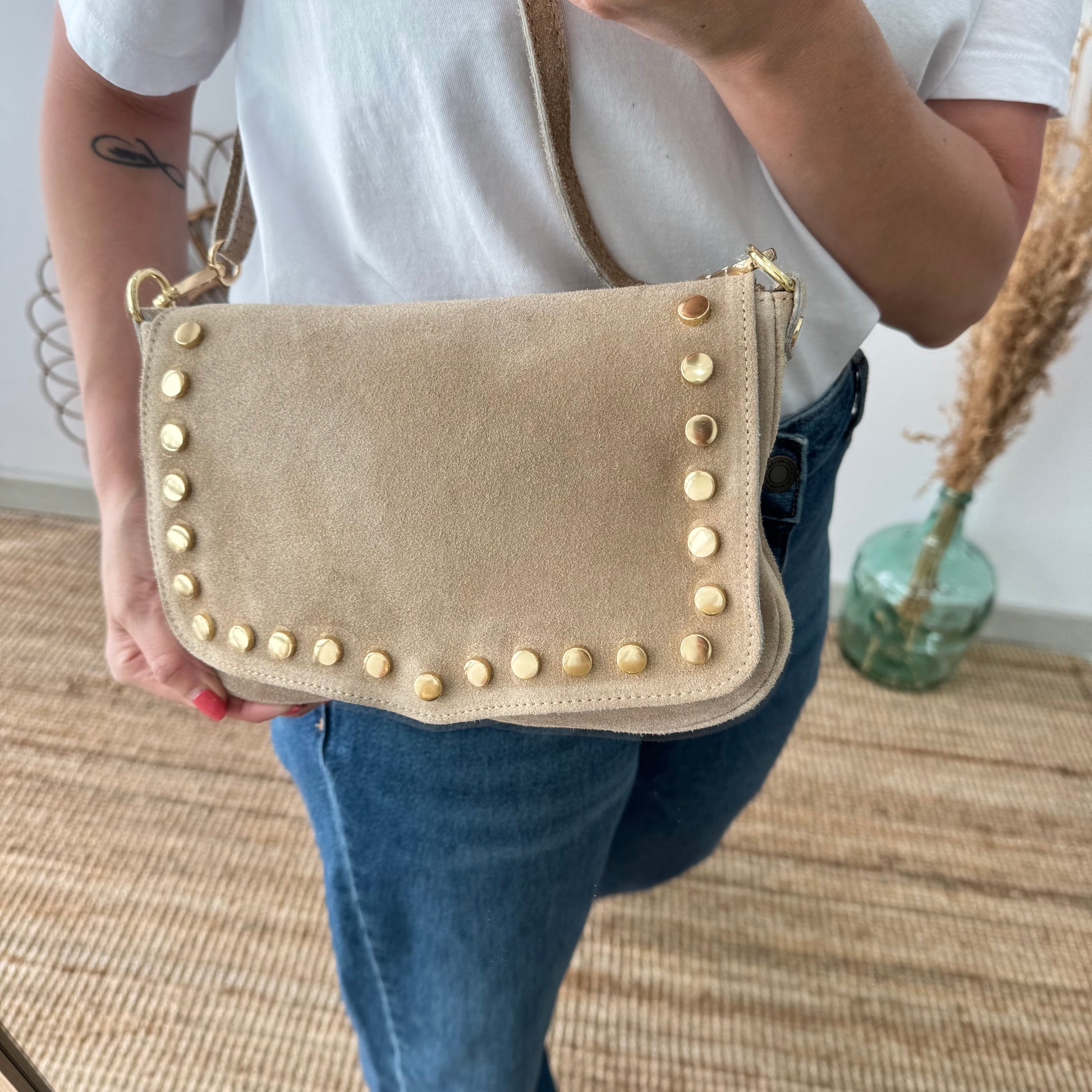 Bolso bandolera solapa de piel acabado en ante con tachuelas doradas, color beige. Personalizado con dos o tres iniciales bordadas. Bolsillo interior con cremallera. Cierre mediante cremallera.
