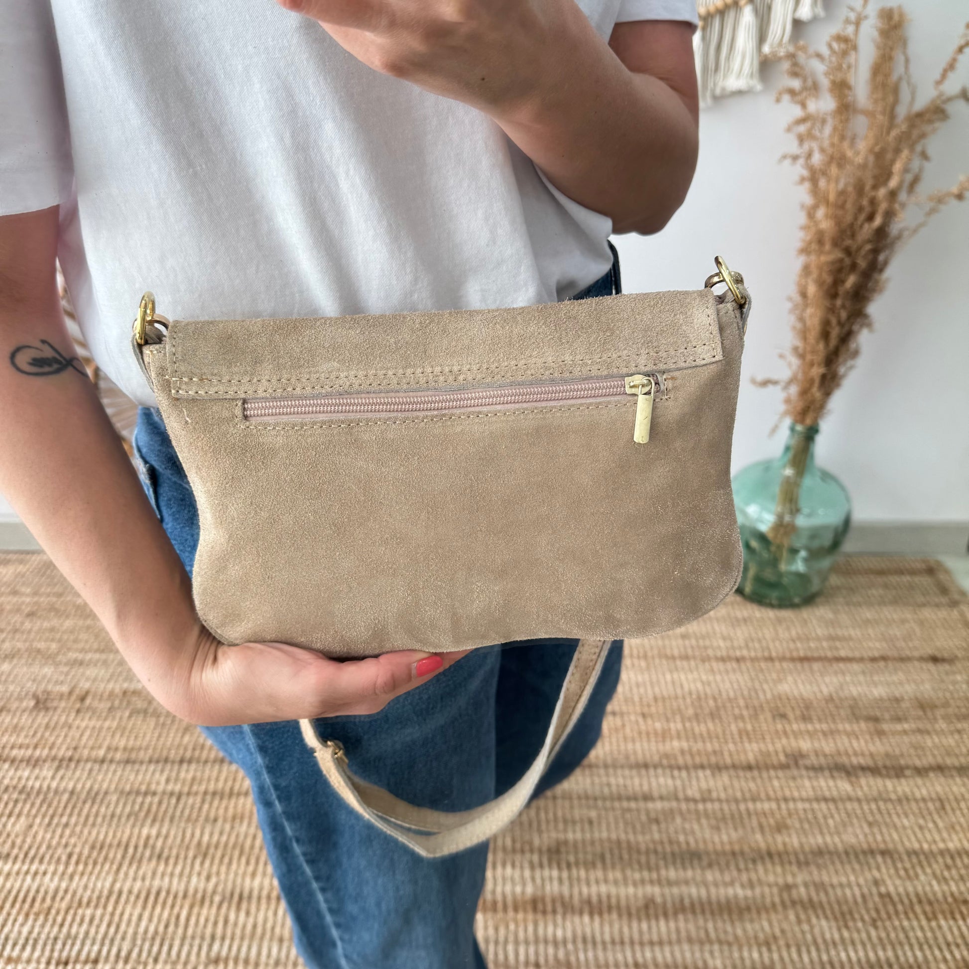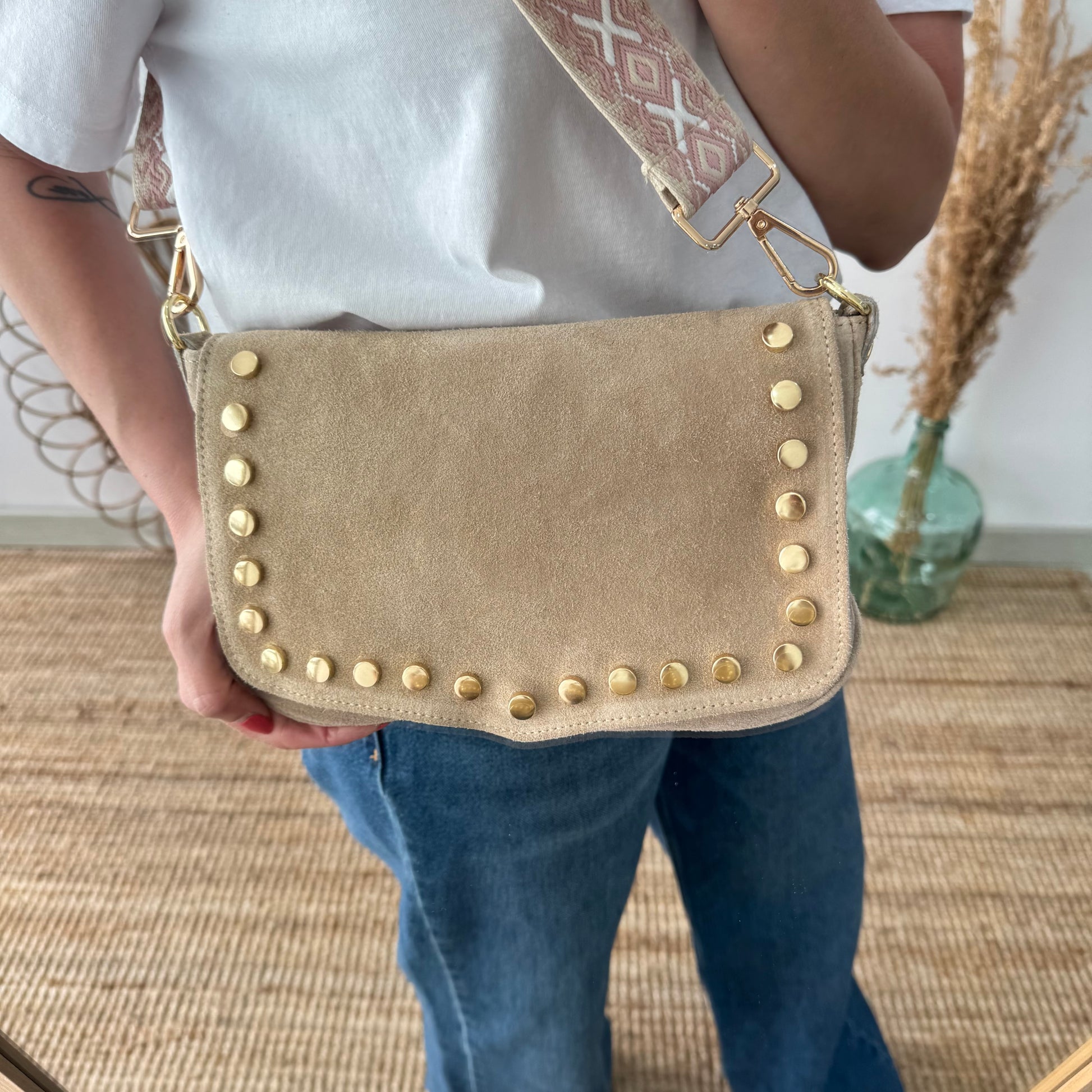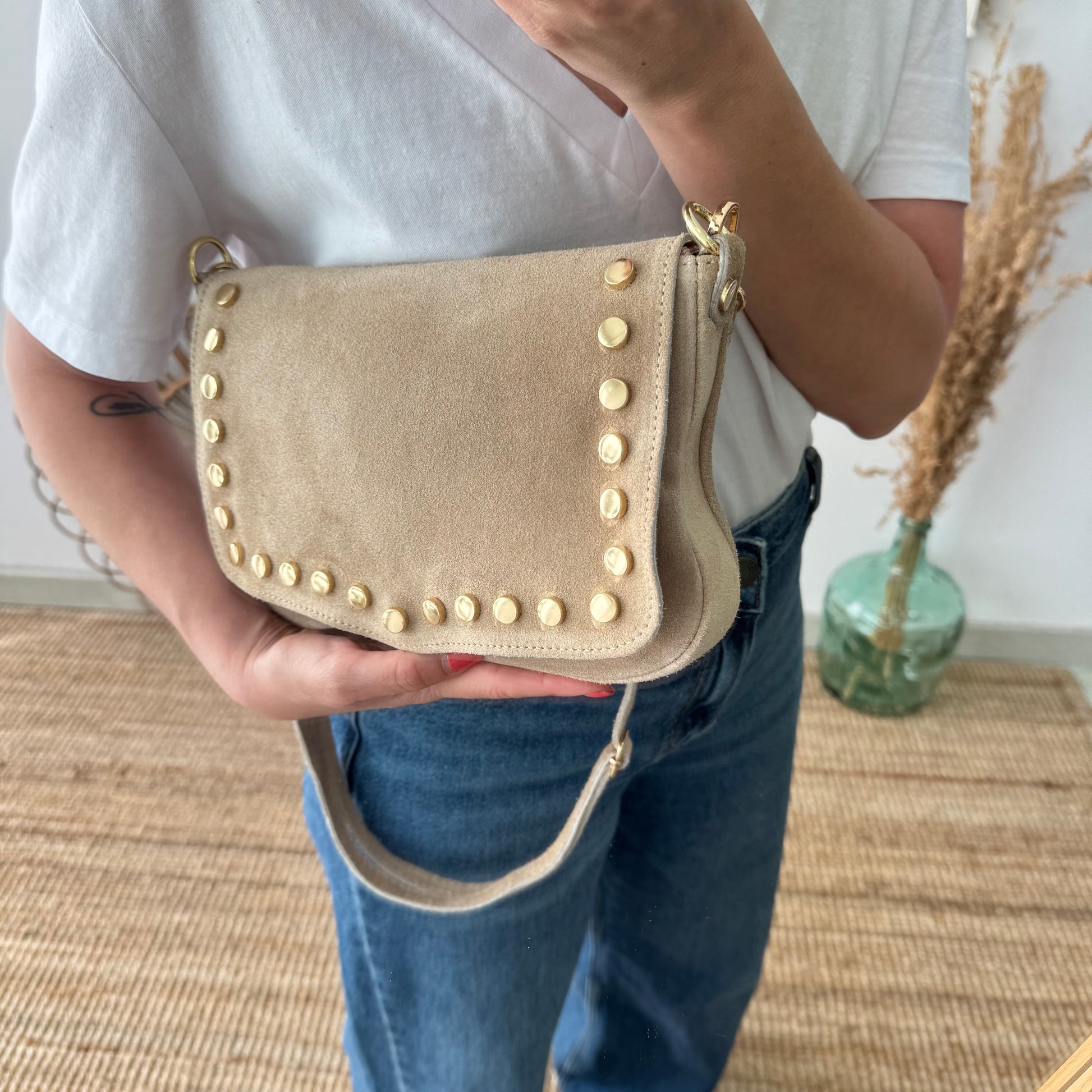 Bolso bandolera solapa de piel acabado en ante con tachuelas doradas, color beige. Personalizado con dos o tres iniciales bordadas. Bolsillo interior con cremallera. Cierre mediante cremallera.