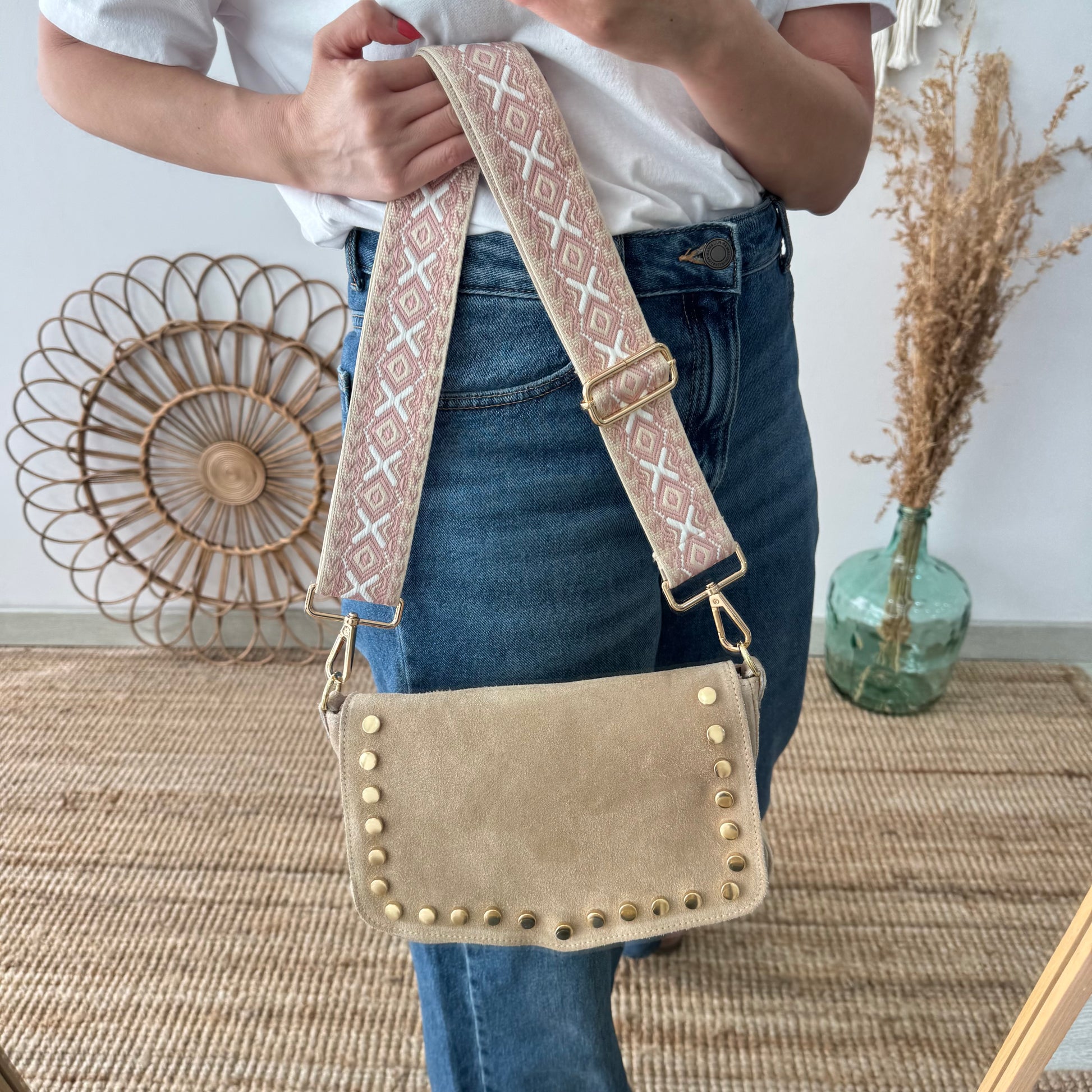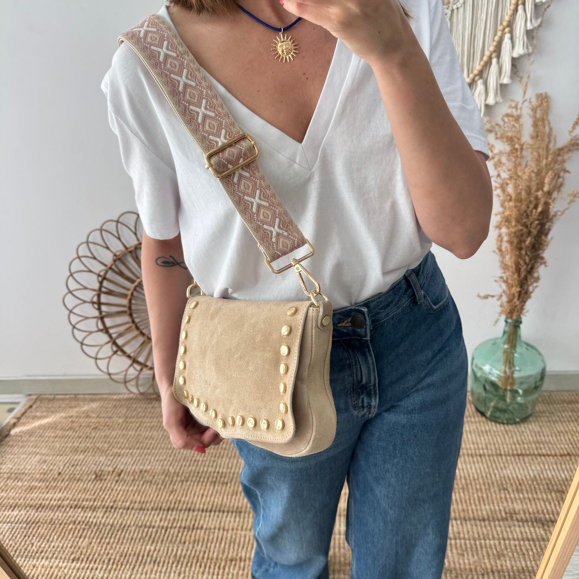 Bandolera solapa tachuelas doradas serraje iniciales bordadas beige