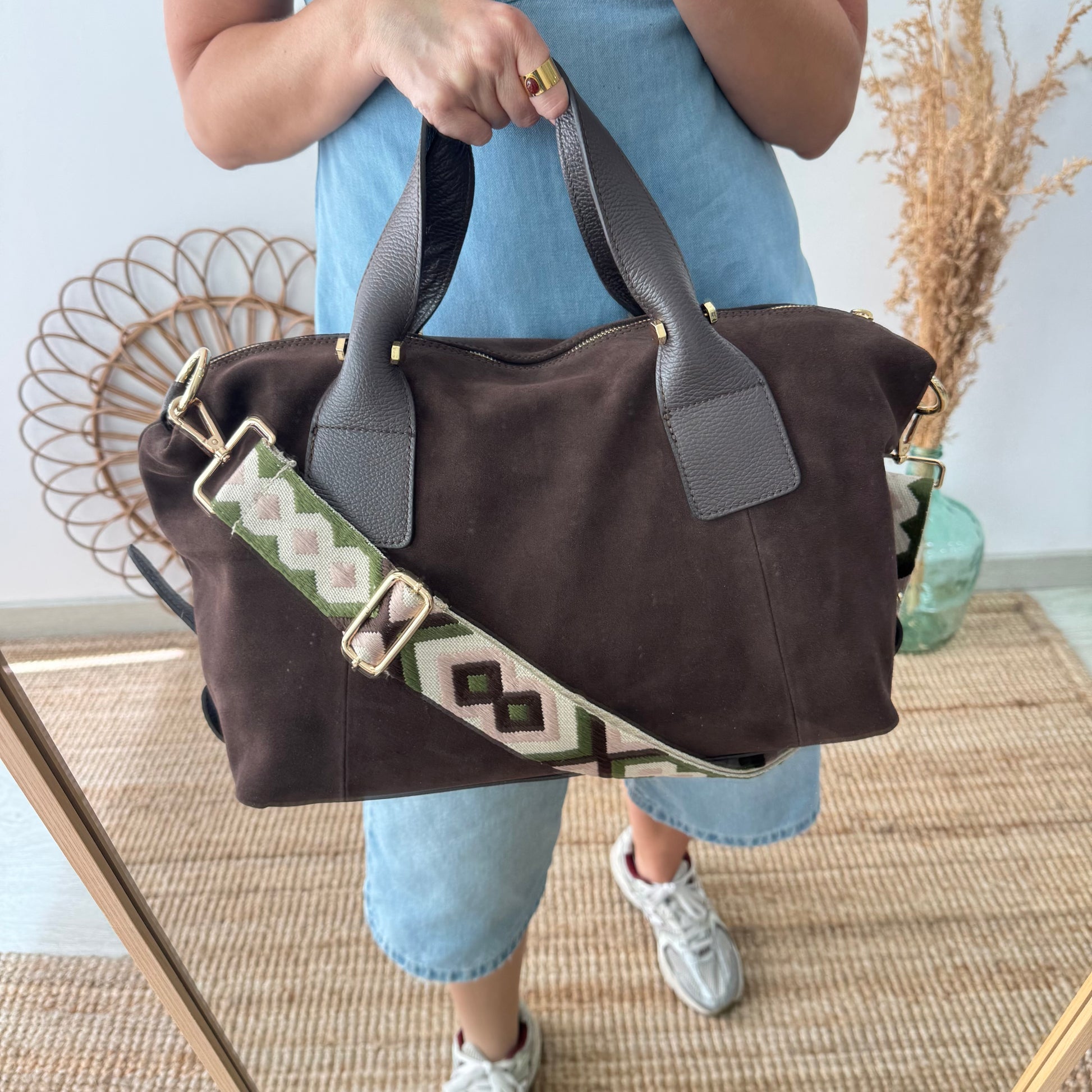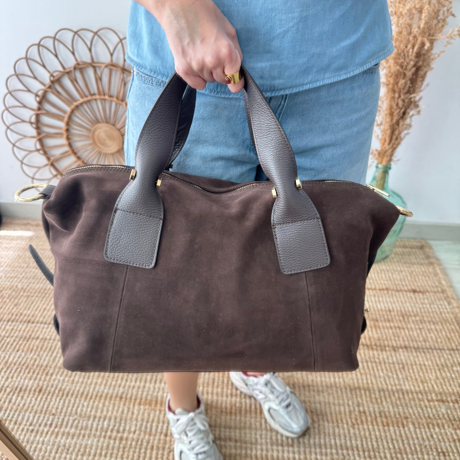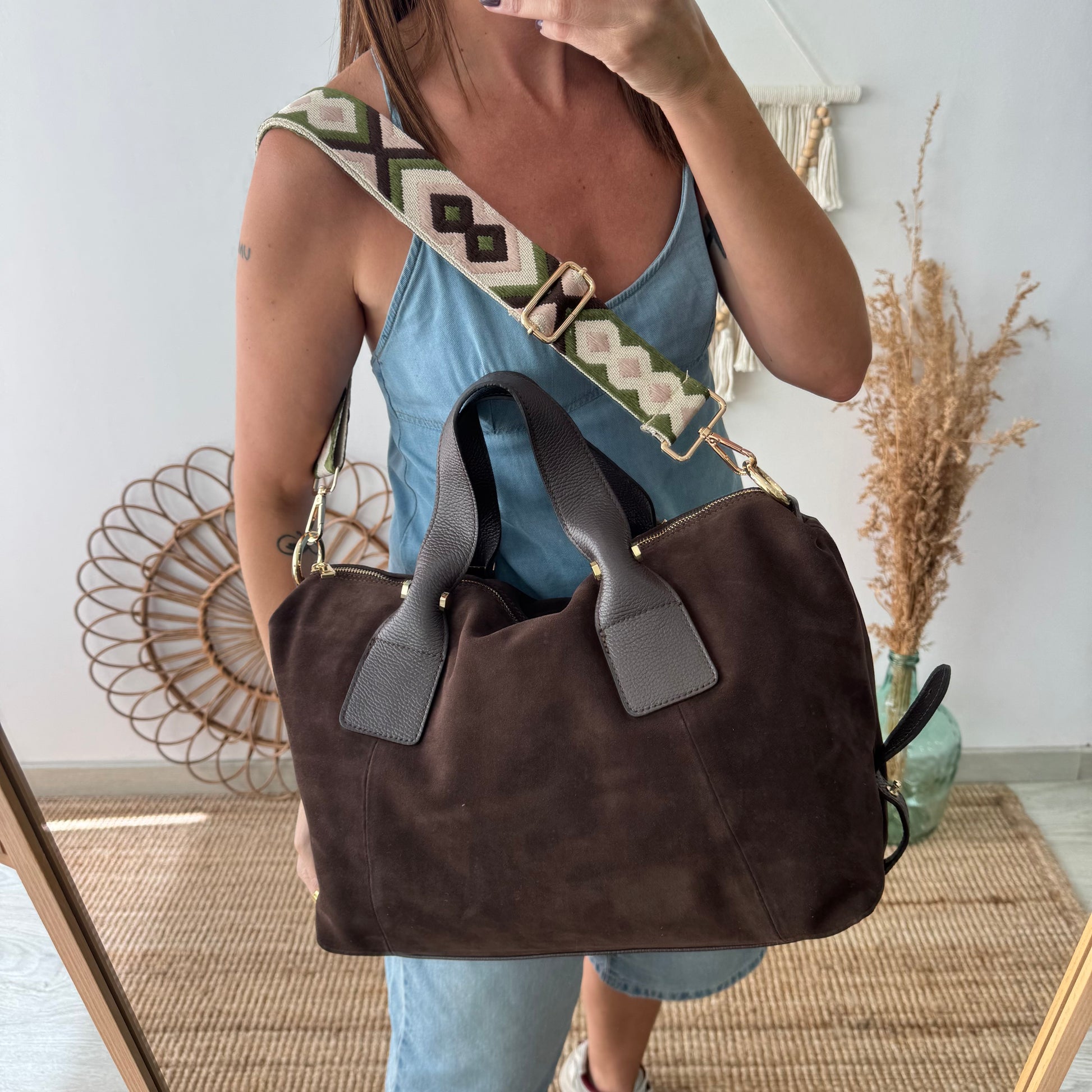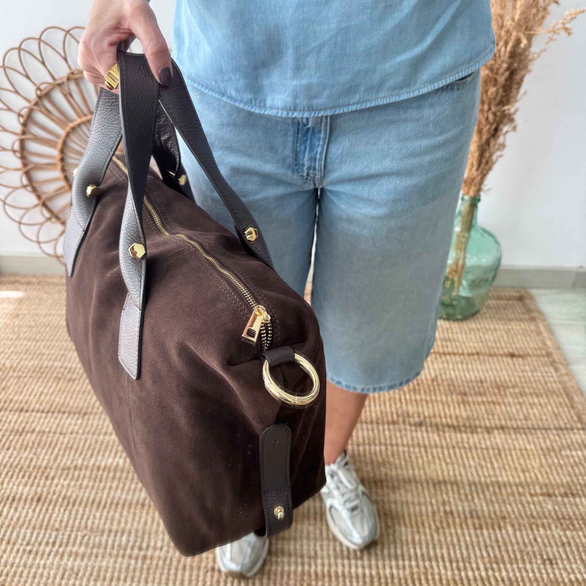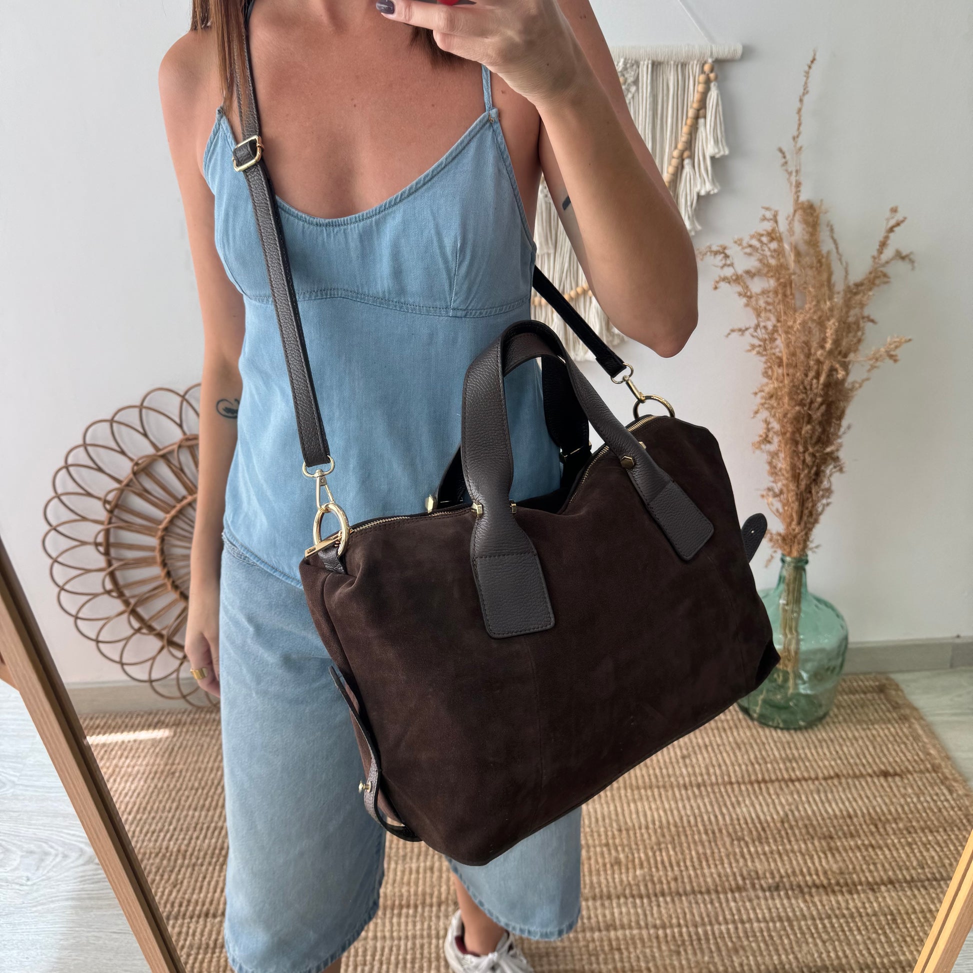 - Materiales y diseño: cuerpo en serraje de tacto aterciopelado con asas y base en piel para mayor resistencia y acabado premium.
