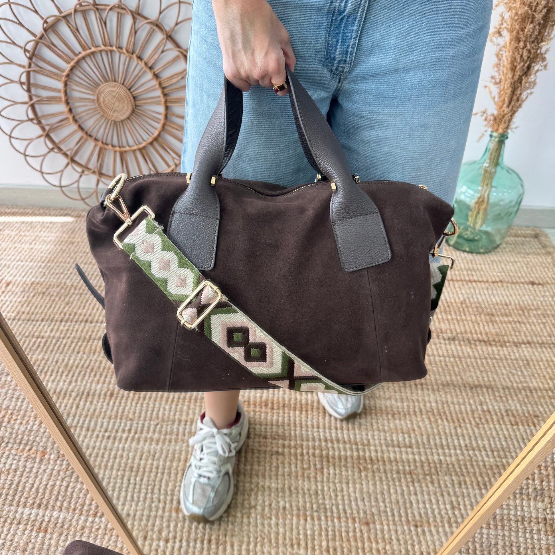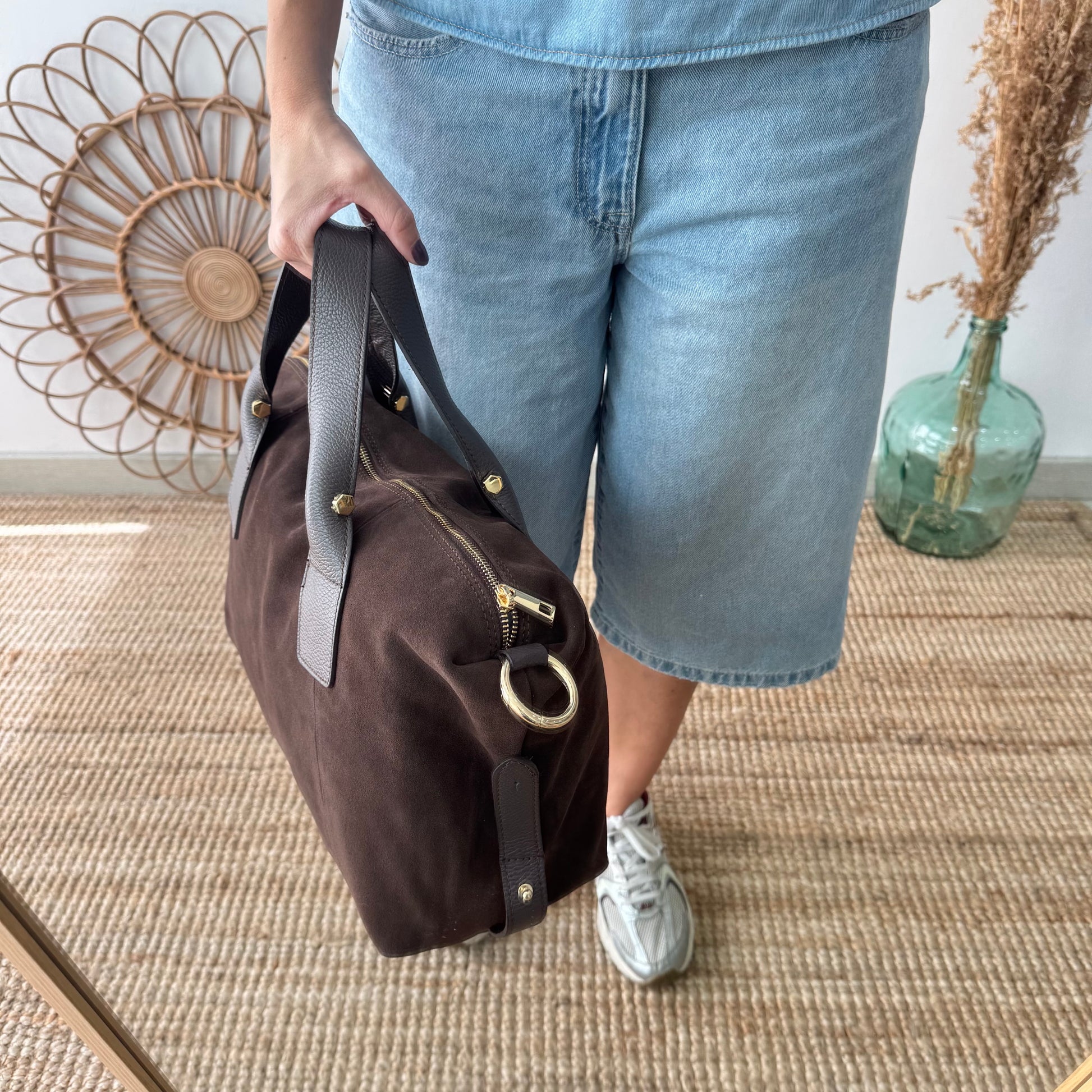 Este bolso bowling combina diseño atemporal y practicidad, convirtiéndose en el accesorio perfecto para tu día a día. Su mezcla de serraje suave y piel resistente aporta un equilibrio entre elegancia y durabilidad.