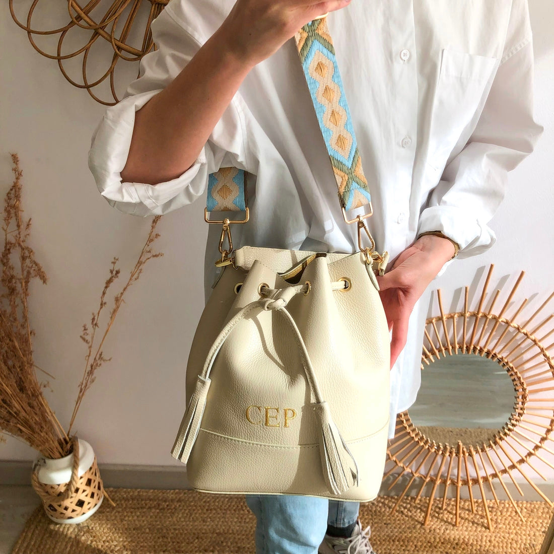 Bolso bucket piel beige grande pompón iniciales bordadas