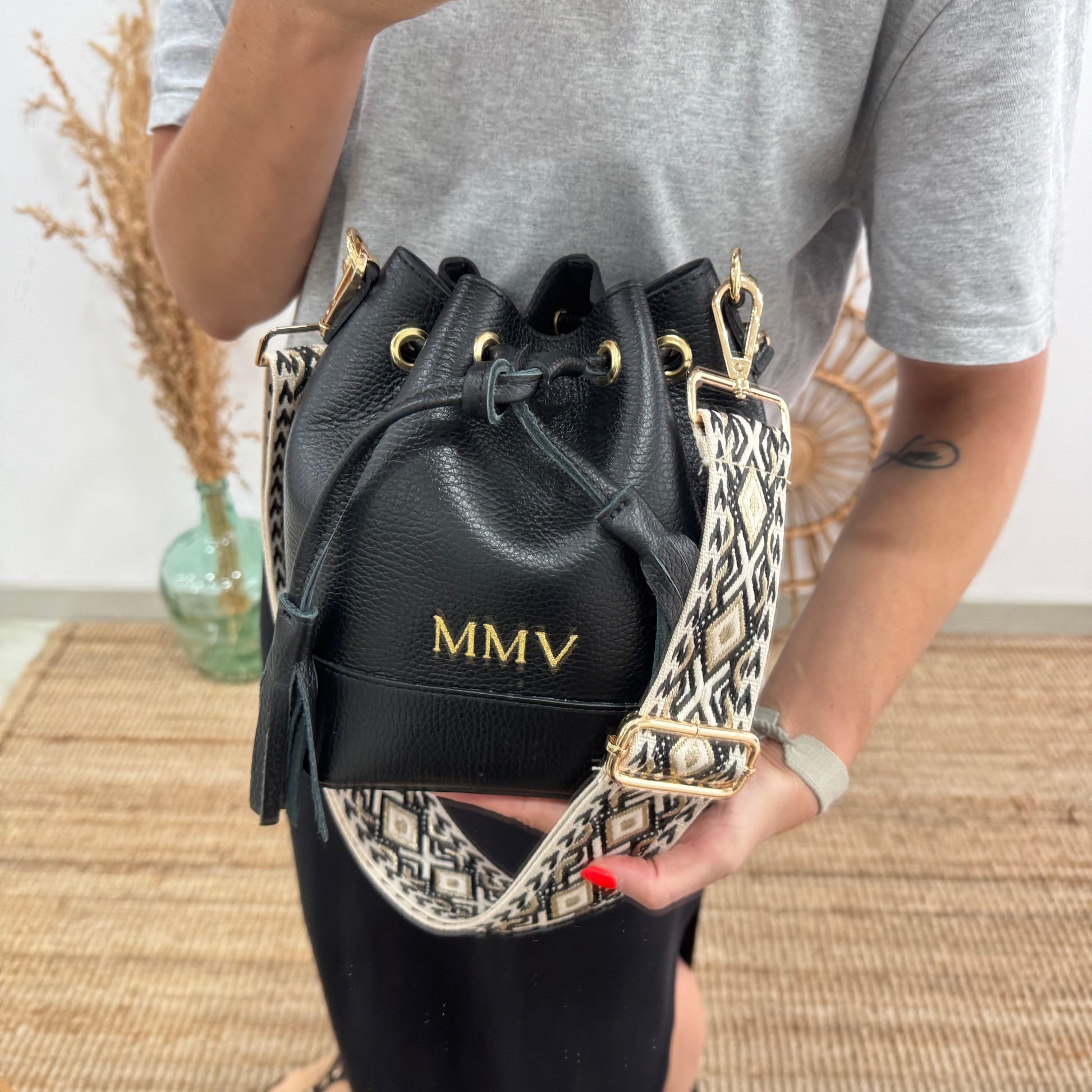 Bolso bucket piel negro pompón iniciales bordadas