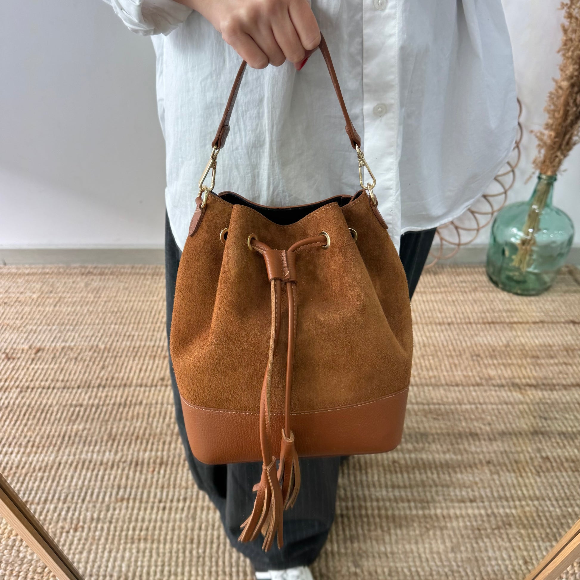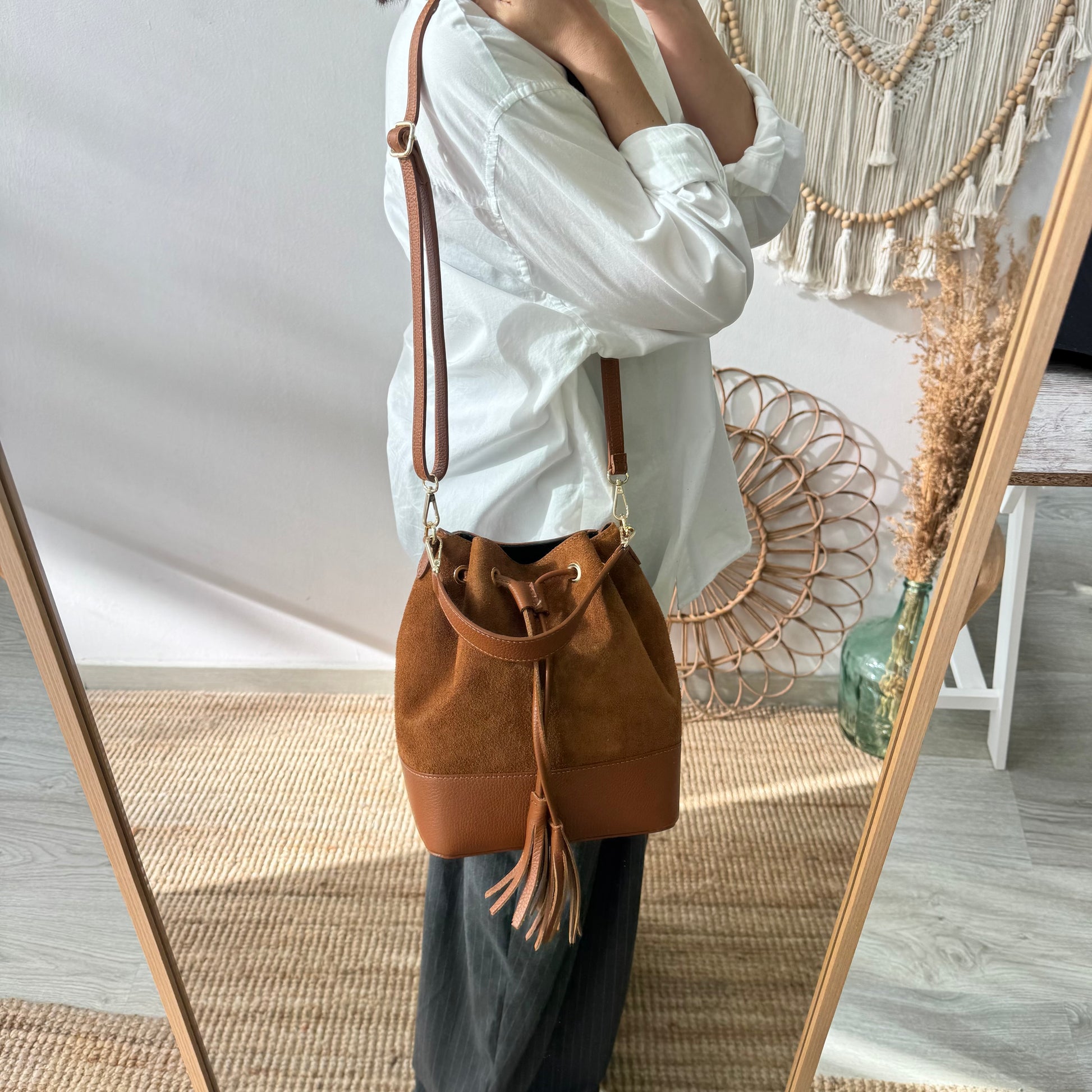 El bolso bucket serraje y piel camel grande es una pieza versátil que une estilo atemporal y practicidad, ideal para elevar cualquier look con un aire elegante y moderno.