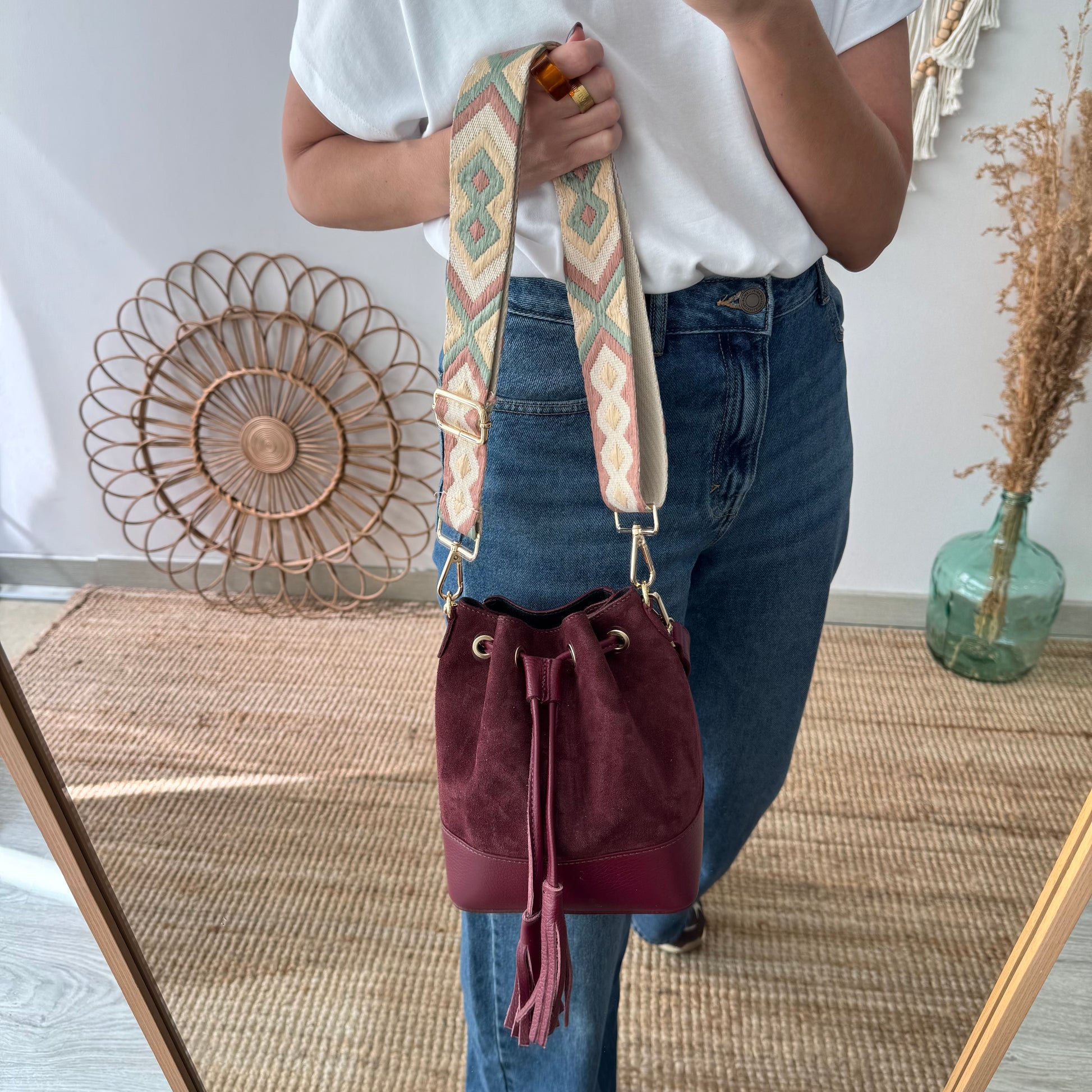 El bolso bucket serraje y piel granate es una pieza versátil que une estilo atemporal y practicidad, ideal para elevar cualquier look con un aire elegante y moderno.