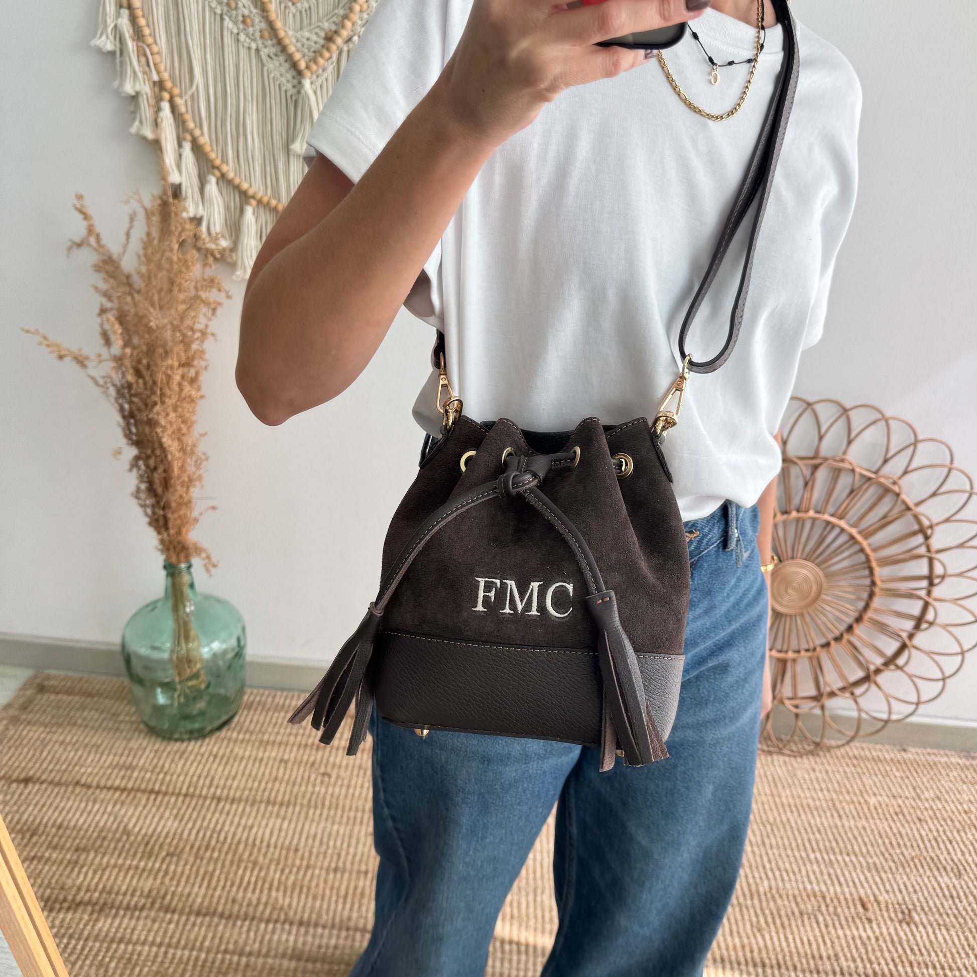 Bolso bucket serraje y piel marrón pompón iniciales bordadas