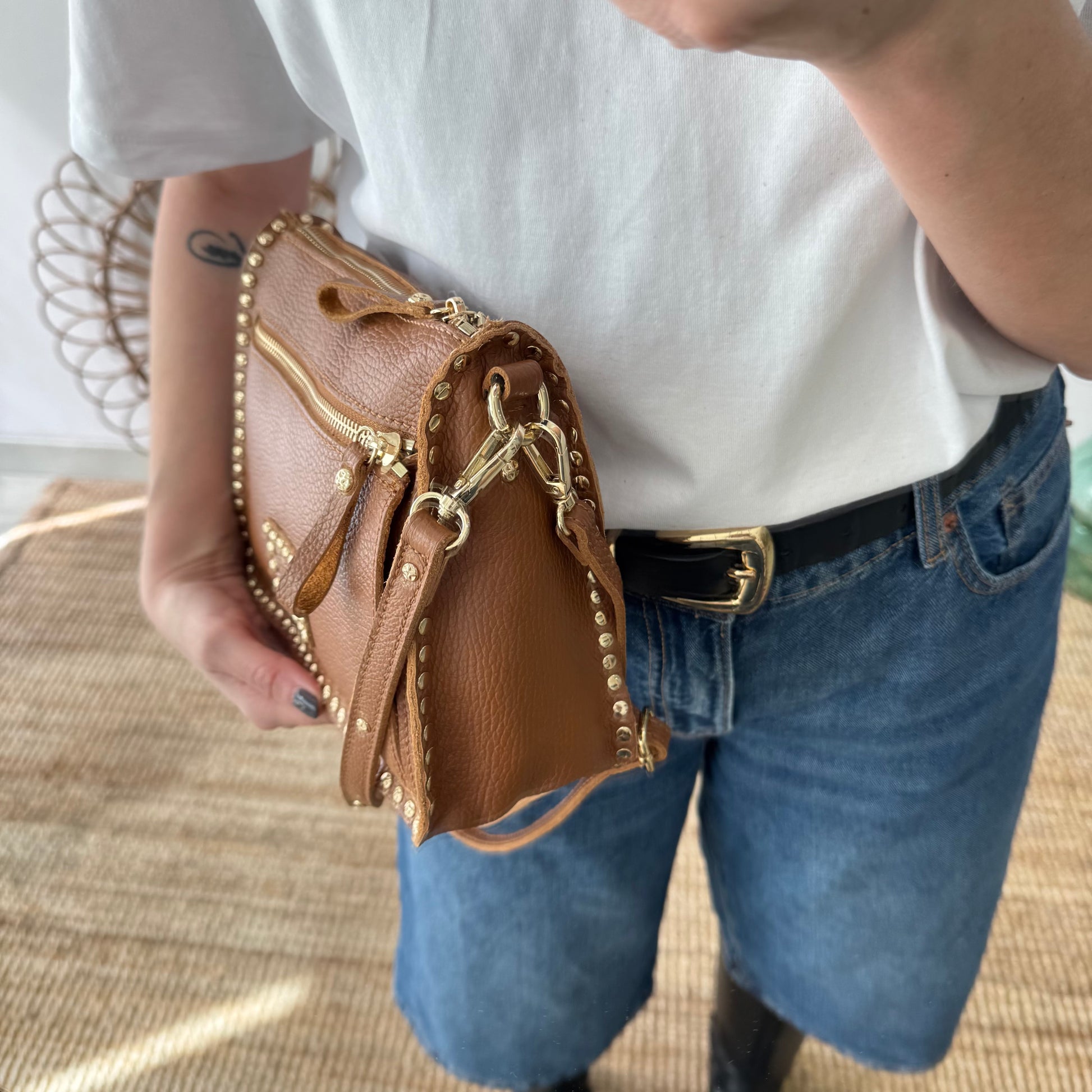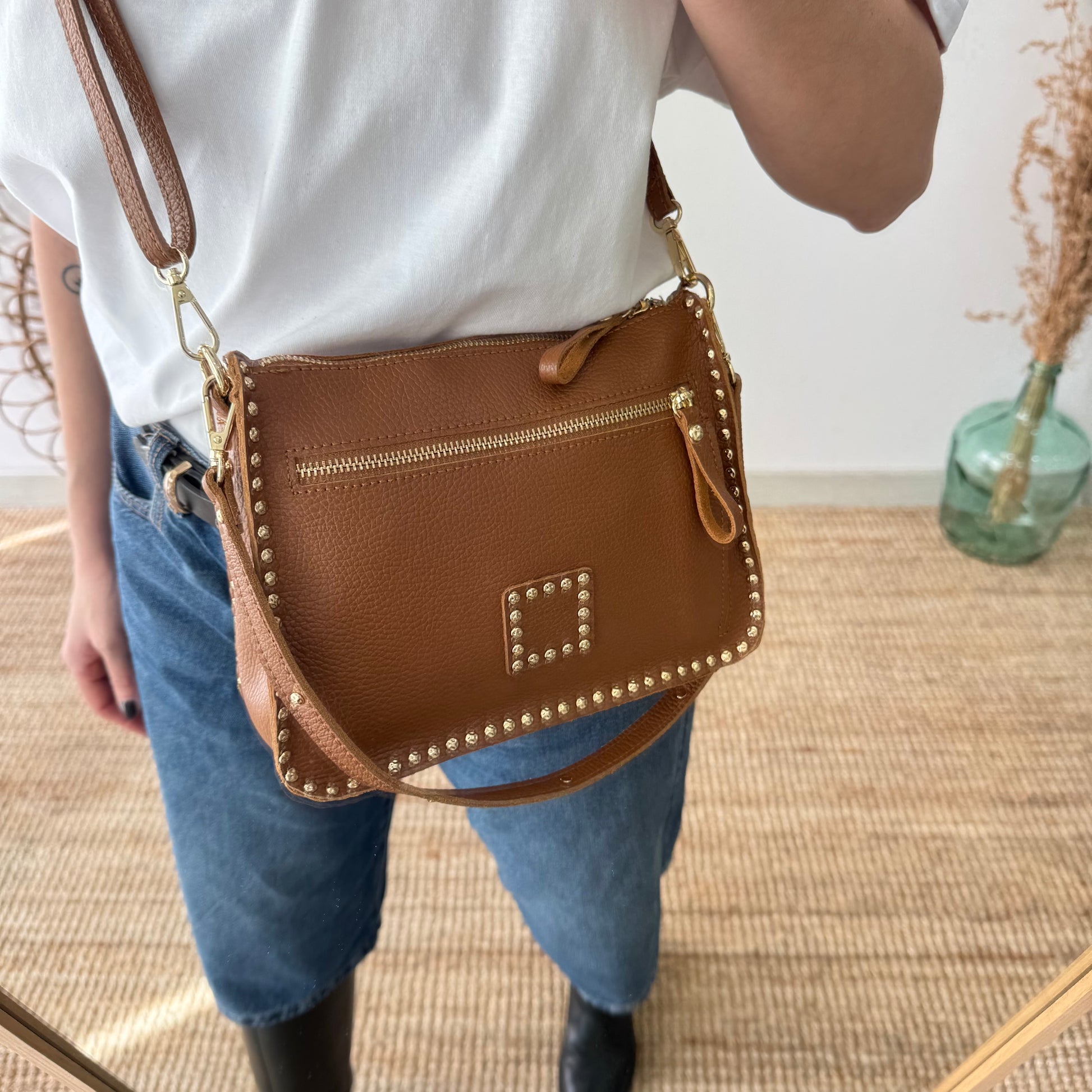 Bolso camel piel tachuelas doradas