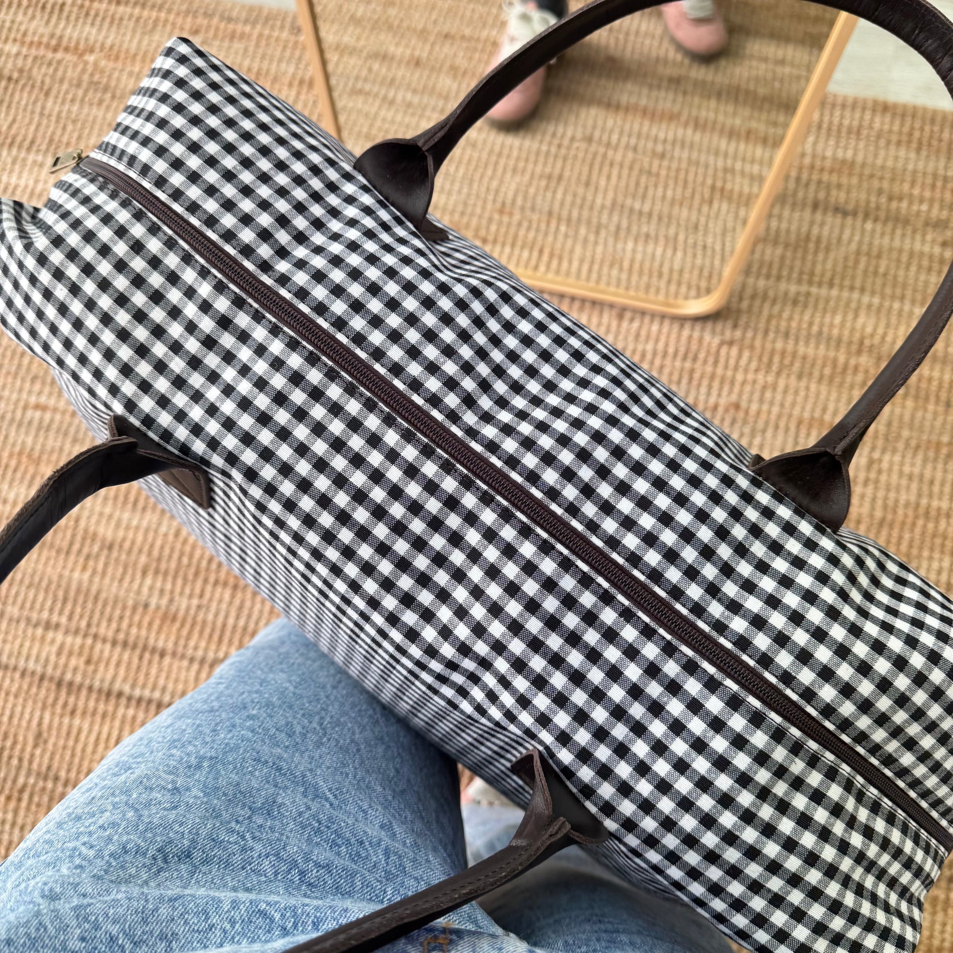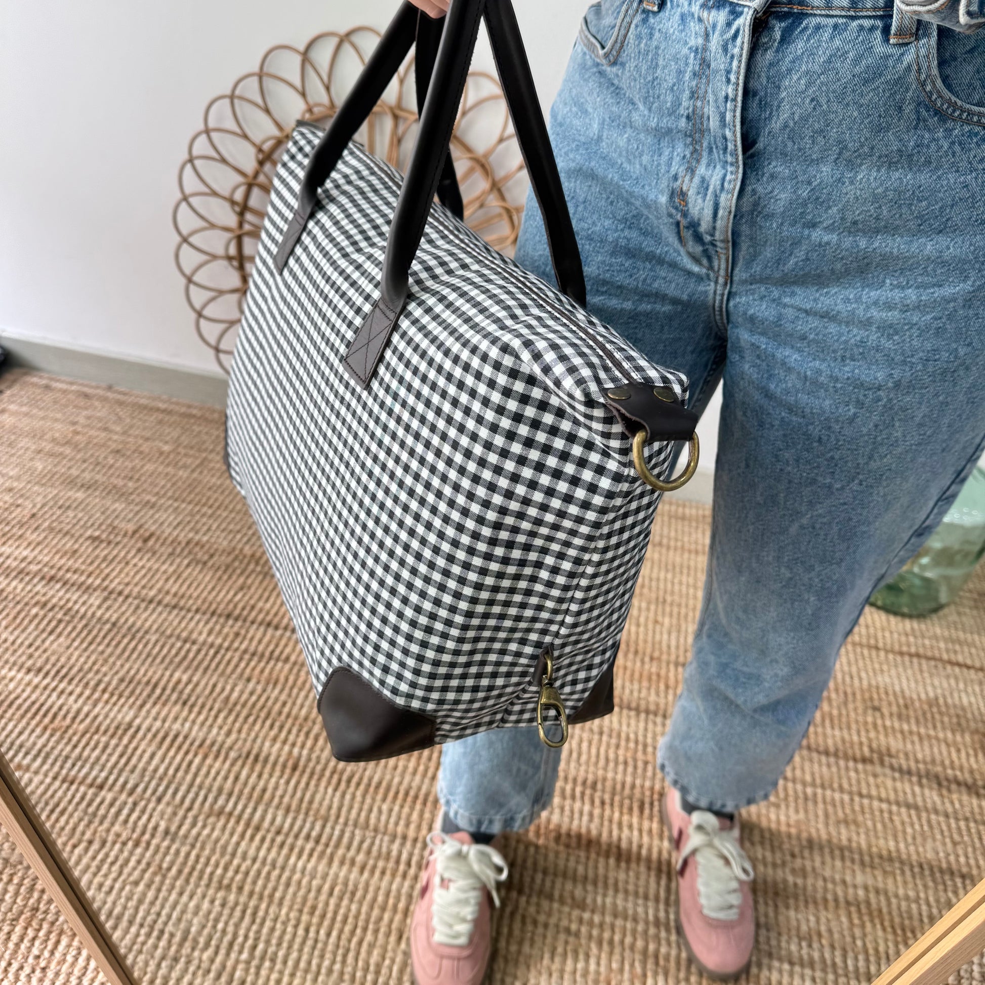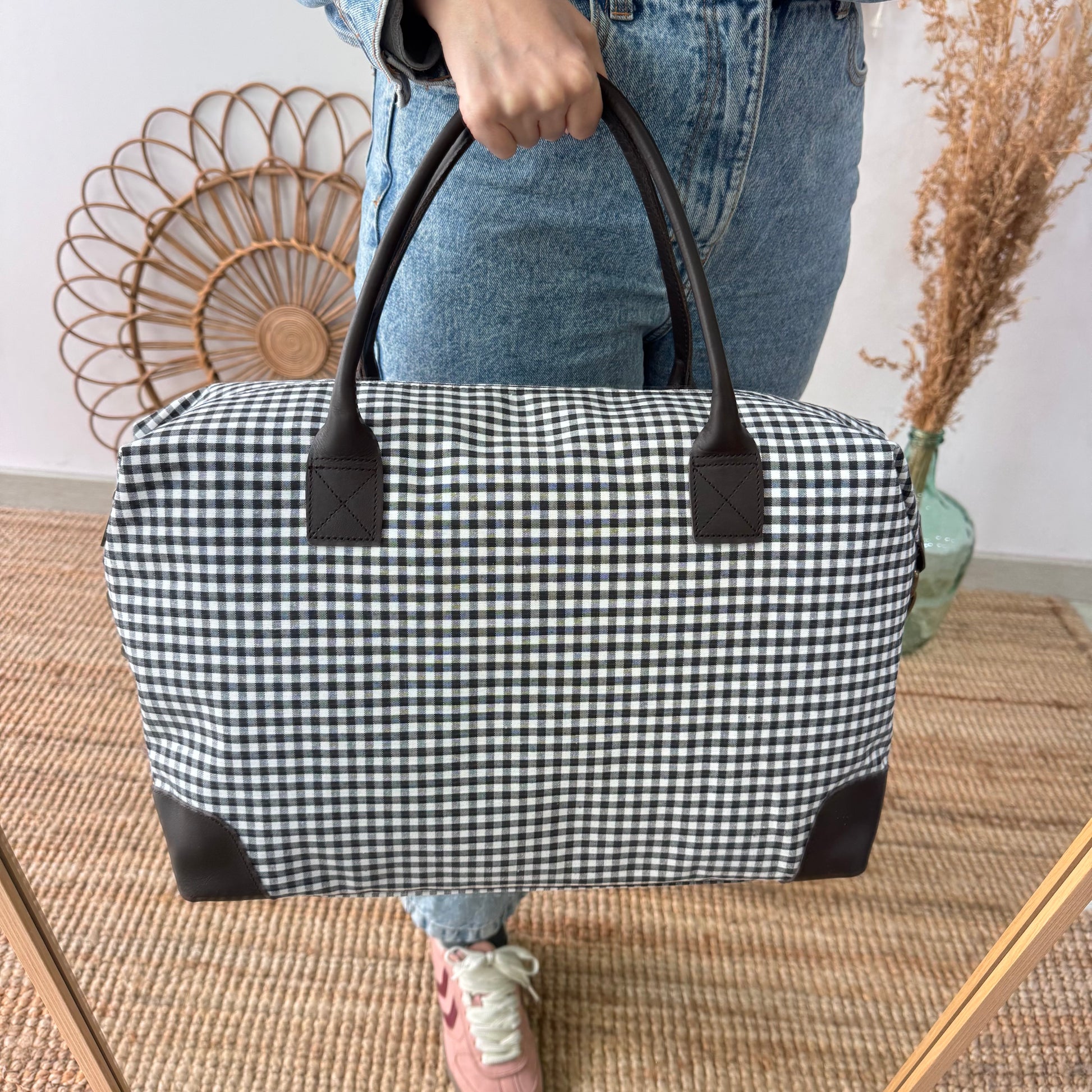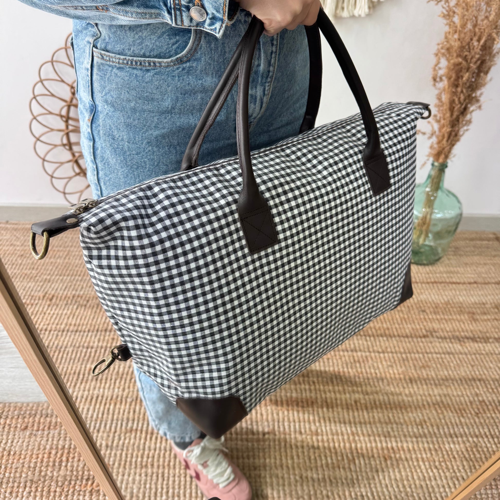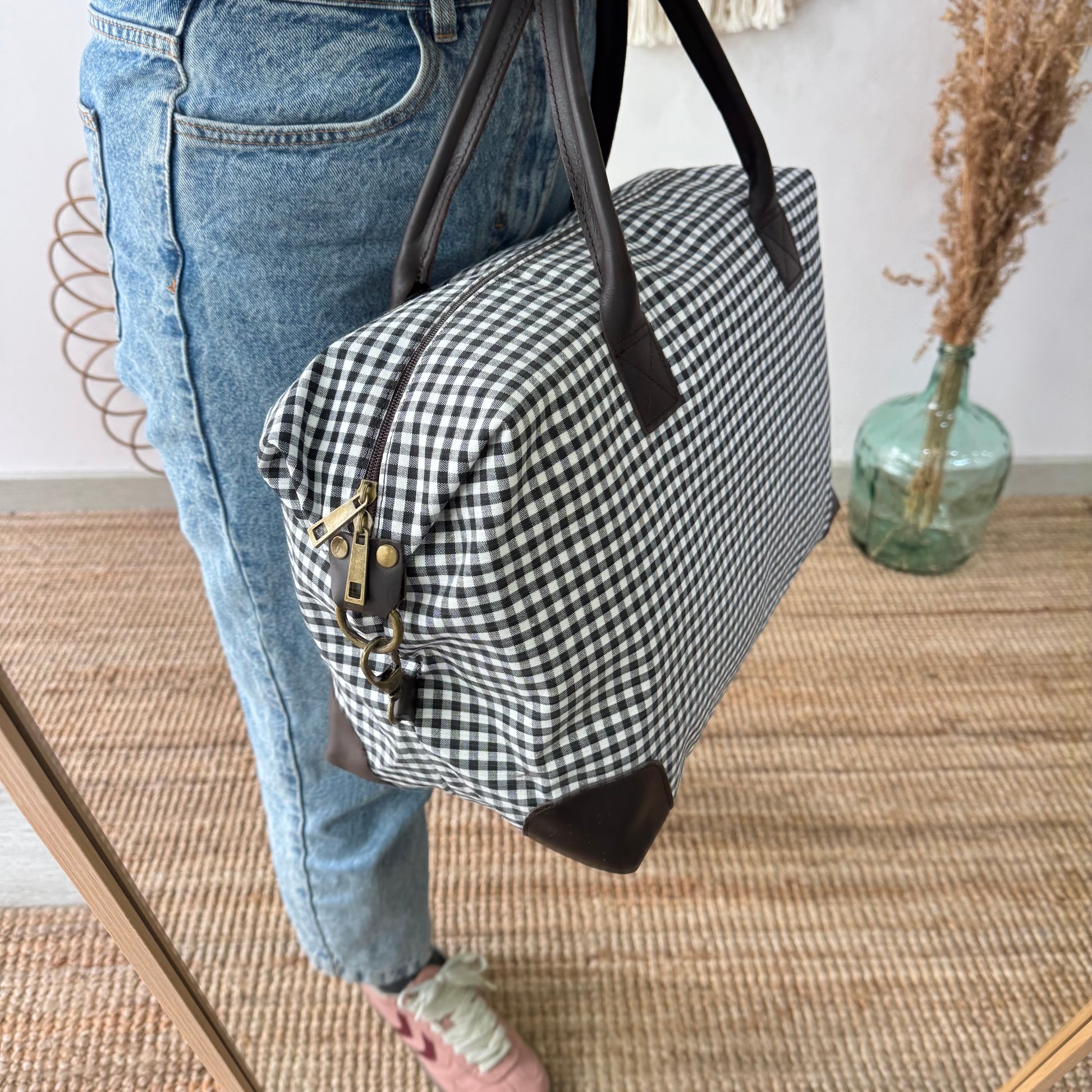 Bolso combinado algodon y piel negro cuadros vichy iniciales bordadas