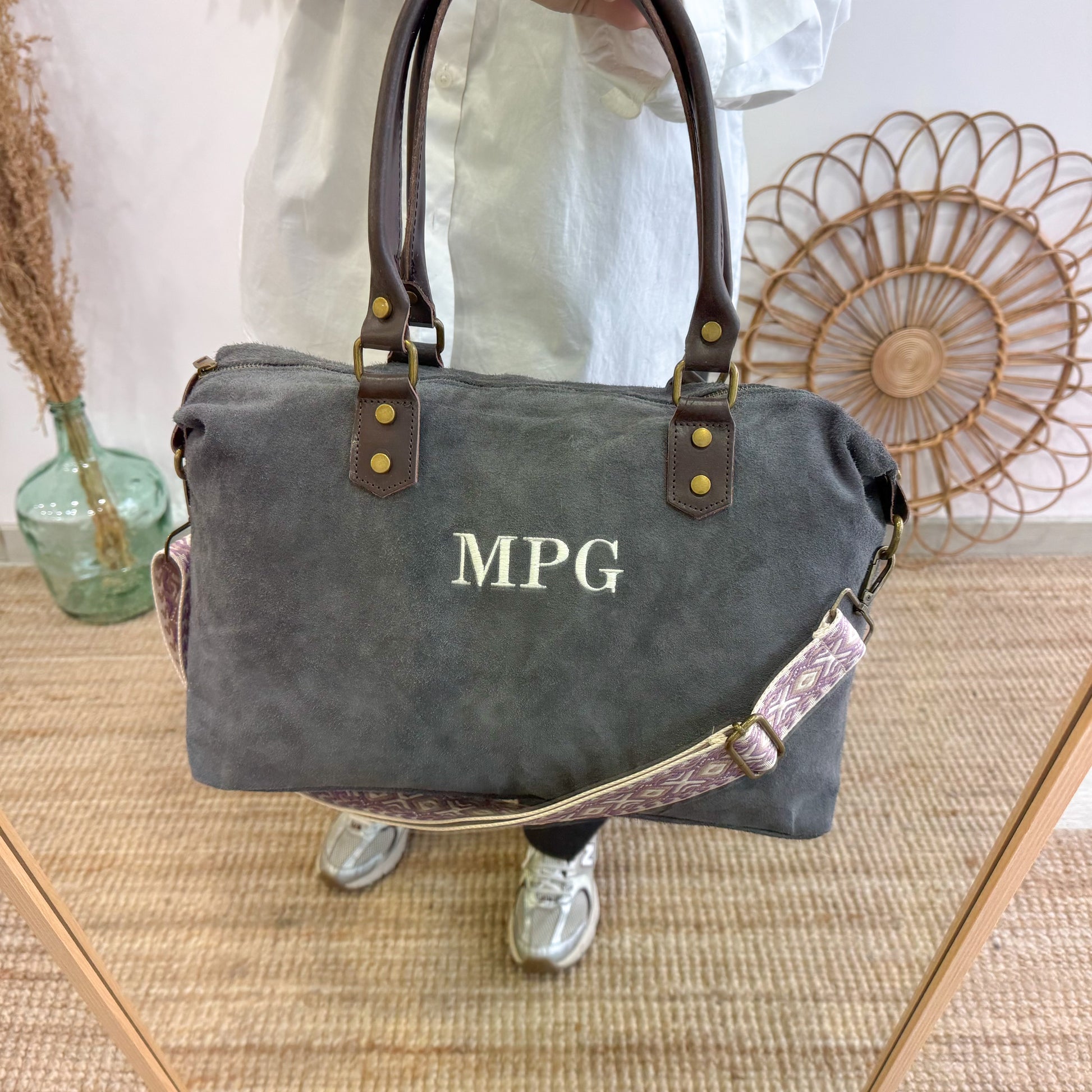Bolso combinado ante y piel gris iniciales bordadas con correa étnica