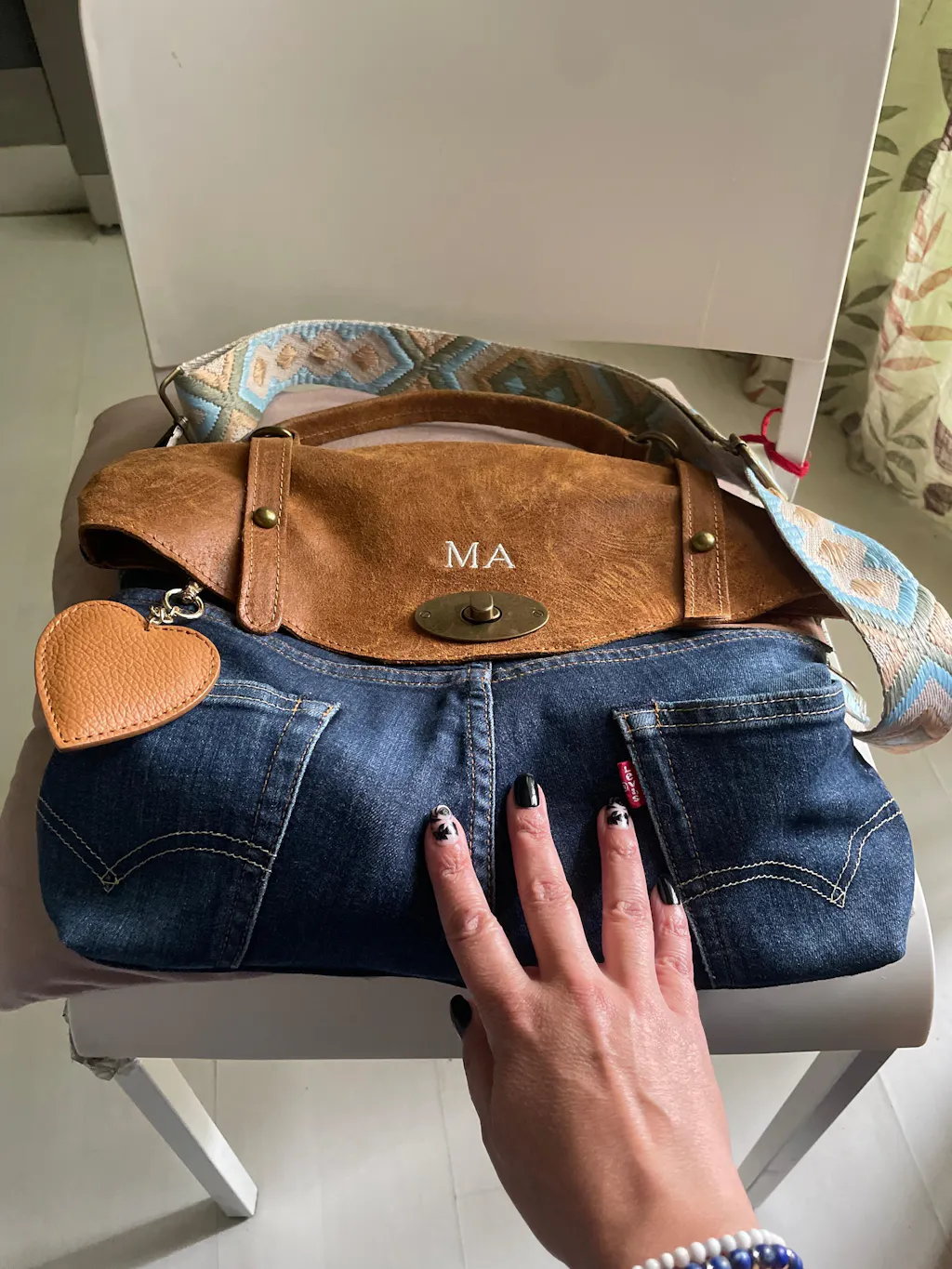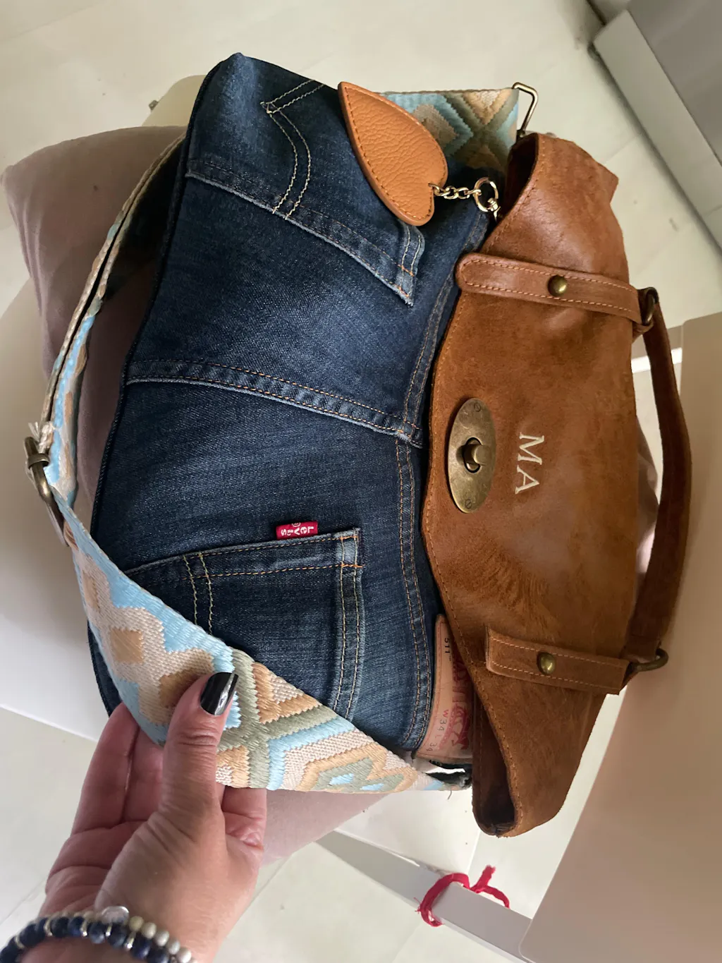 **Este bolso denim esta confeccionado con diferentes partes de un pantalon y puede presentar pequeñas imperfecciones, como deshilachados o pequeños rotos del pantalón original, además de cambios de tonalidad (más claro, más oscuro), estas características son consideradas como cualidad y no tendrán la consideración de defectos o taras.