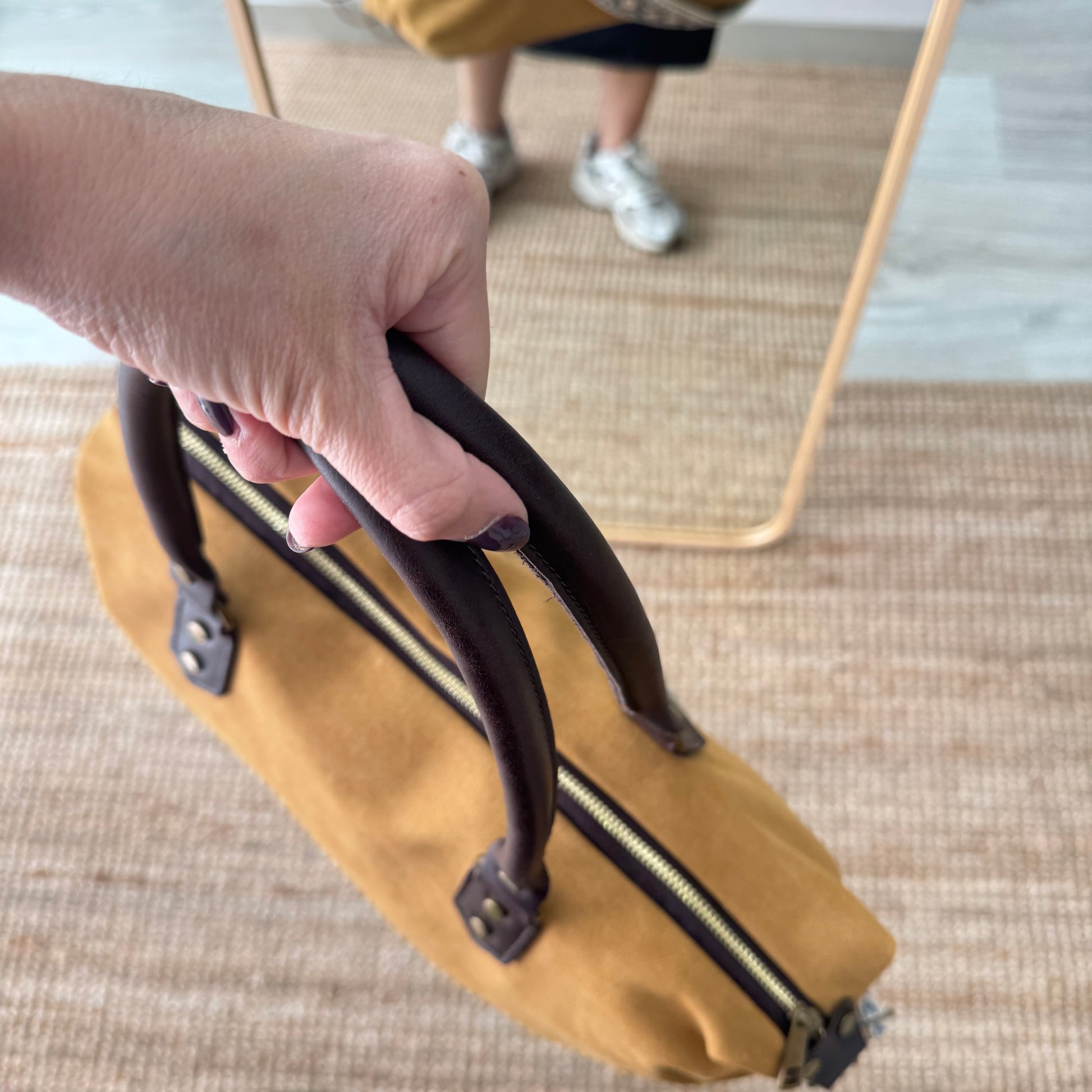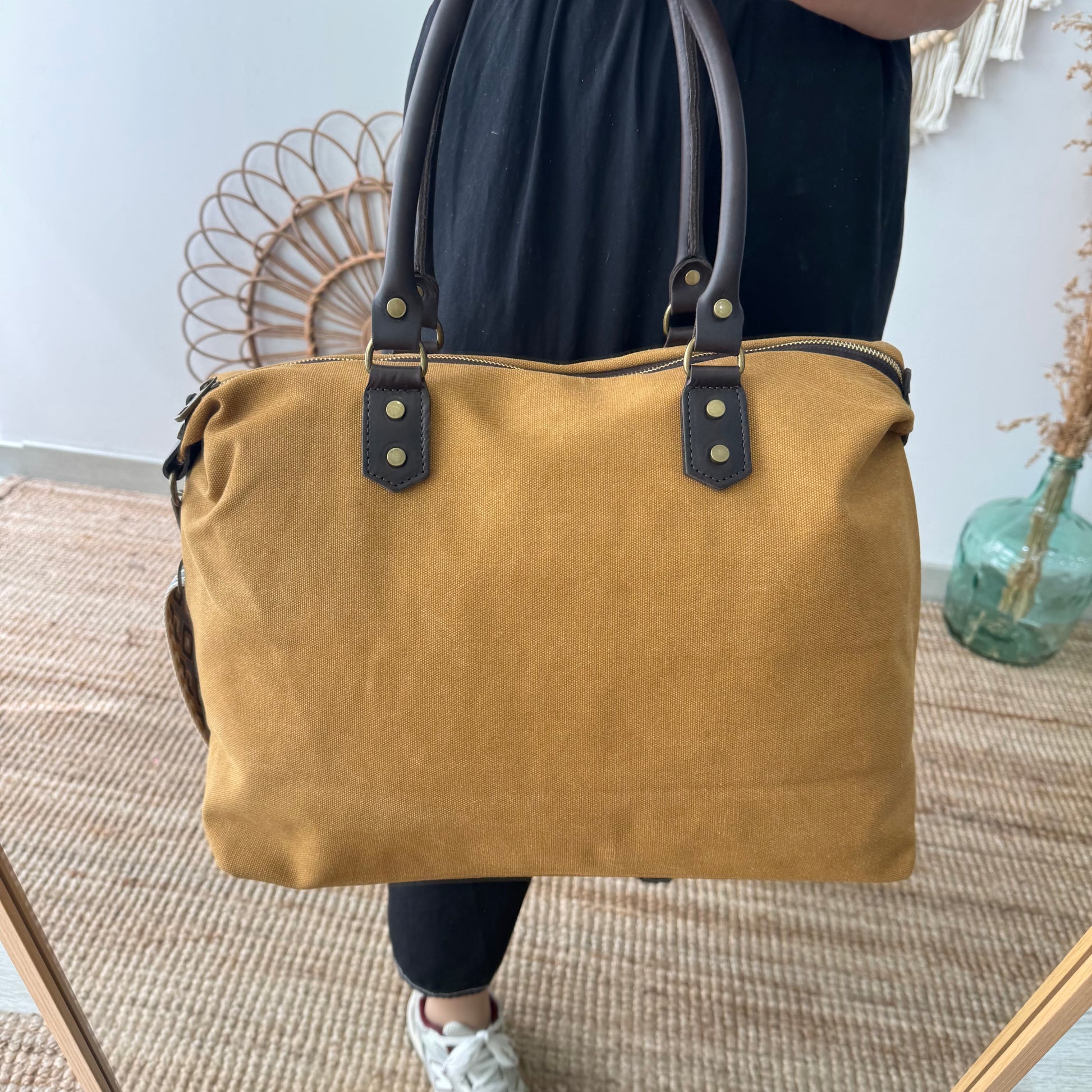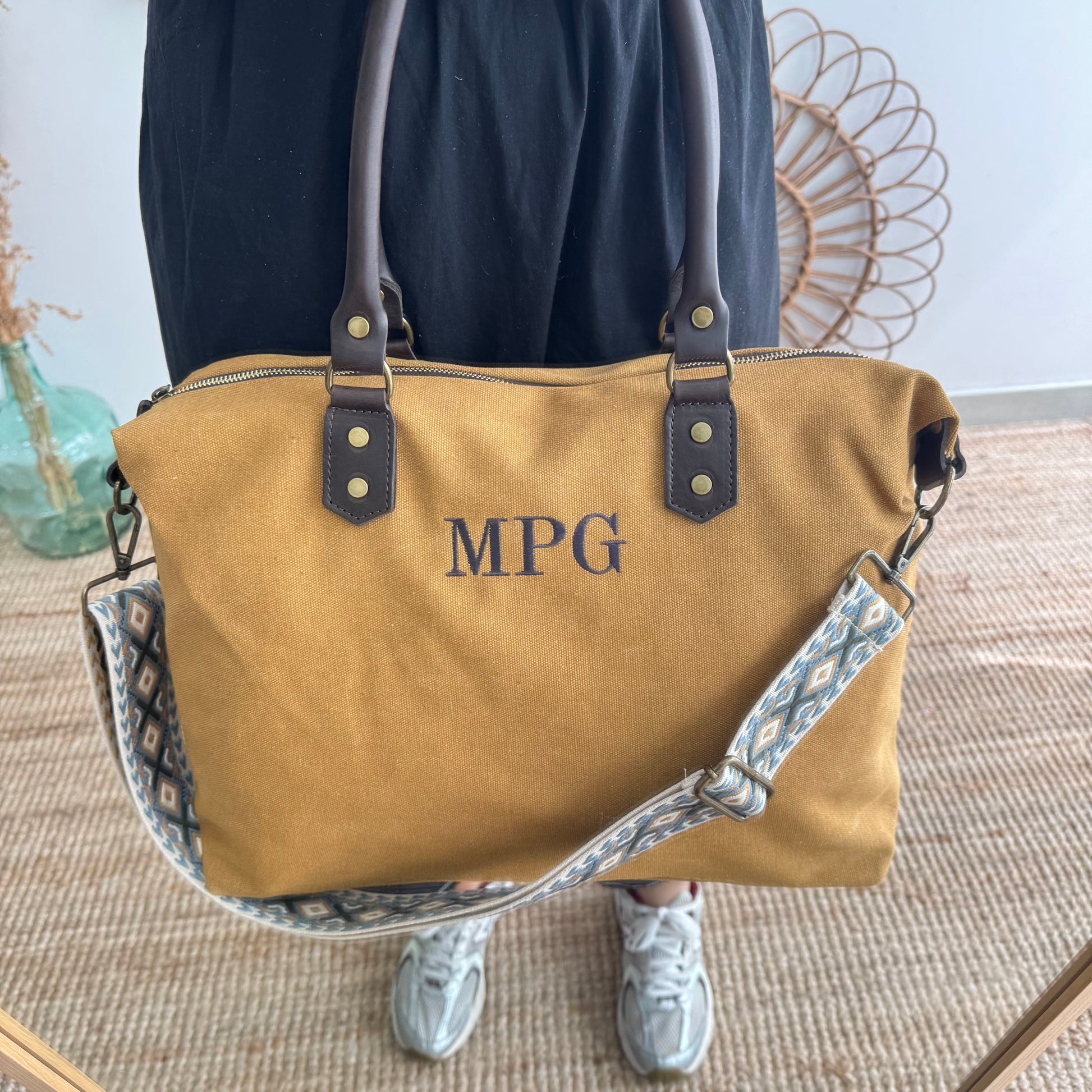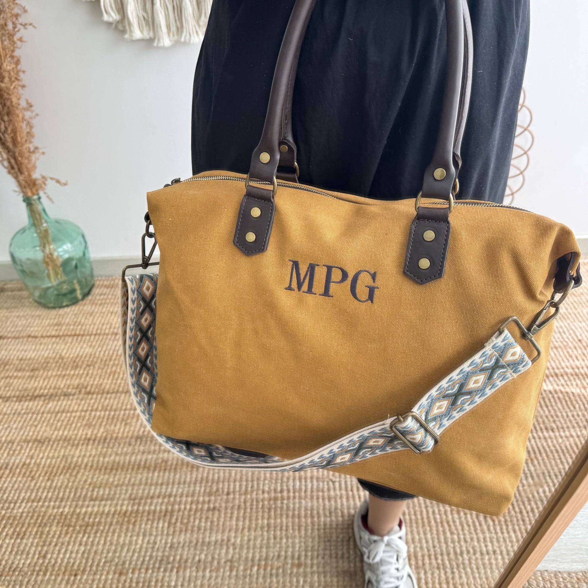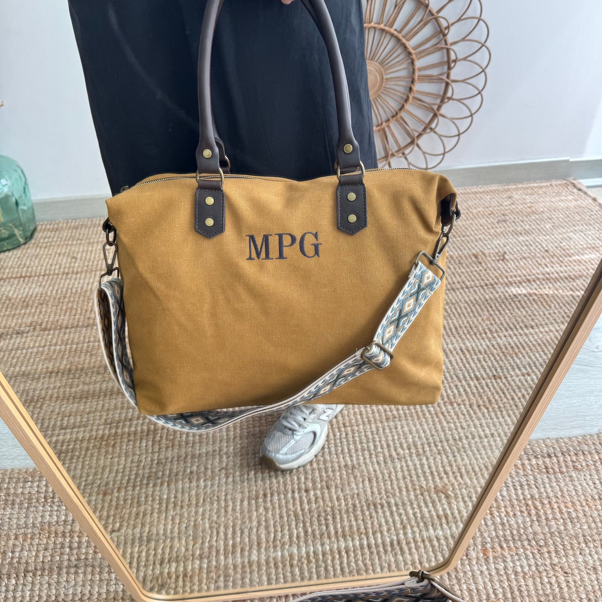 Bolso de loneta y piel, en camel Dos asas fijas de piel color marrón y una asa bandolera extraíble. Personalizado con dos o tres iniciales bordadas. Forro interior con bolsillo (también con cremallera).