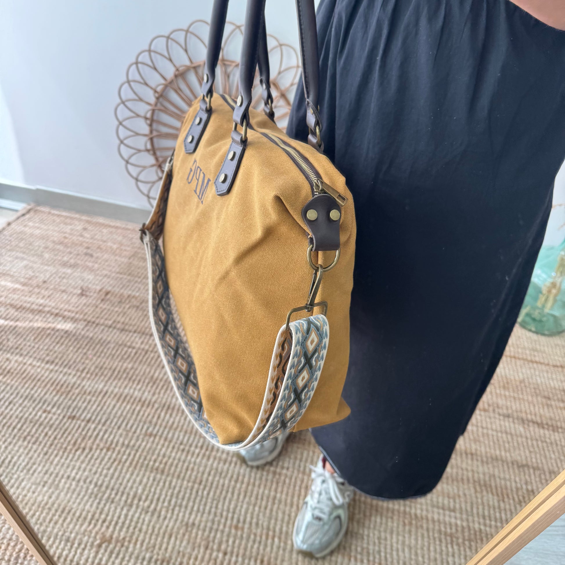 Bolso combinado loneta y piel camel iniciales bordadas con correa étnica