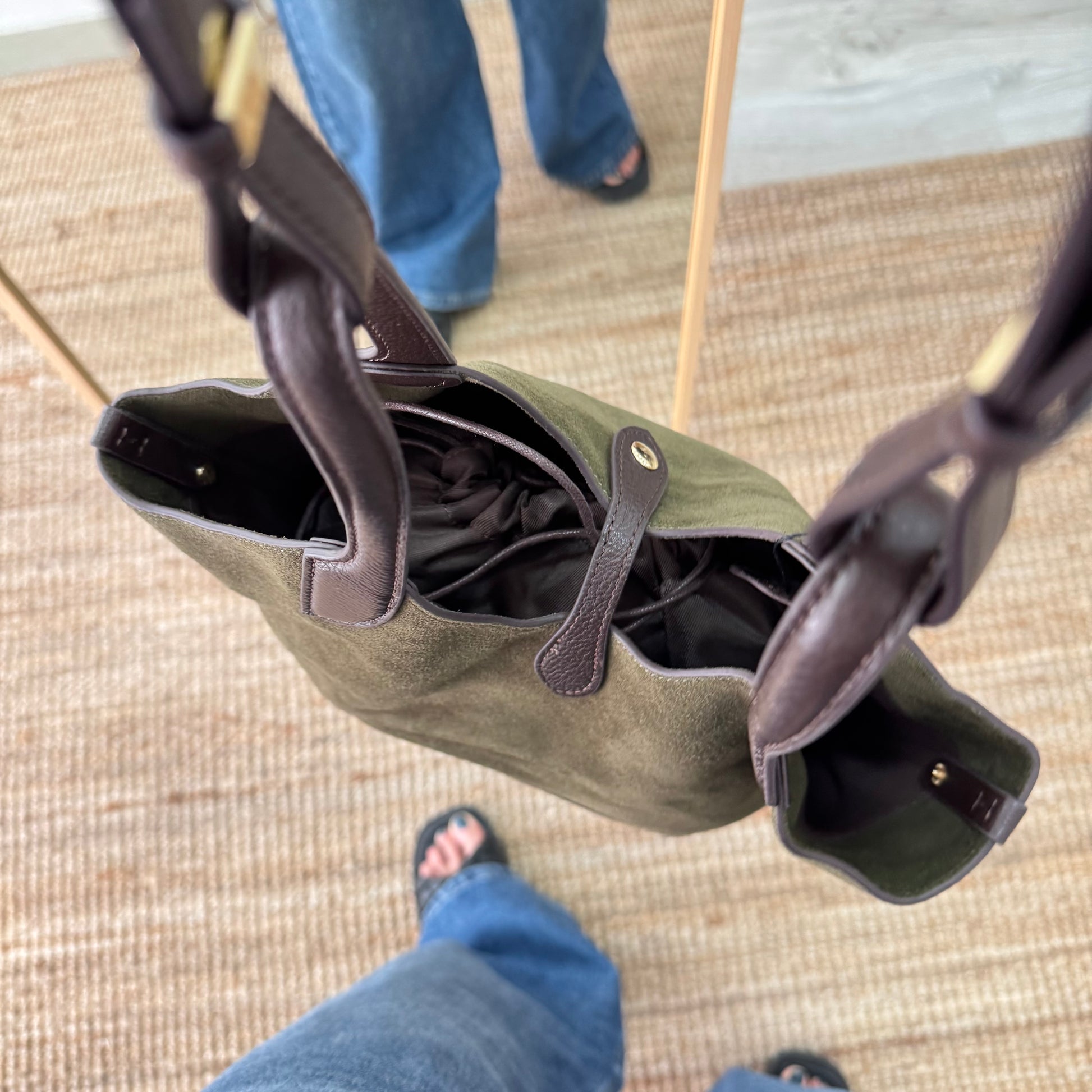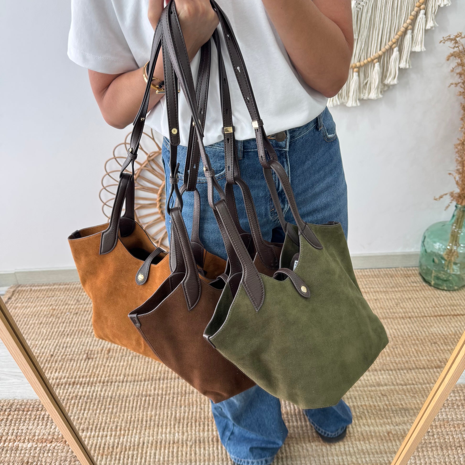 Bolso combinado en serraje y piel de color caqui con apliques marrones, perfecto para acompañarte en tu día a día con estilo y practicidad.