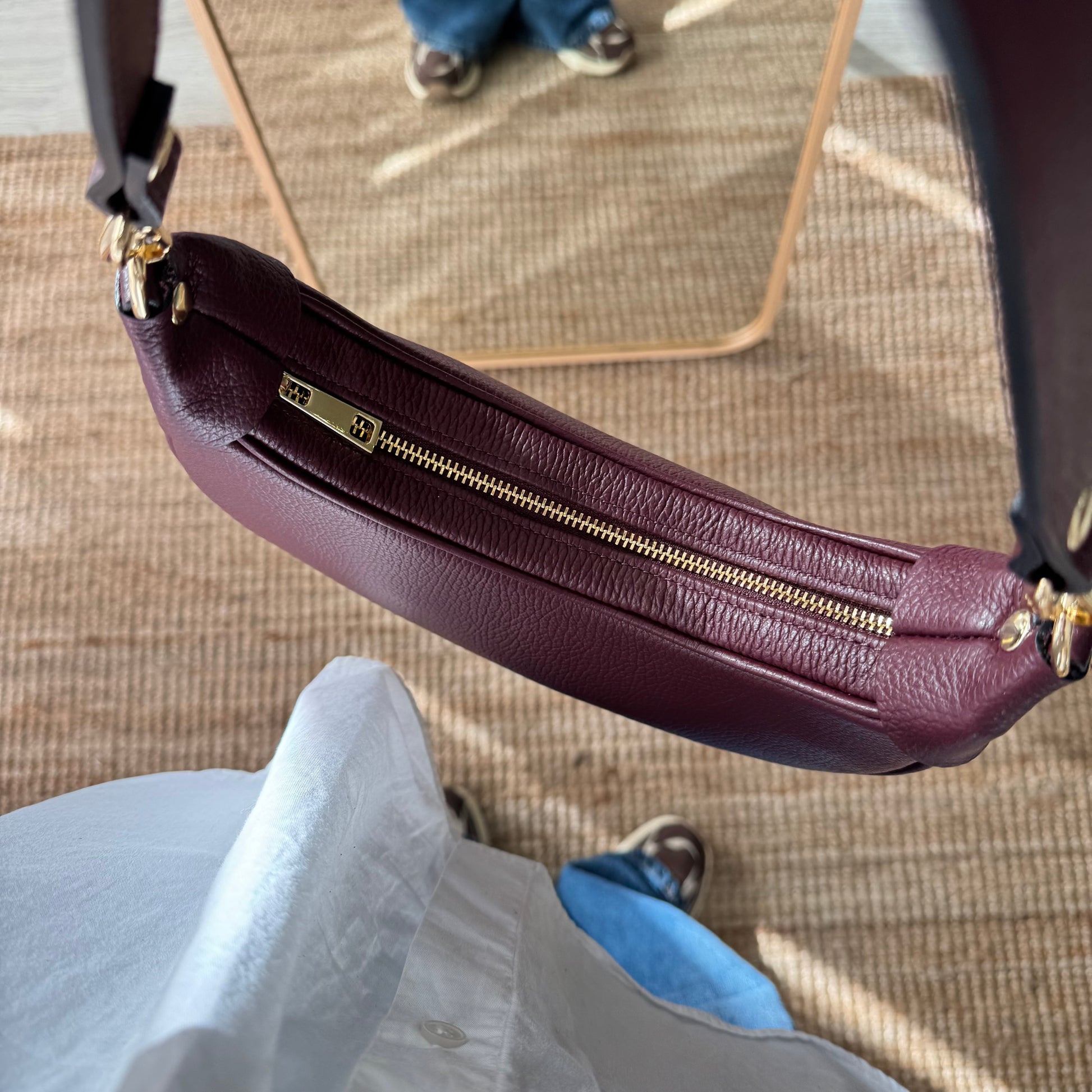 Asa de mano y correa fina extensible para llevar cruzada, las dos en piel de color granate.