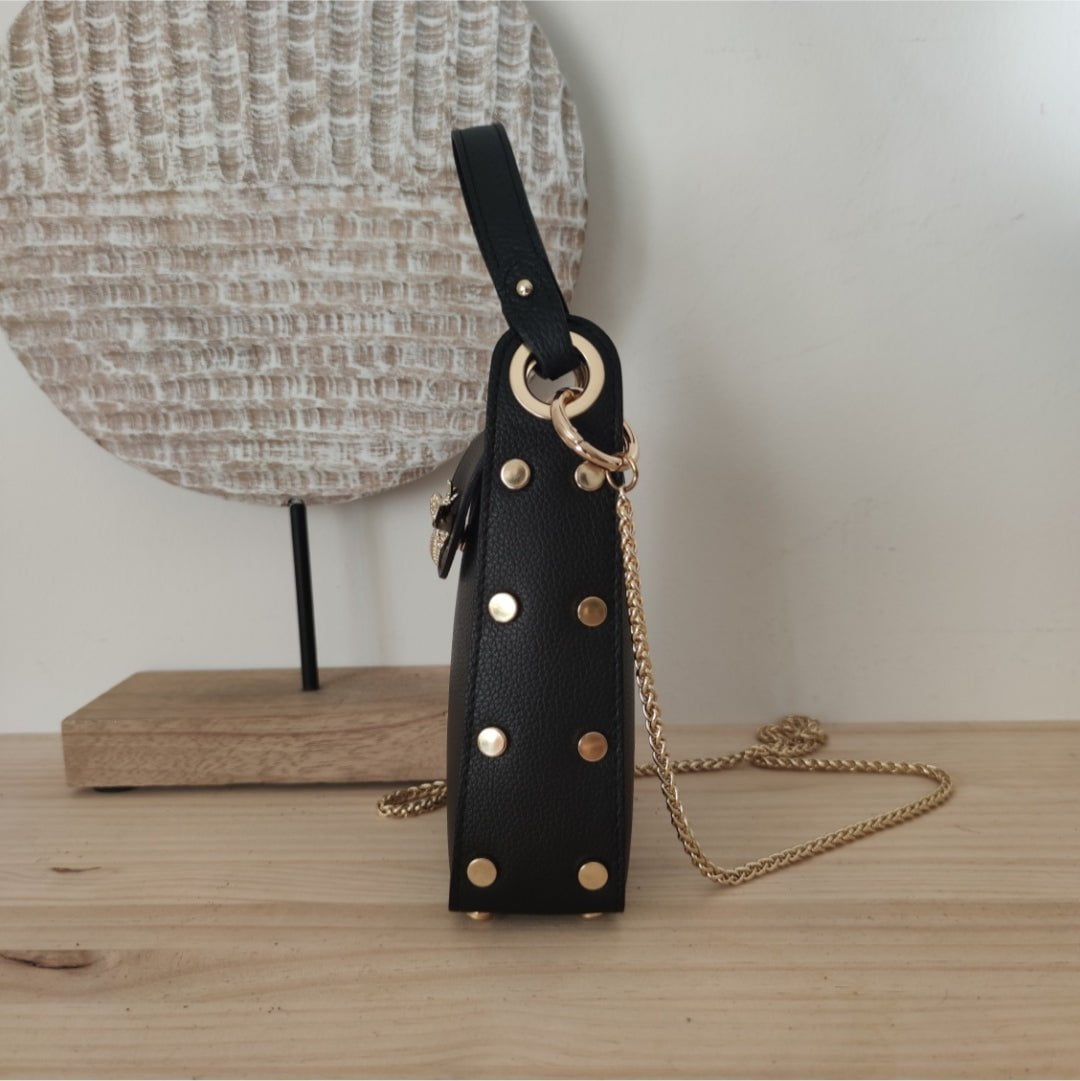 Nuestro bolsito de piel con solapa en color negro con detalles metálicos a los lados.
