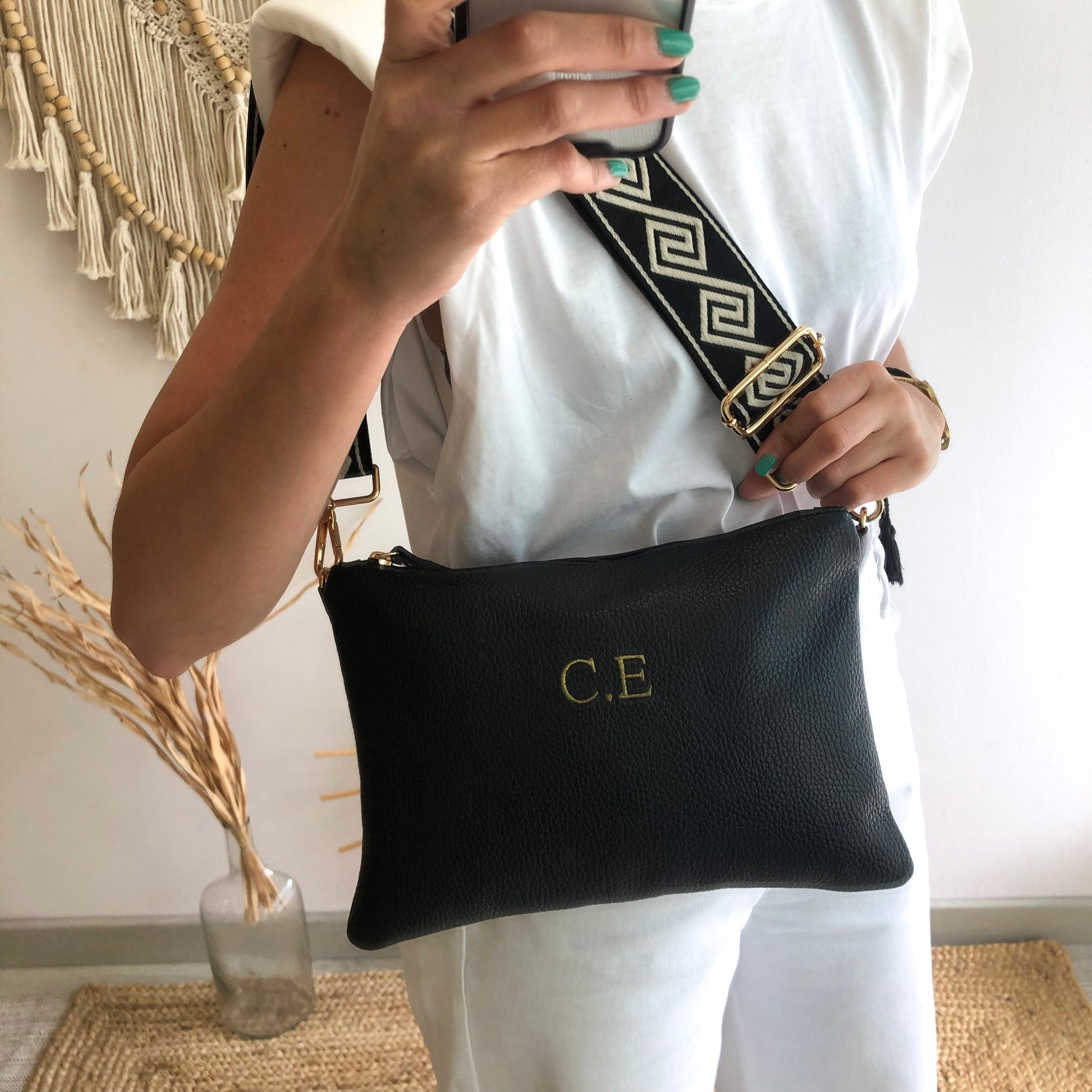 Bolso piel bandolera iniciales bordadas negro