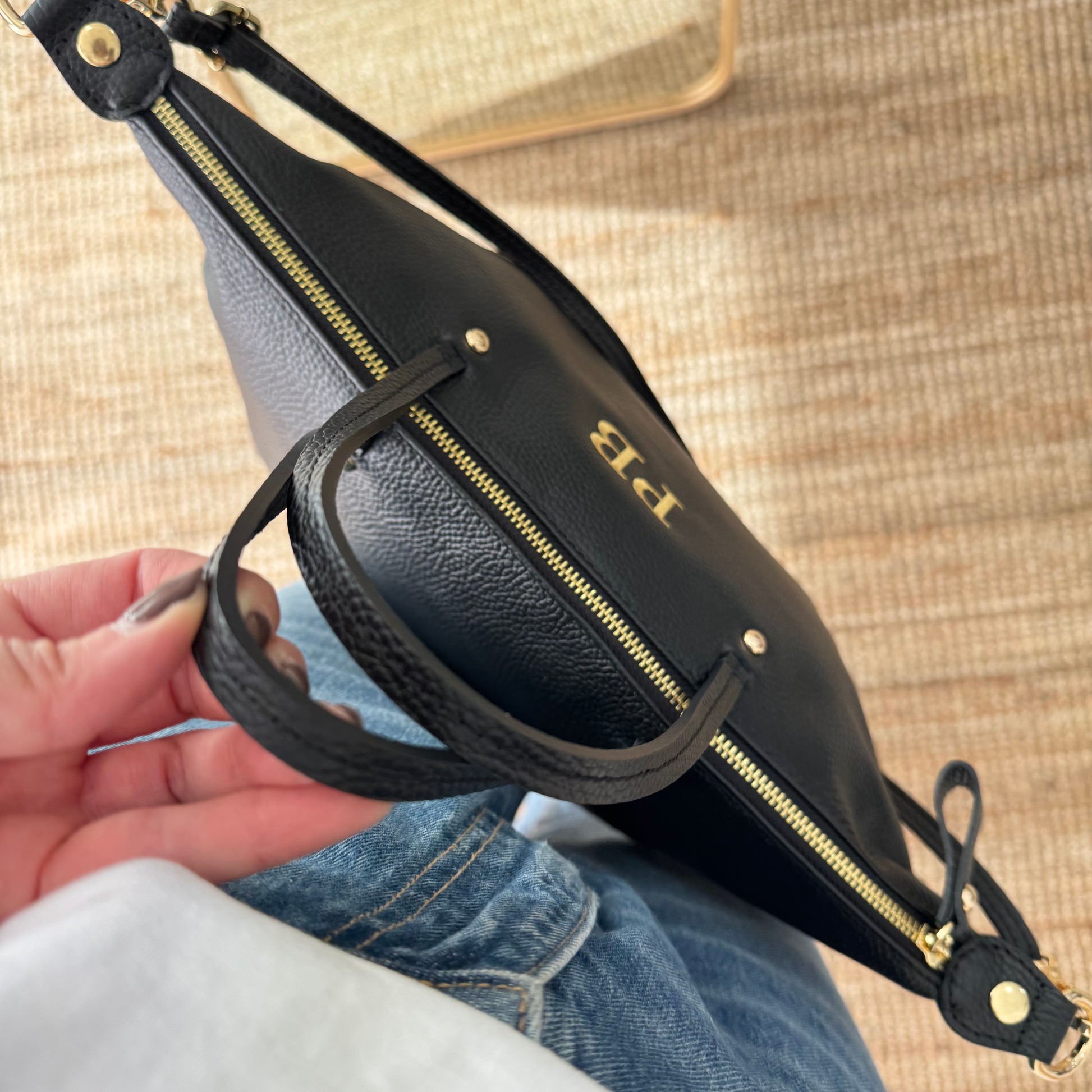 Dos asas pequeñas fijas de piel y una asa bandolera extraíble en piel negro a conjunto.