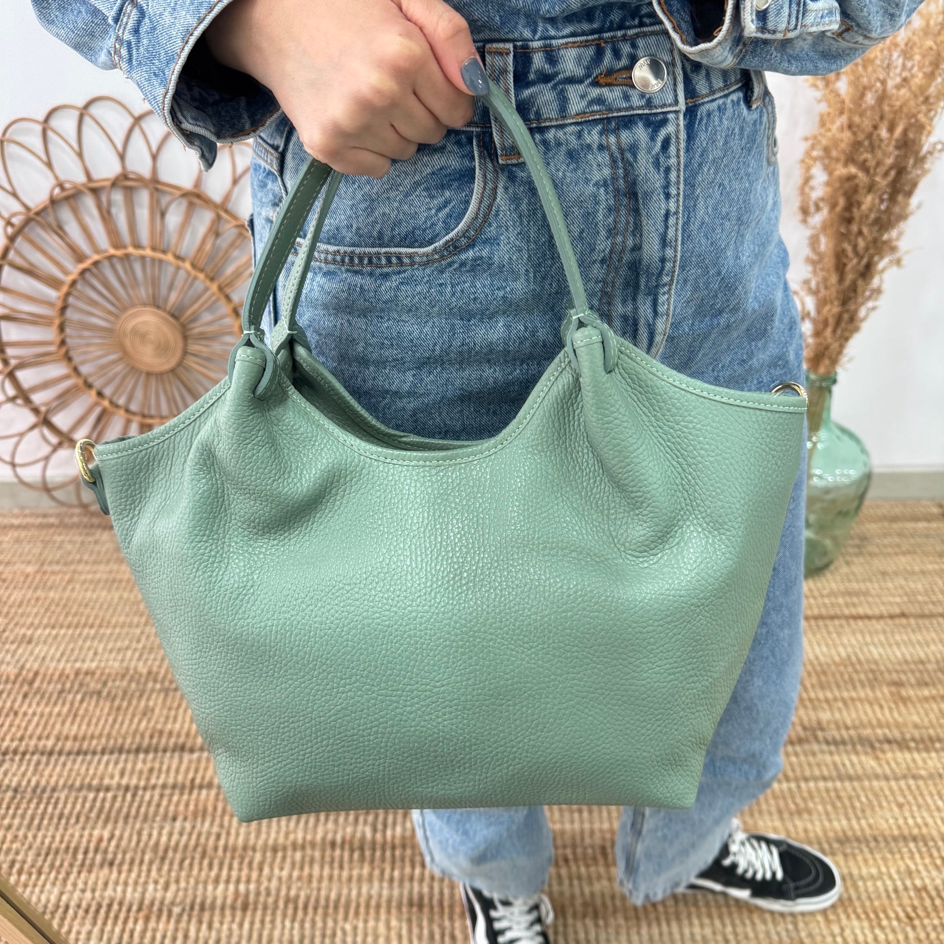 Nuestro bolso con asas de piel en color mint.