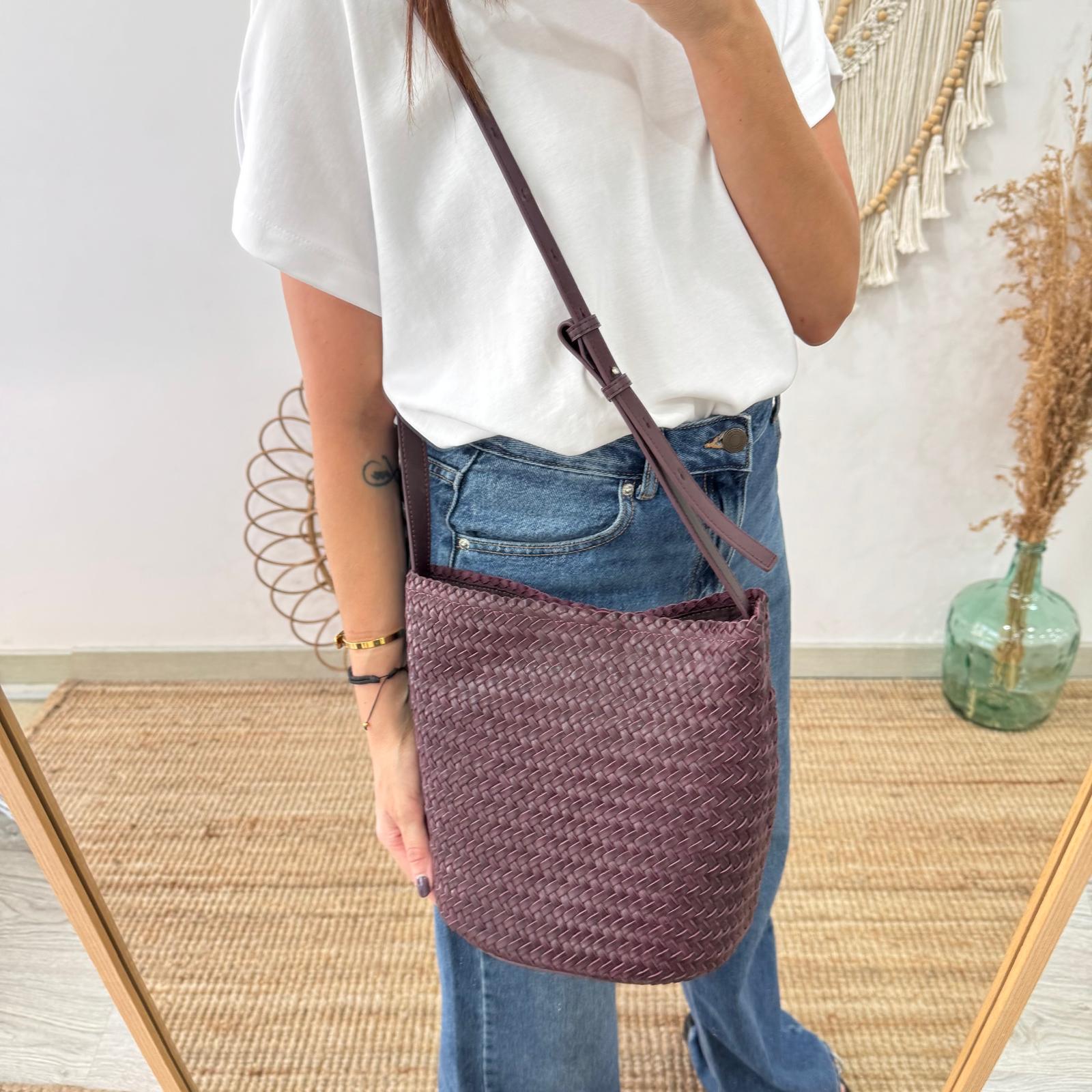 Bolso saco en piel trenzada burdeos