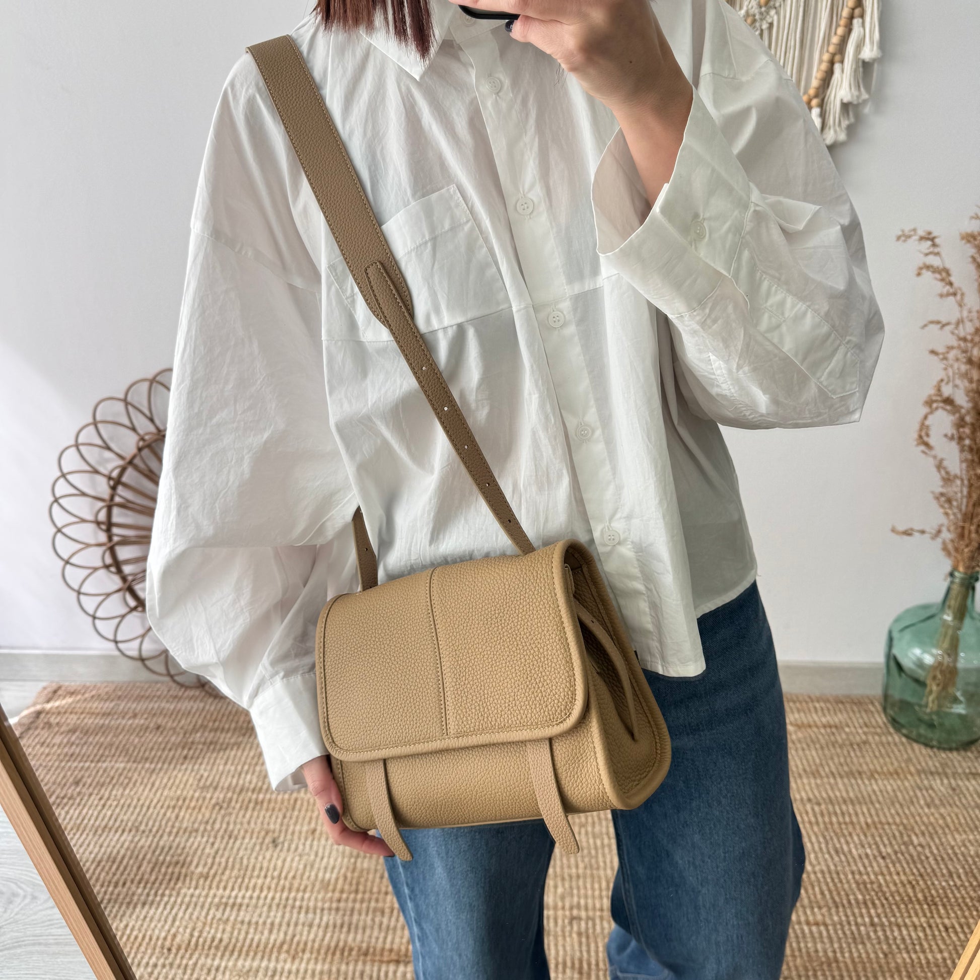 Este bolso bandolera en piel taupe ofrece un equilibrio perfecto entre el gris y el marrón, logrando un tono sofisticado y moderno. Es la elección ideal para quienes buscan una alternativa al negro con un aire más contemporáneo, refinado y fácil de combinar en cualquier estación.