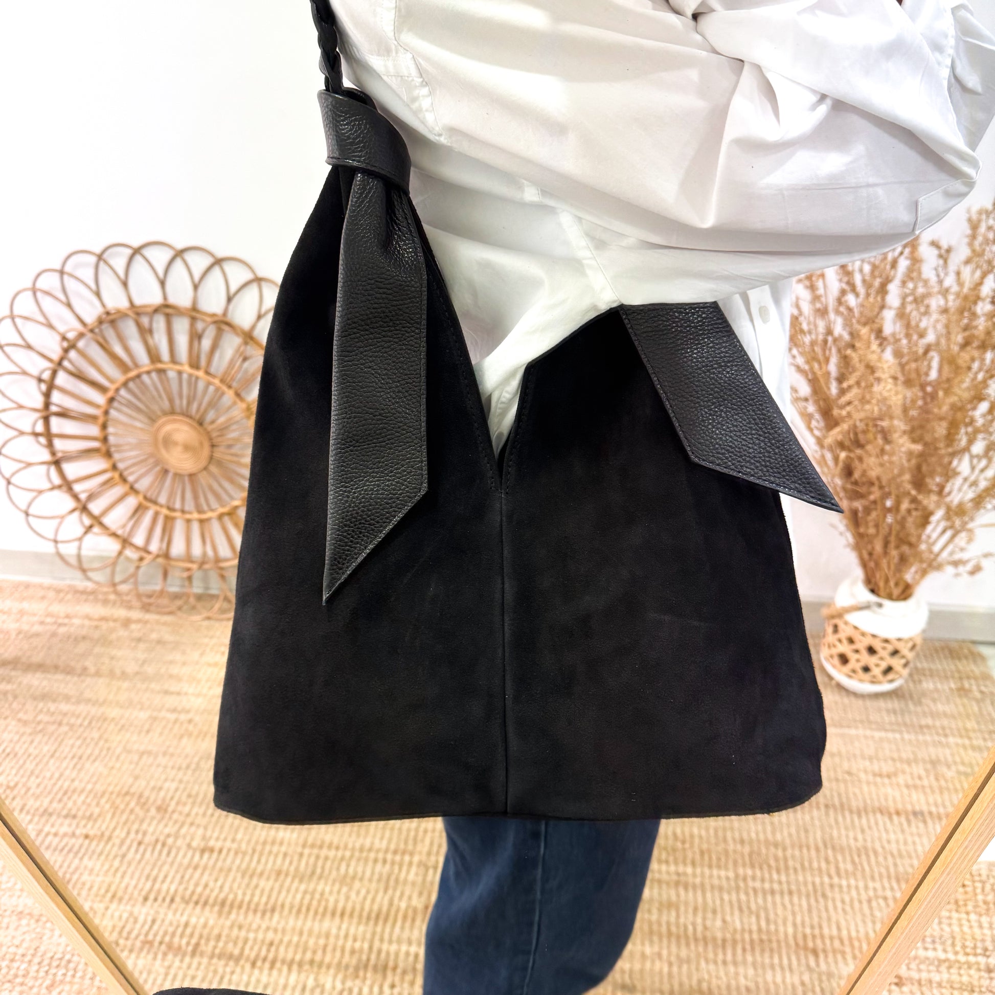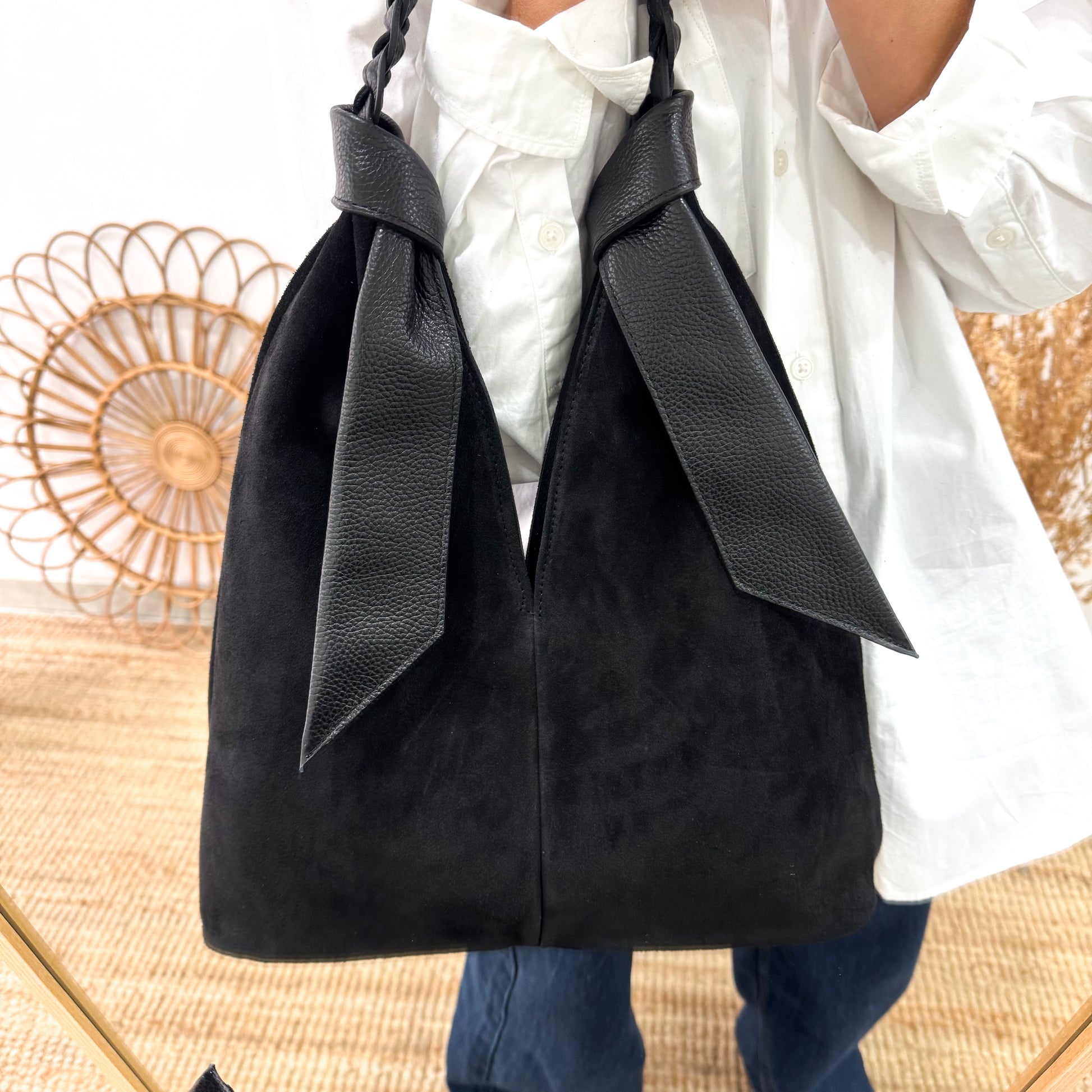 Nuestro bolso de serraje con asa trenza en piel de color negro para llevarlo con mucho estilo.