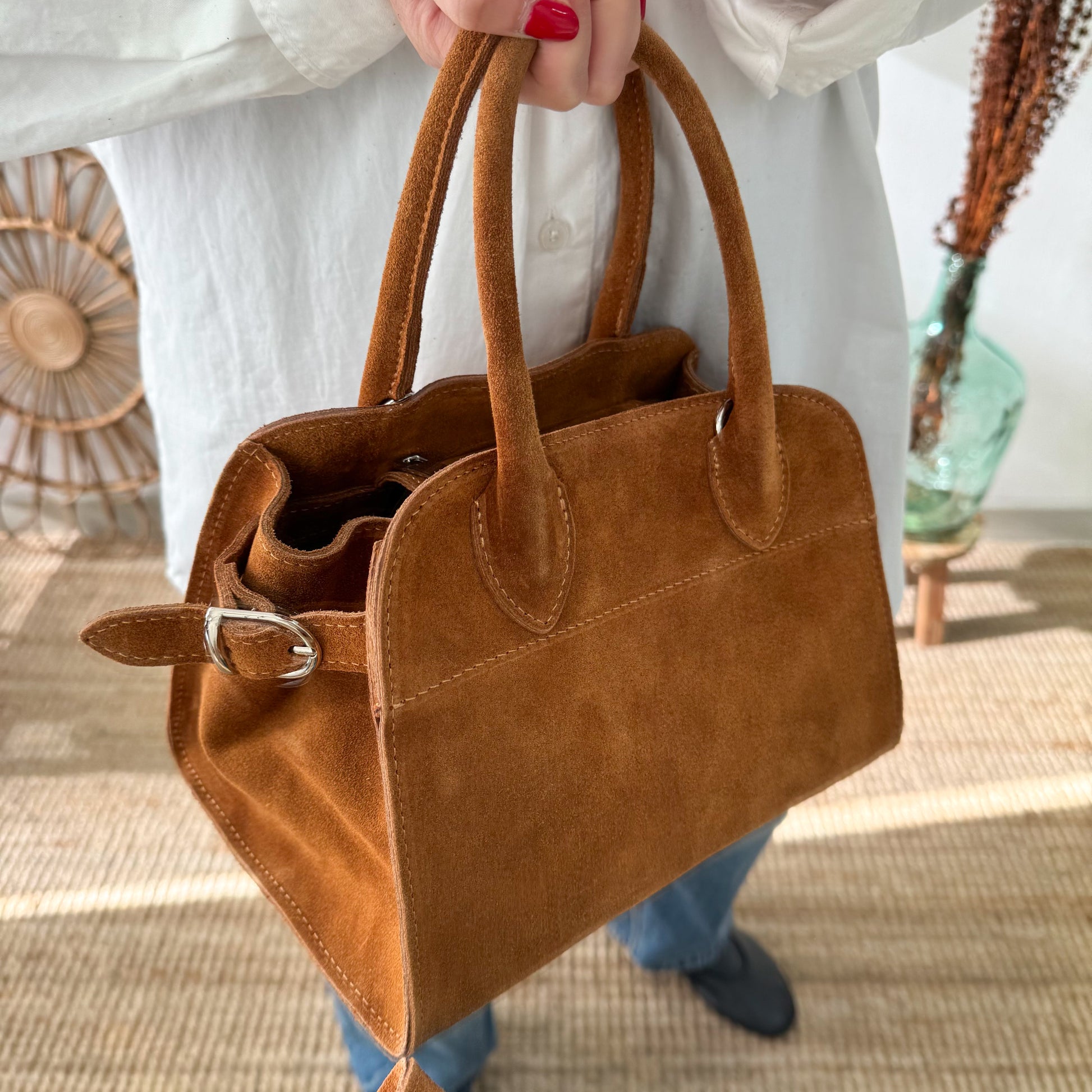 Nuestro bolso shopper con asas de mano en serraje de color camel para llevarlo con estilo. Hermano pequeño de nuestro shopper hebillas serraje.
