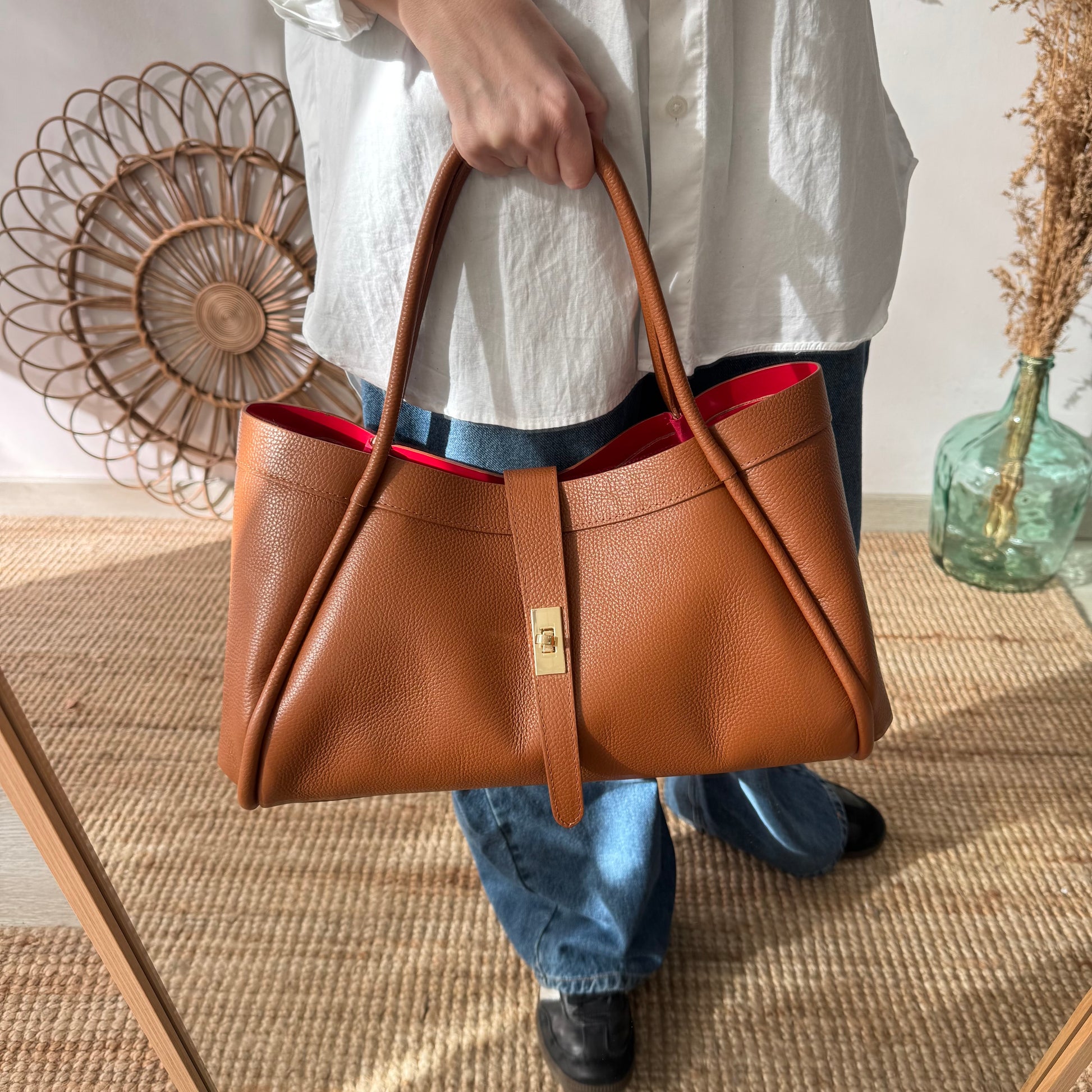 Con líneas limpias y sofisticadas, este bolso tipo tote estructurado está confeccionado en piel graneada color camel. Su forma firme mantiene la elegancia incluso cuando está lleno, aportando un aire clásico y refinado. -