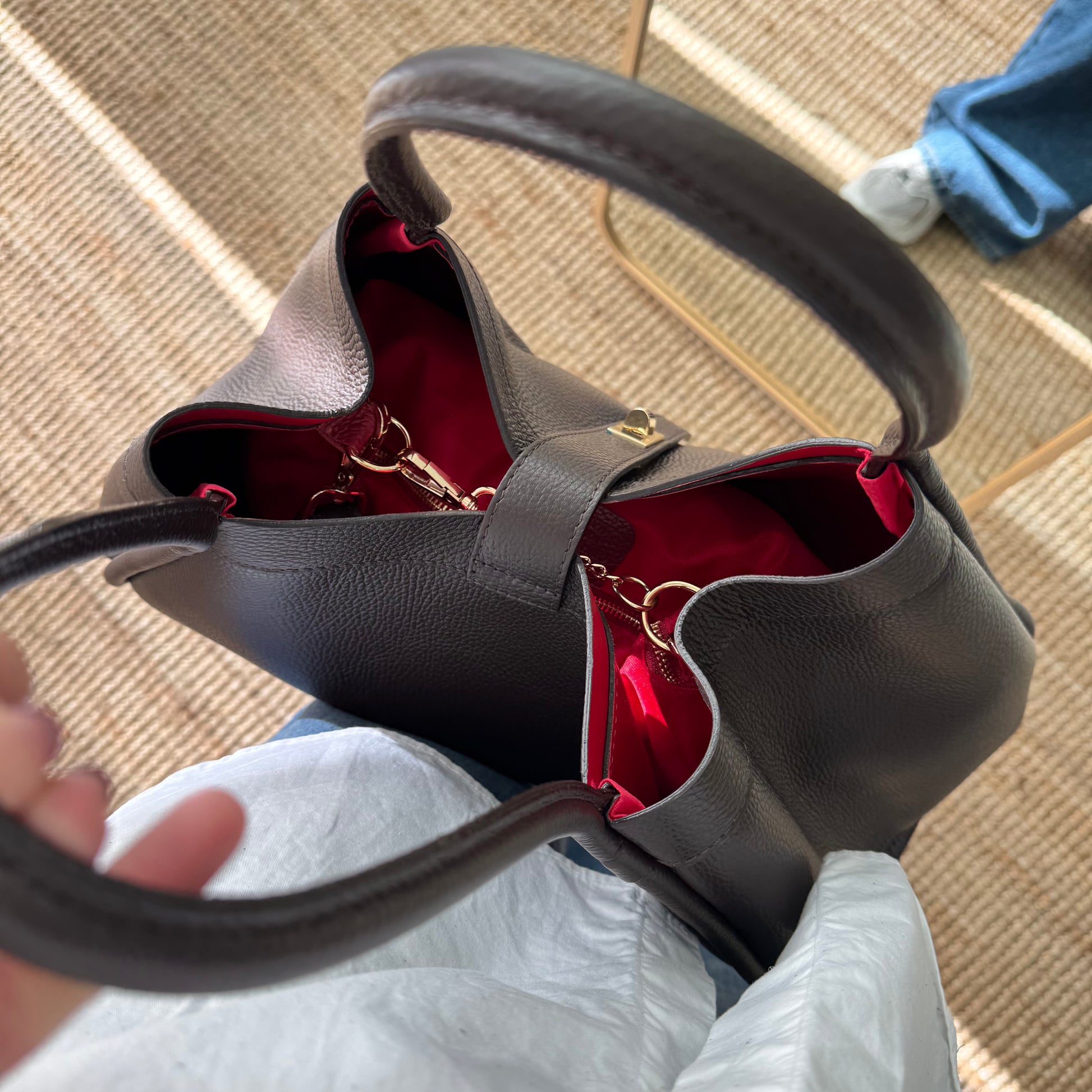 Un diseño atemporal que combina elegancia y funcionalidad. Su silueta estructurada y su interior rojo hacen de este bolso una pieza icónica para acompañarte en cualquier ocasión.