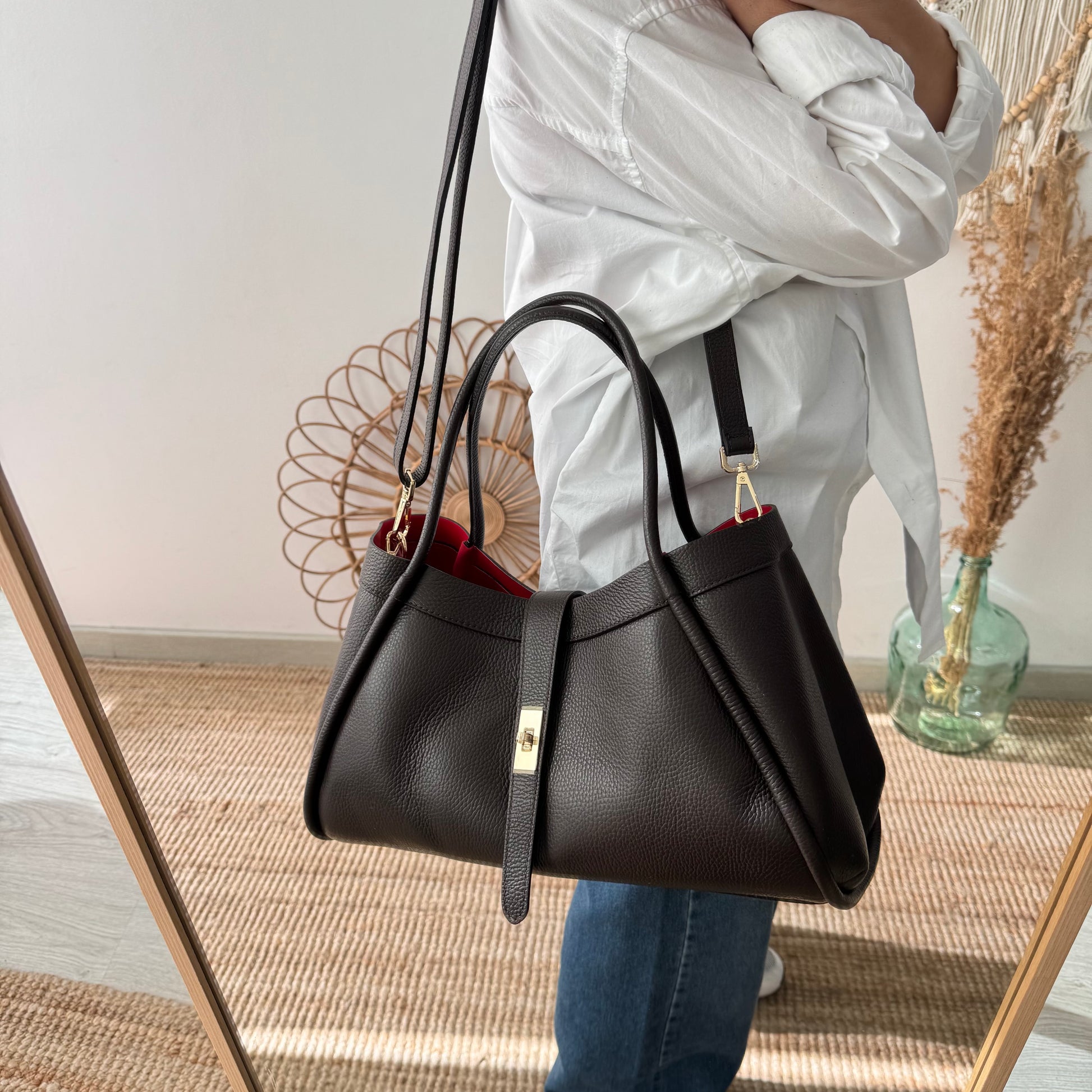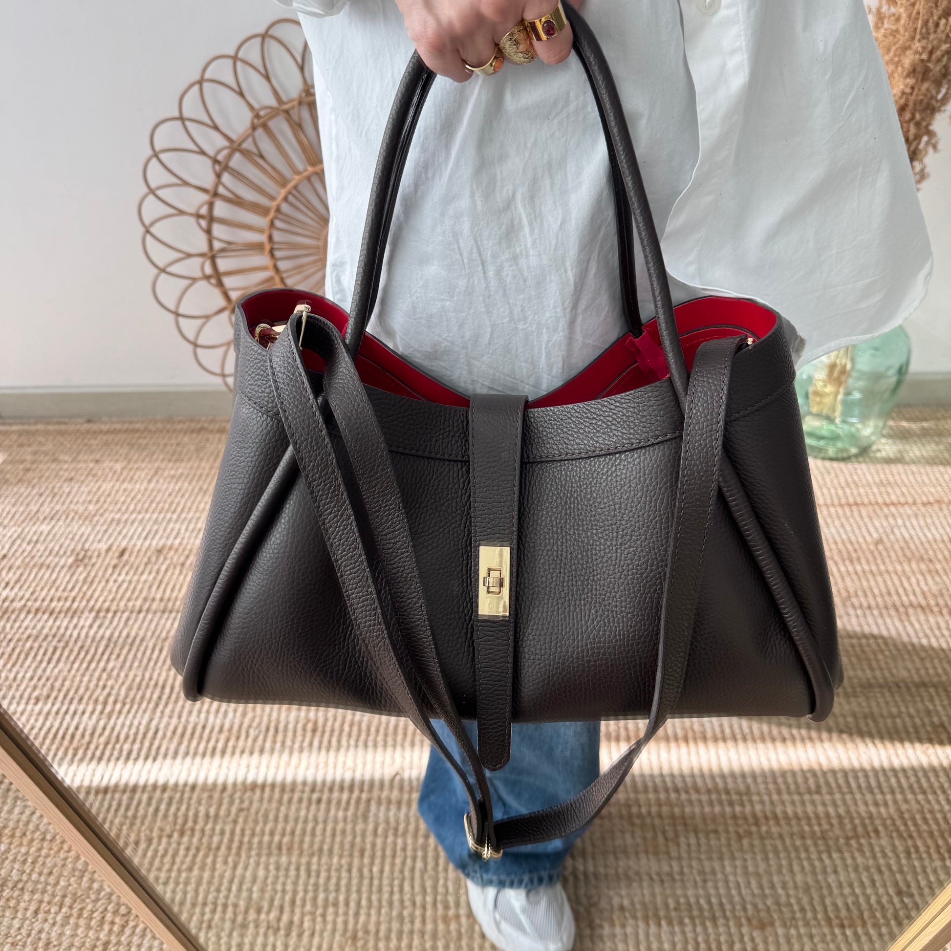 Con líneas limpias y sofisticadas, este bolso tipo tote estructurado está confeccionado en piel graneada color marrón chocolate. Su forma firme mantiene la elegancia incluso cuando está lleno, aportando un aire clásico y refinado. -
