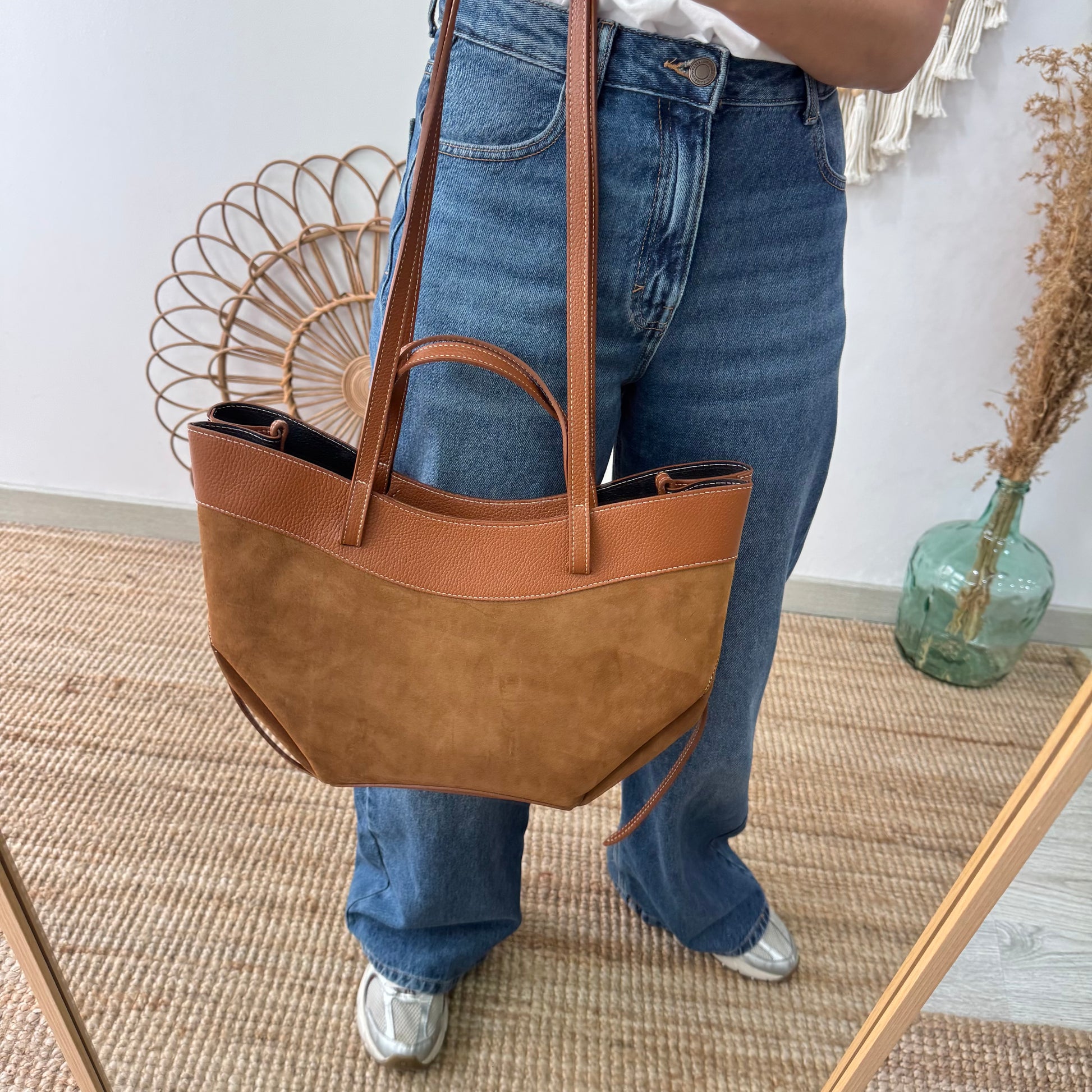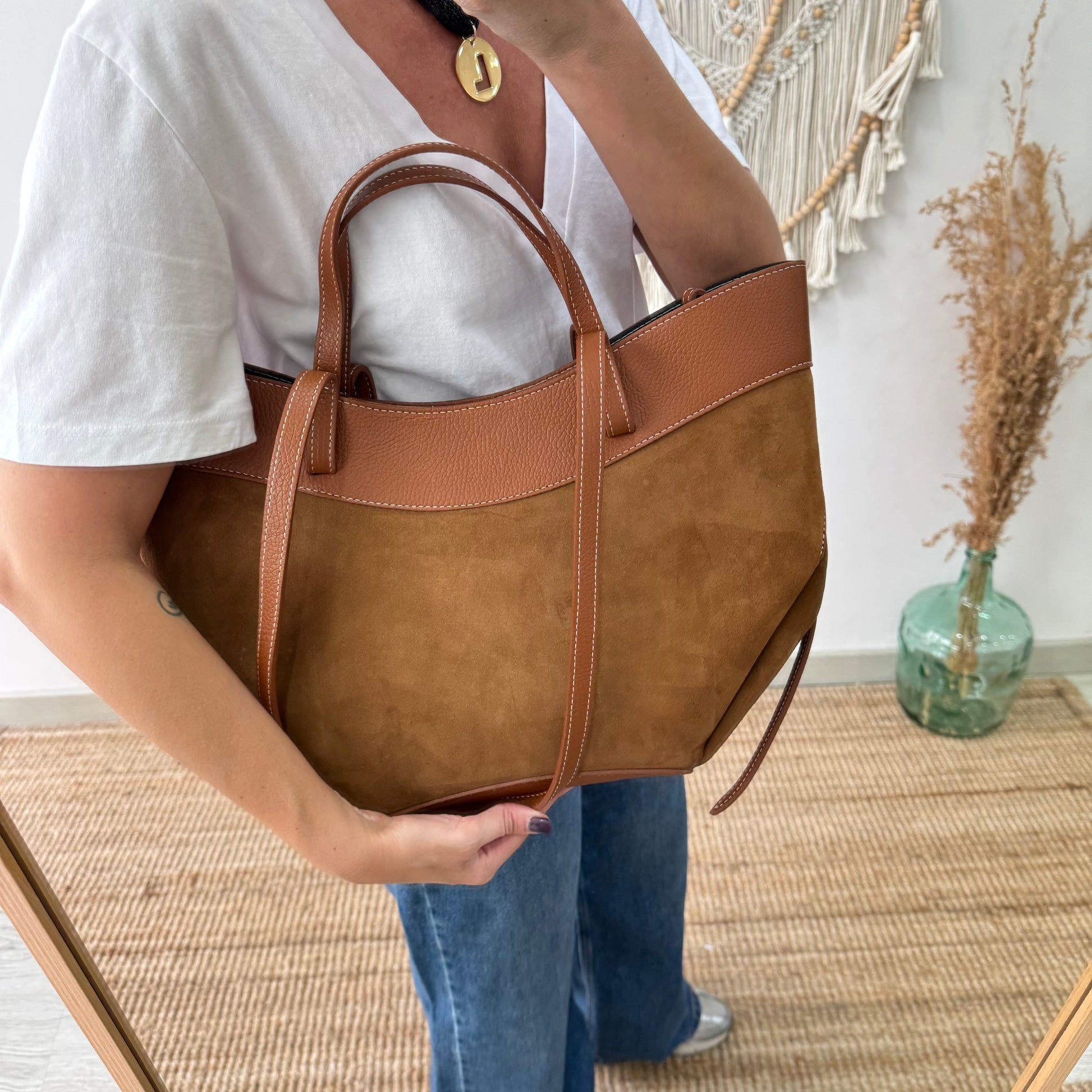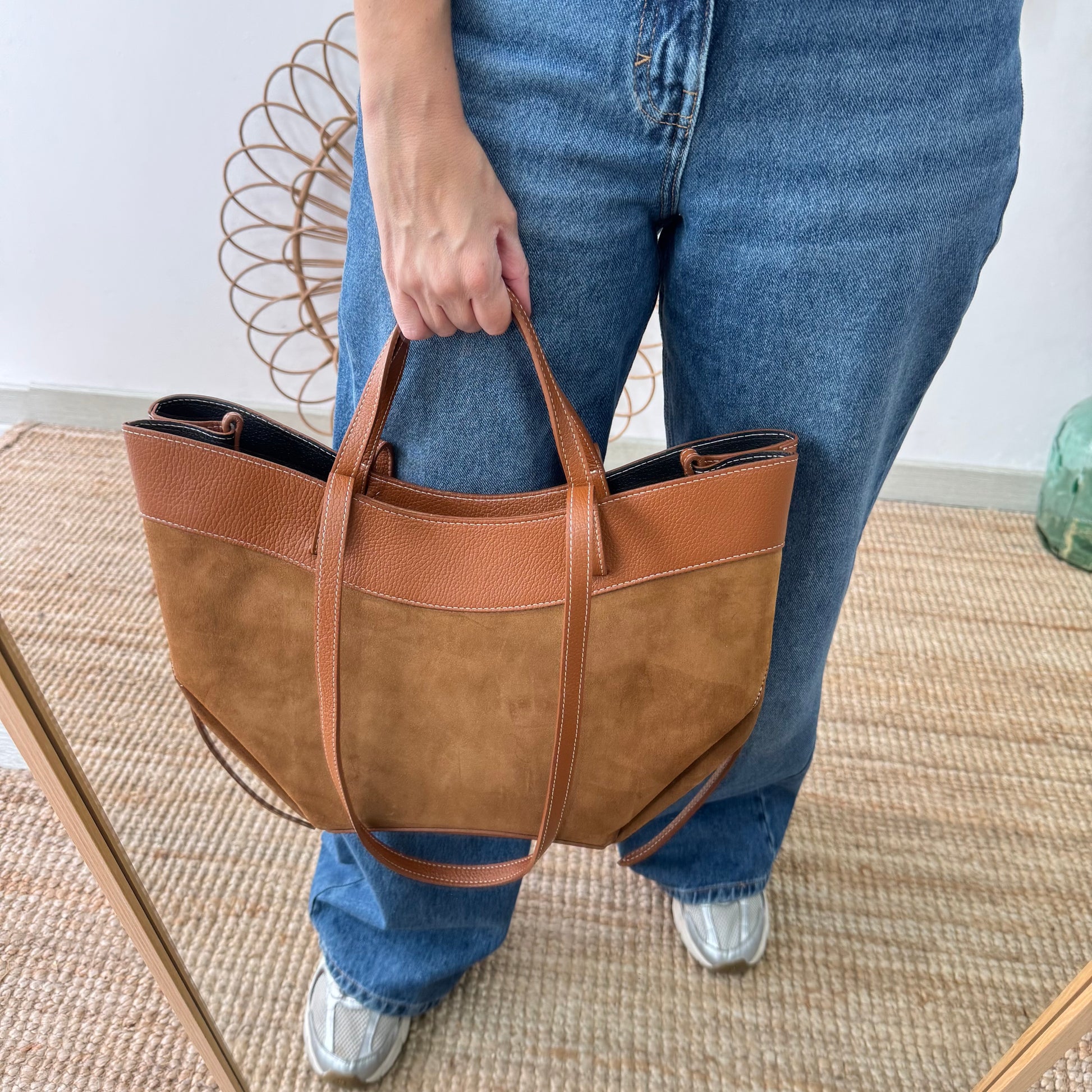 El Tote en piel y serraje camel es un bolso que combina diseño atemporal y practicidad, pensado para acompañarte en cualquier ocasión con un toque de elegancia.