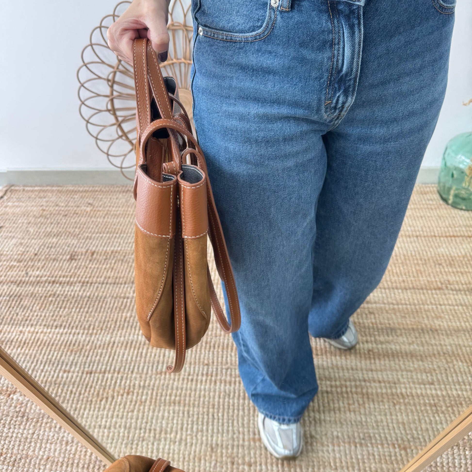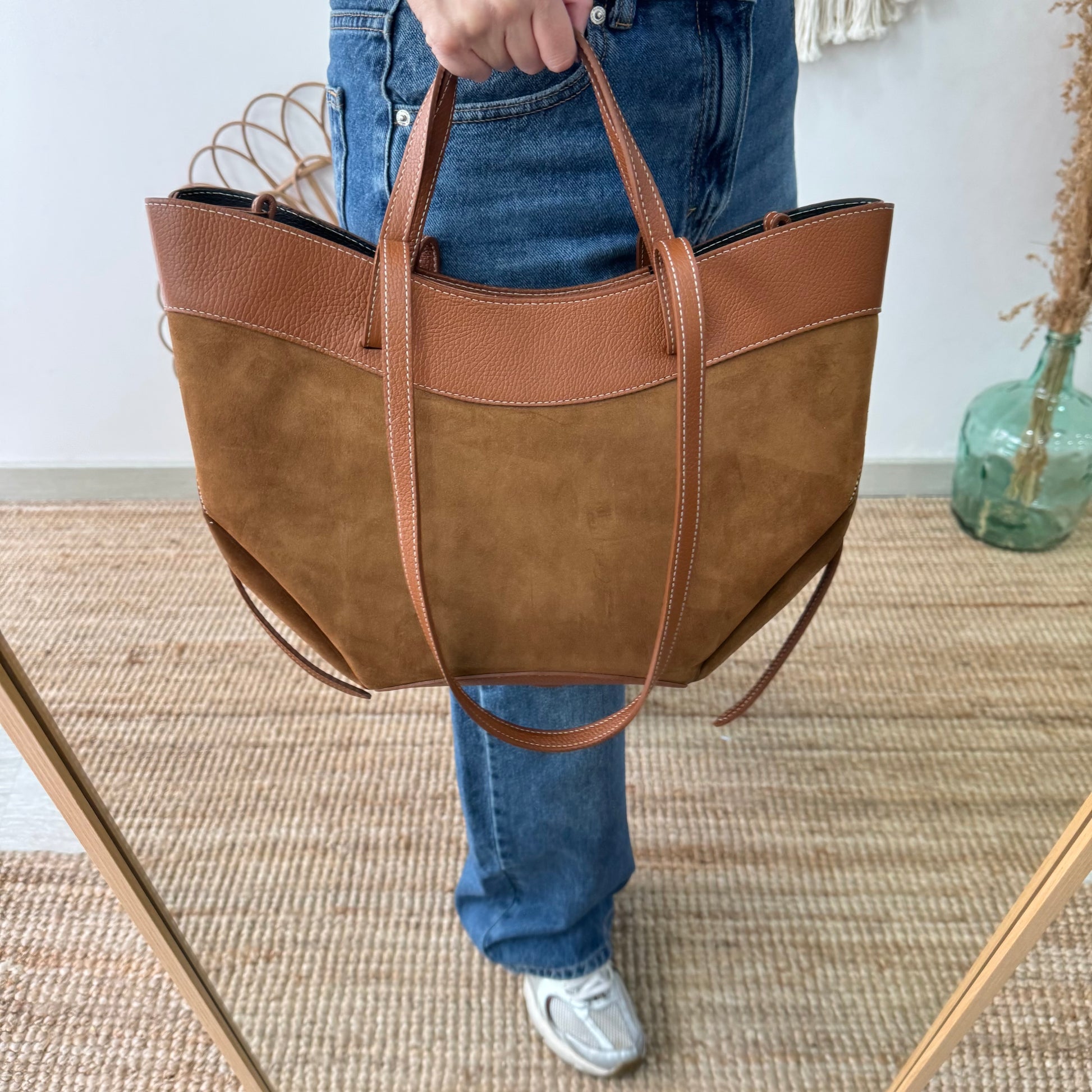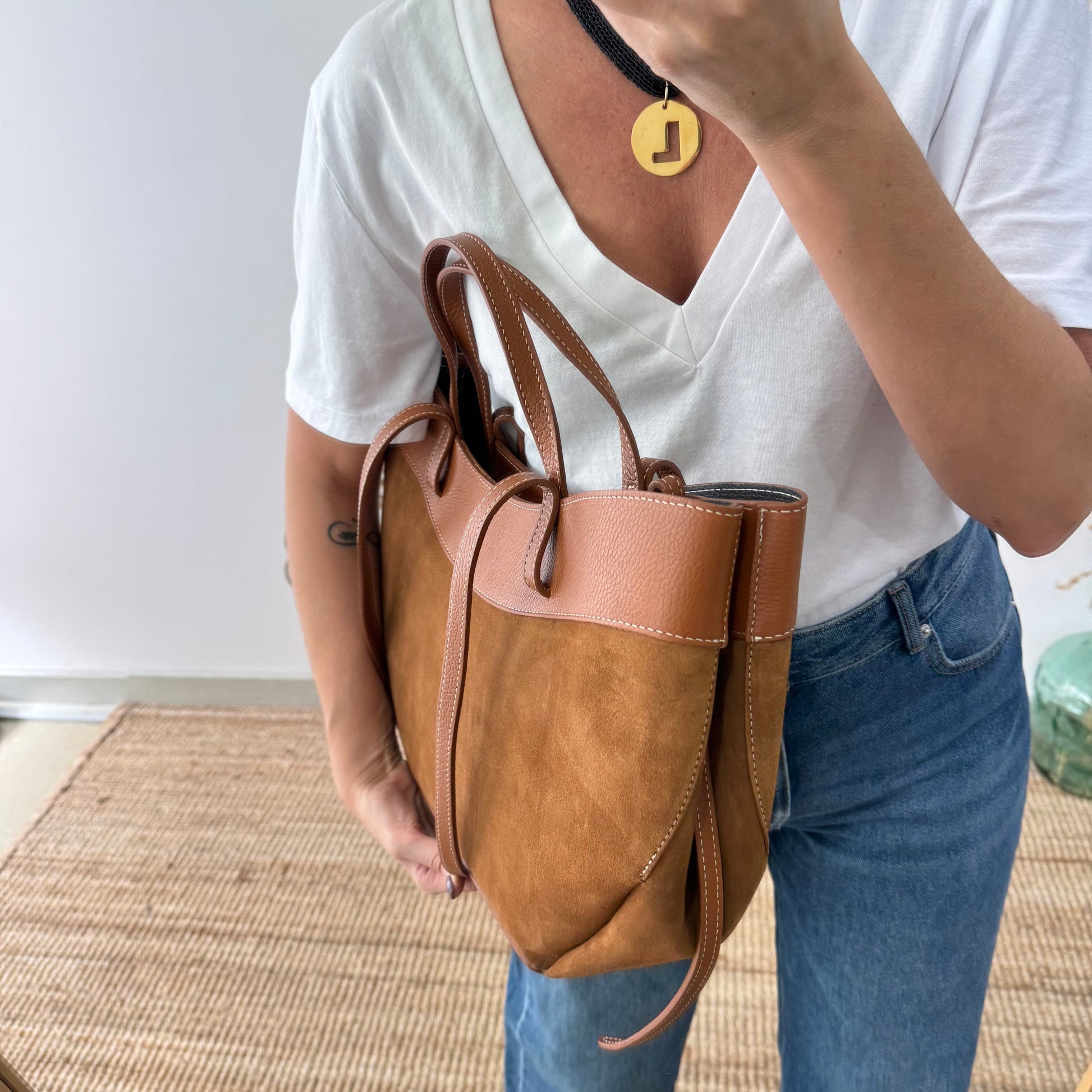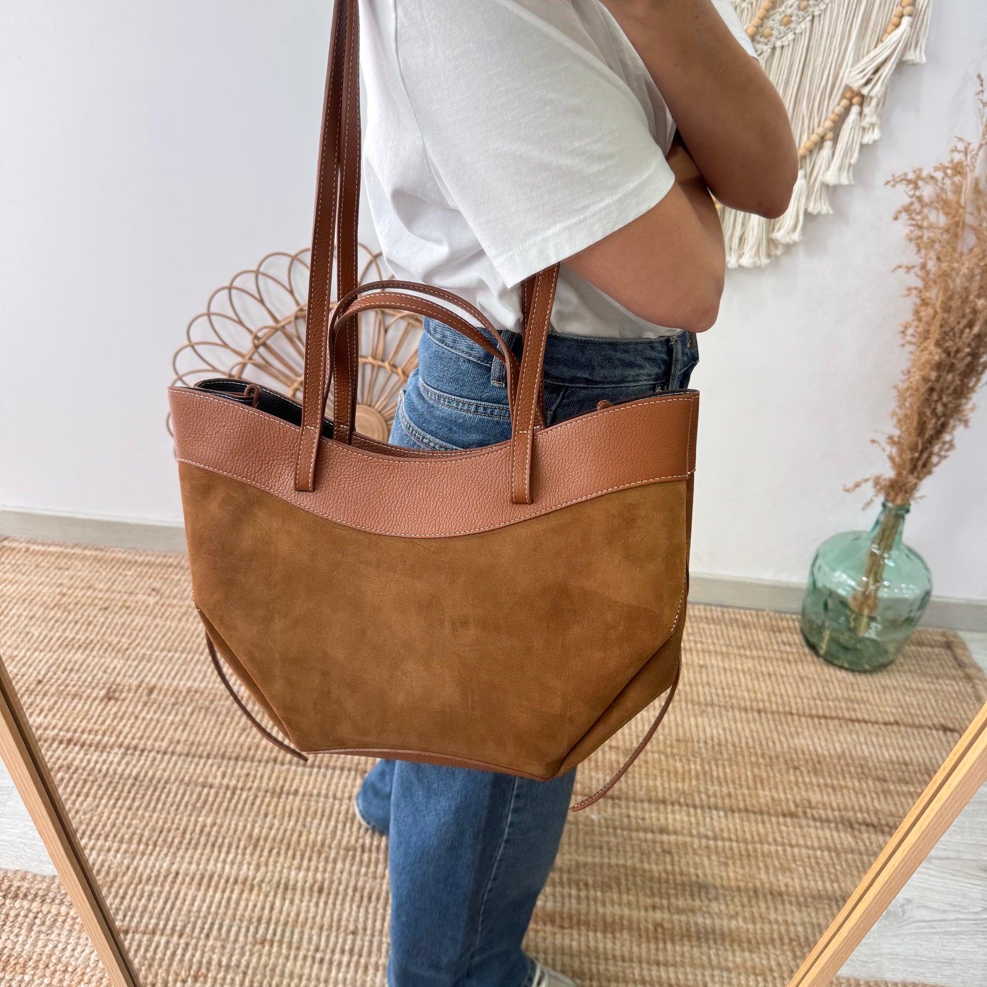 El Tote en piel y serraje camel es un bolso que combina diseño atemporal y practicidad, pensado para acompañarte en cualquier ocasión con un toque de elegancia.