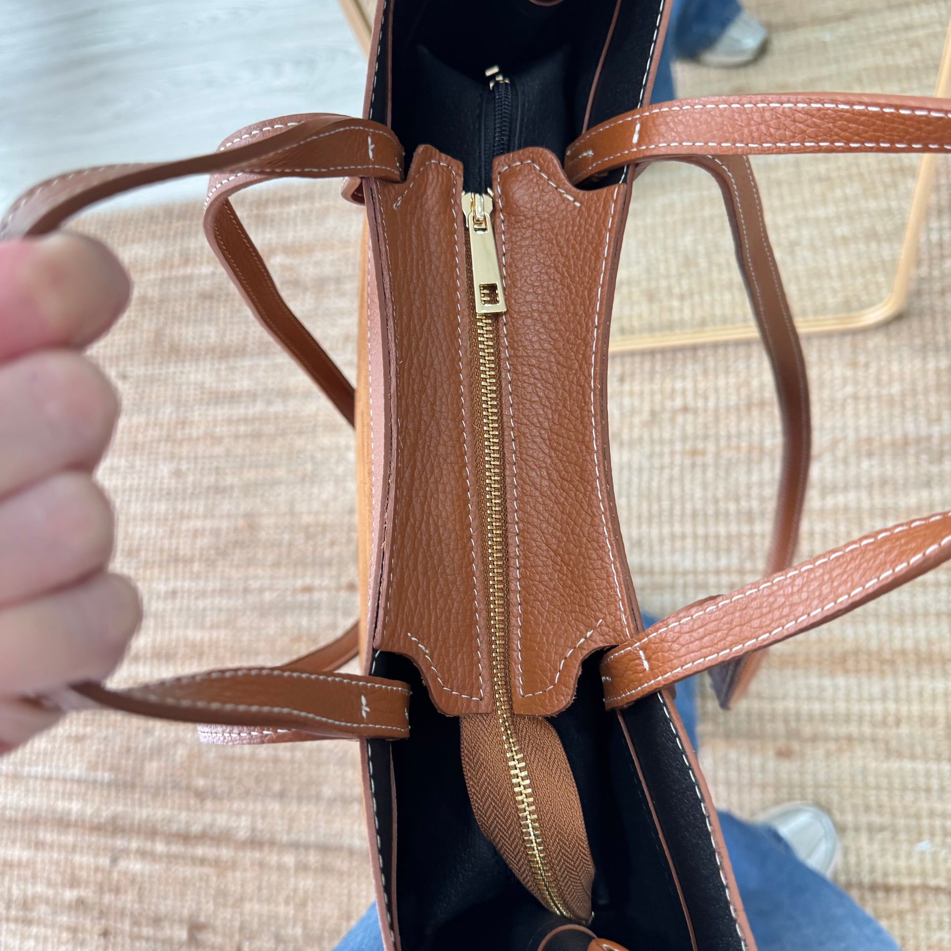 La saca es muy grande y estilosa , me encanta el serraje marrón chocolate , compré la corrrea de cebra también y queda súper bonita , calidad precio genial . Súper contenta !!