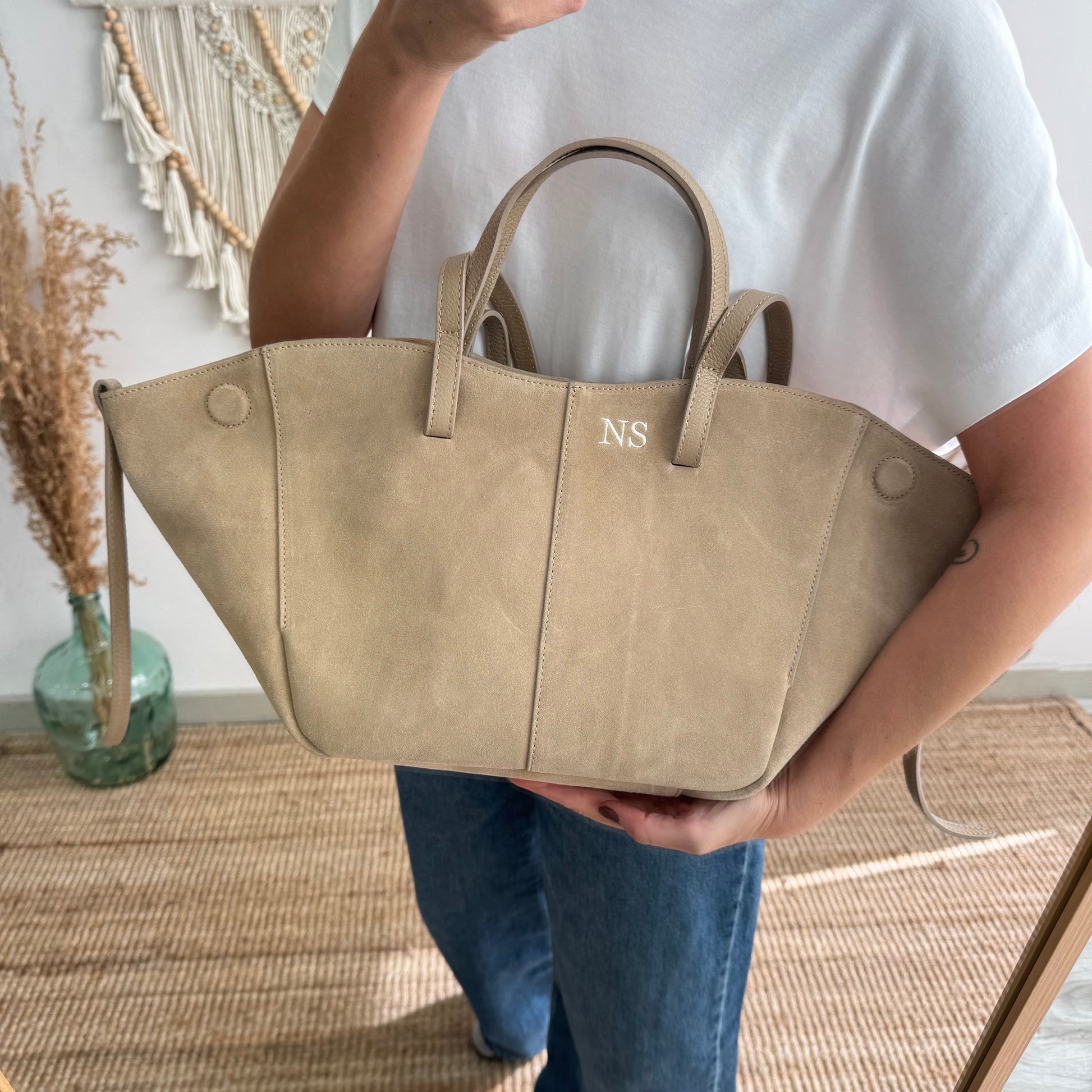 Nuestro bolso tote de serraje en color taupe para llevarlo con mucho estilo.