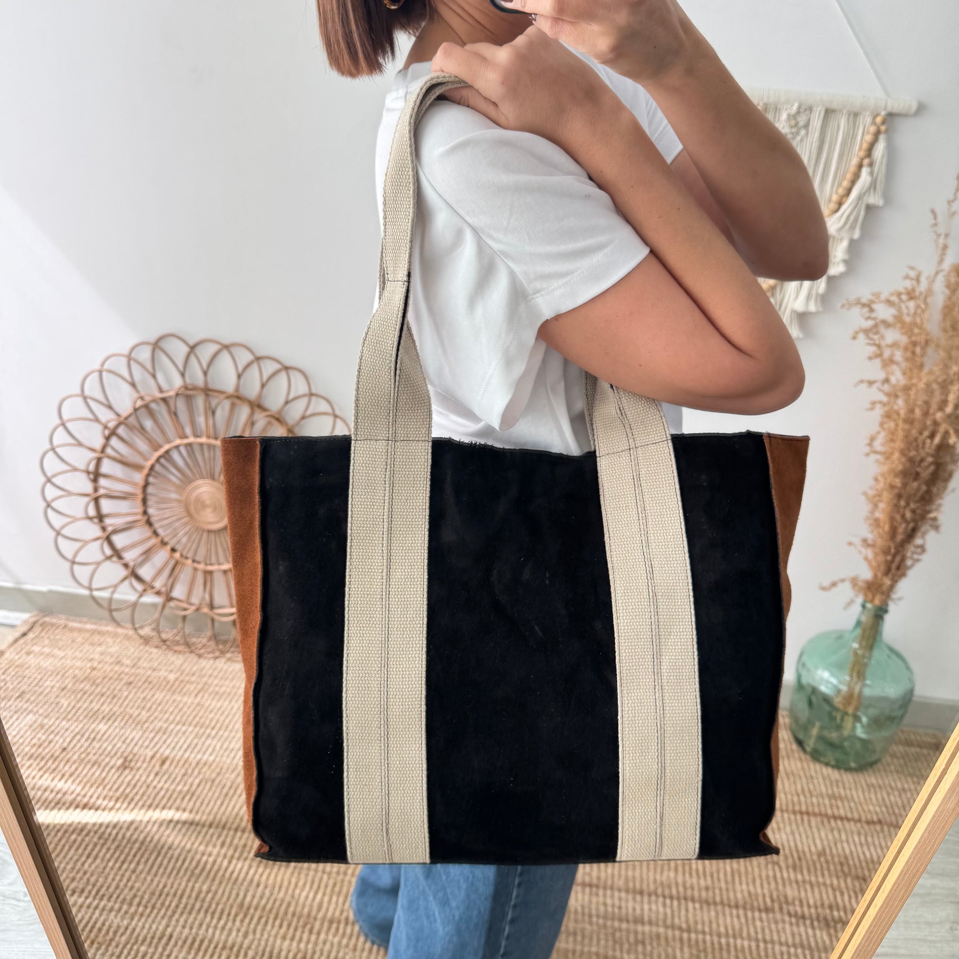 Materiales: Confeccionado con serraje para el cuerpo y resistentes asas de lona para un transporte cómodo. La combinación de estos materiales crea un contraste único y un estilo versátil que se adapta a cualquier ocasión.